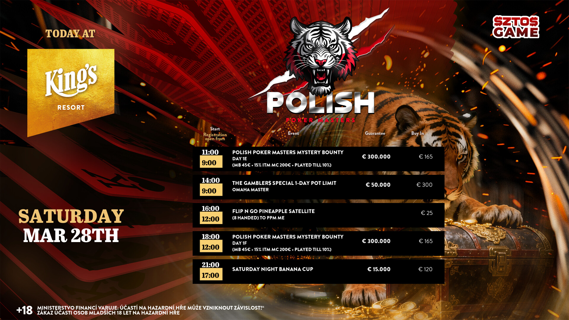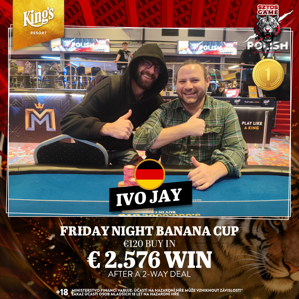 Heute geht es mit Tag 1E beim € 120 + 45 Polish Poker Masters Mystery Bounty (€ 300.000 GTD inkl. 10 x € 3k King’s Million EPC Packages) schon früh mit 75.000 Chips und 40 Minuten Levels an die Tische, am Abend folgt Tag 1F mit 30 Minuten Levels. Als Side Events warten das € 300 The Gambler$ Special 1 Day PLO (€ 50.000 GTD/50k/30′) und der € 120 Banana Cup (€ 15.000 GTD/15k/15′). Die Cash Games starten wie immer ab den Blinds € 1/2 NLH bzw. € 2/2 PLO. Alle Informationen zum kompletten Angebot findet Ihr unter kings-resort.com.