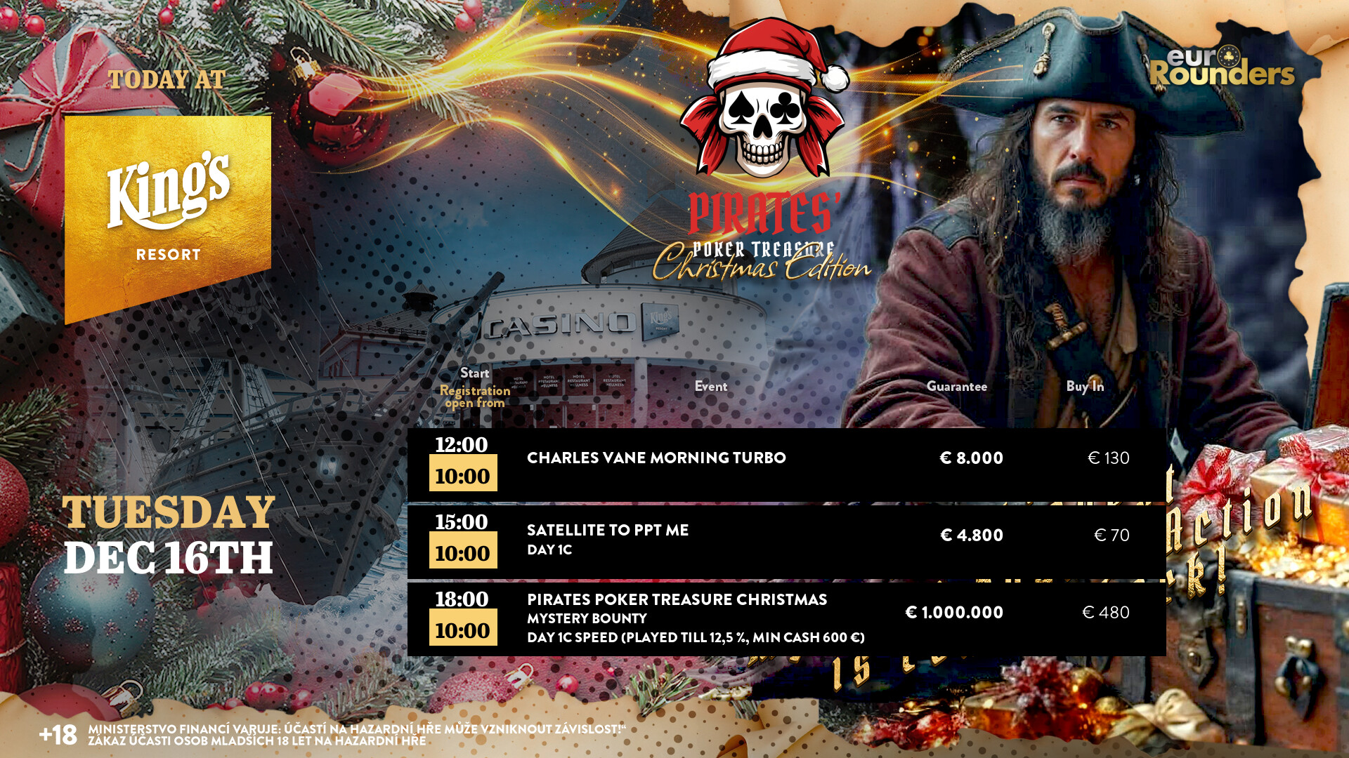 Es war ein sehr ruhiger Montag beim € 330 + 150 Pirates Poker Treasure Mystery Bounty der Eurorounders (€ 1.000.000 GTD inkl. 10 x € 3k King’s Million EPC Packages) gestern, den 15. Dezember, im King’s Resort Rozvadov. Drei Spieler konnten sich für Tag 2 am Sonntag qualifizieren.