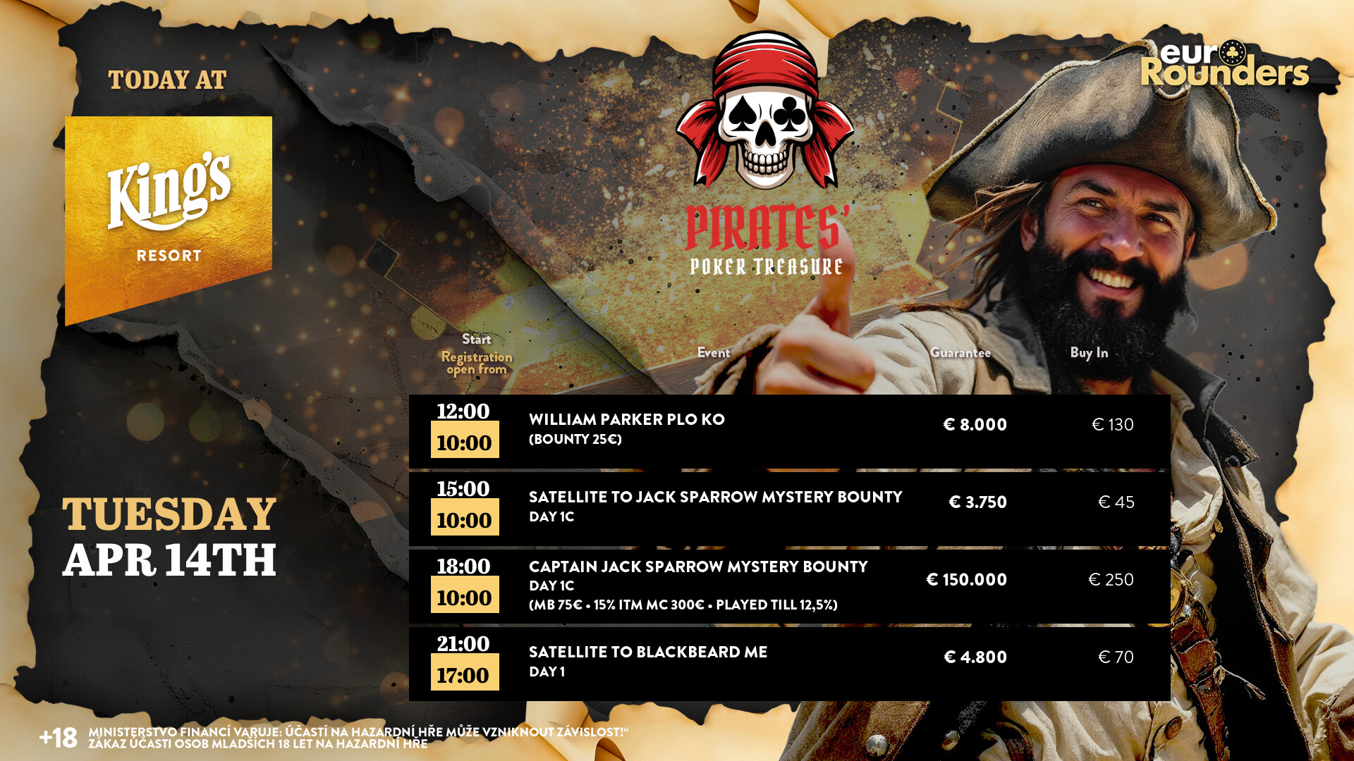 Es ist noch recht ruhig im King’s, auch wenn man für das Wochenende wieder den großen Ansturm erwarten darf. Gestern, den 13. April, ging es mit 50.000 Chips und 30 Minuten Levels in den zweiten Flight beim Captain Jack Sparrow Mystery Bounty, zu dem sich 65 Spieler einfanden. Mit weiteren 35 Re-Entries waren es runde 100 Entries, insgesamt steht man bei 162 Entries – und da ist dann doch noch reichlich Luft zur € 150.000 Preisgeldgarantie.