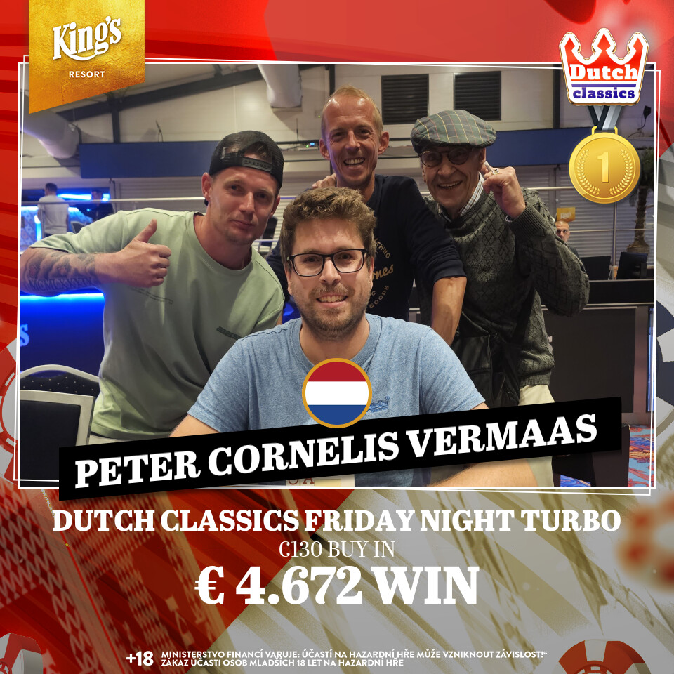 Mit den letzten beiden langsamen Flights geht es heute bei den € 250 Dutch Classics (€ 400.000 GTD inkl. 4 x € 10.350 WSOPE Main Event Tickets/50k/40′ bzw. 30′) weiter, dazu kommen das € 120 Omaha (€ 8.000 GTD/20k/15′) und das € 130 Saturday Night Turbo (€ 10.000 GTD/15k/15′). Die Cash Games werden wie immer ab den Blinds € 1/2 NLH bzw. € 2/2 PLO angeboten. Alle Infos zum kompletten Angebot findet Ihr unter kings-resort.com.