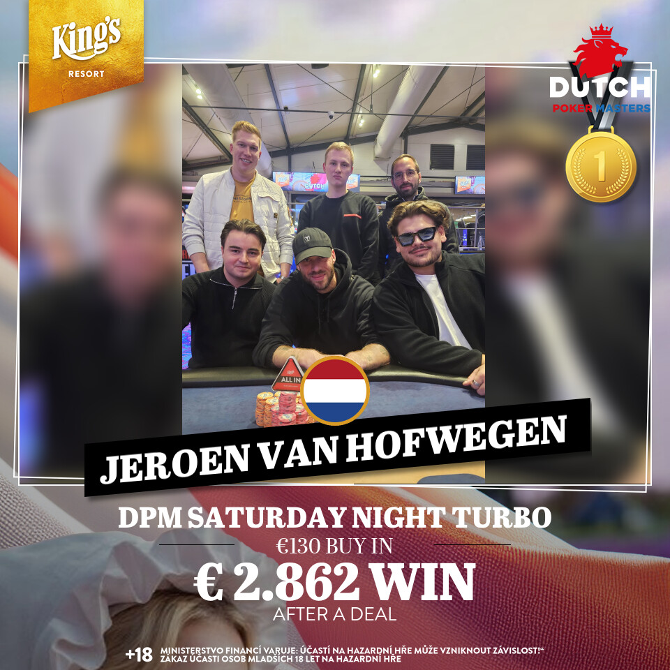 Am Abend sorgte noch das € 130 Saturday Night Turbo für Abwechslung. mit 15.000 Chips und 15 Minuten Levels wurde um mindestens € 10.000 gespielt. 136 Starter sorgten mit ihren 35 Re-Entries dafür, dass nach Abzug der 16 % Fee e 18.673 im Pot landeten. Die ersten 23 Plätze waren bezahlt, schon bei sieben verbliebenen Spielern kam es zu einem Deal. Offizieller Sieger wurde Jeroen Van Hofwegen für € 2.862, Malizo kassierte als bester Deutscher für Rang 2 € 2.053.