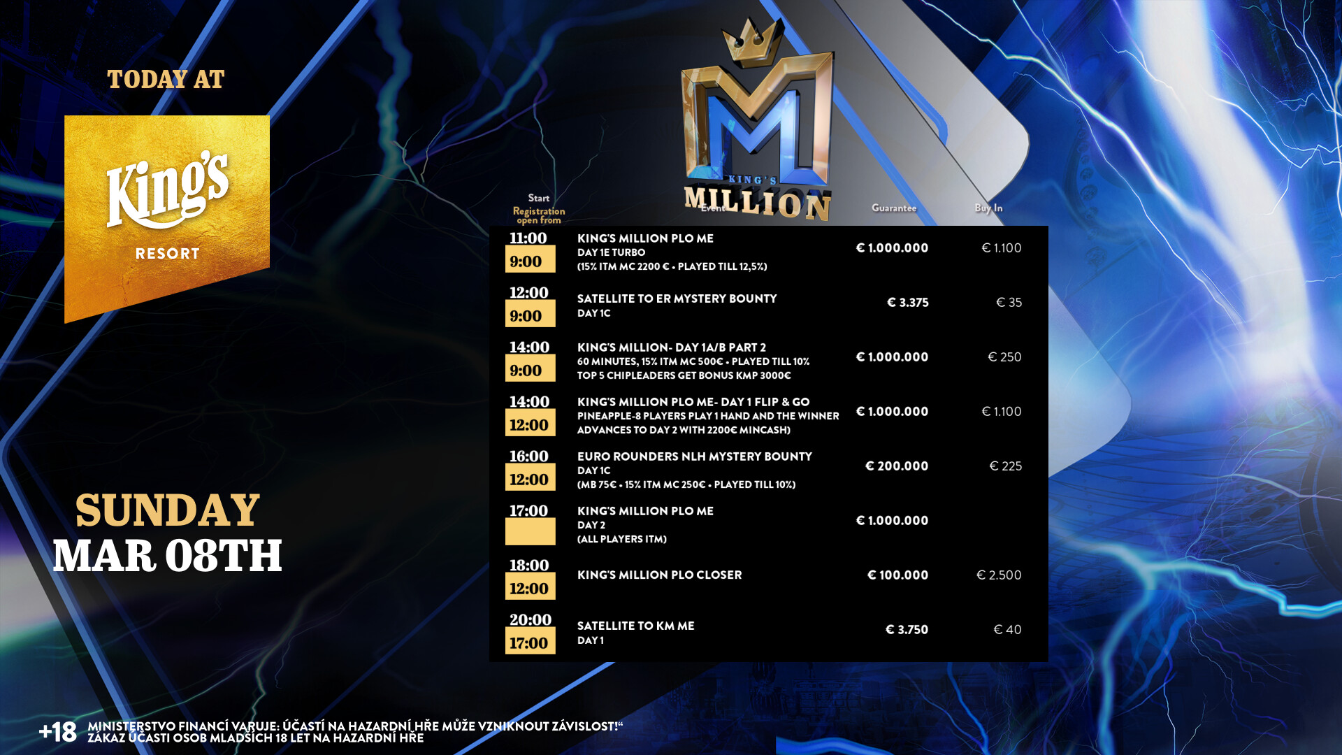 Gestern, den 7. März, gab es Tag 1B bei der € 250 King’s Million NLH (€ 1.000.000 GTD inkl. 15 x € 3k King’s Million EPC Packages) im King’s Resort Rozvadov, heute ist die Late Reg auch an Tag 1AB noch für ein Level offen.