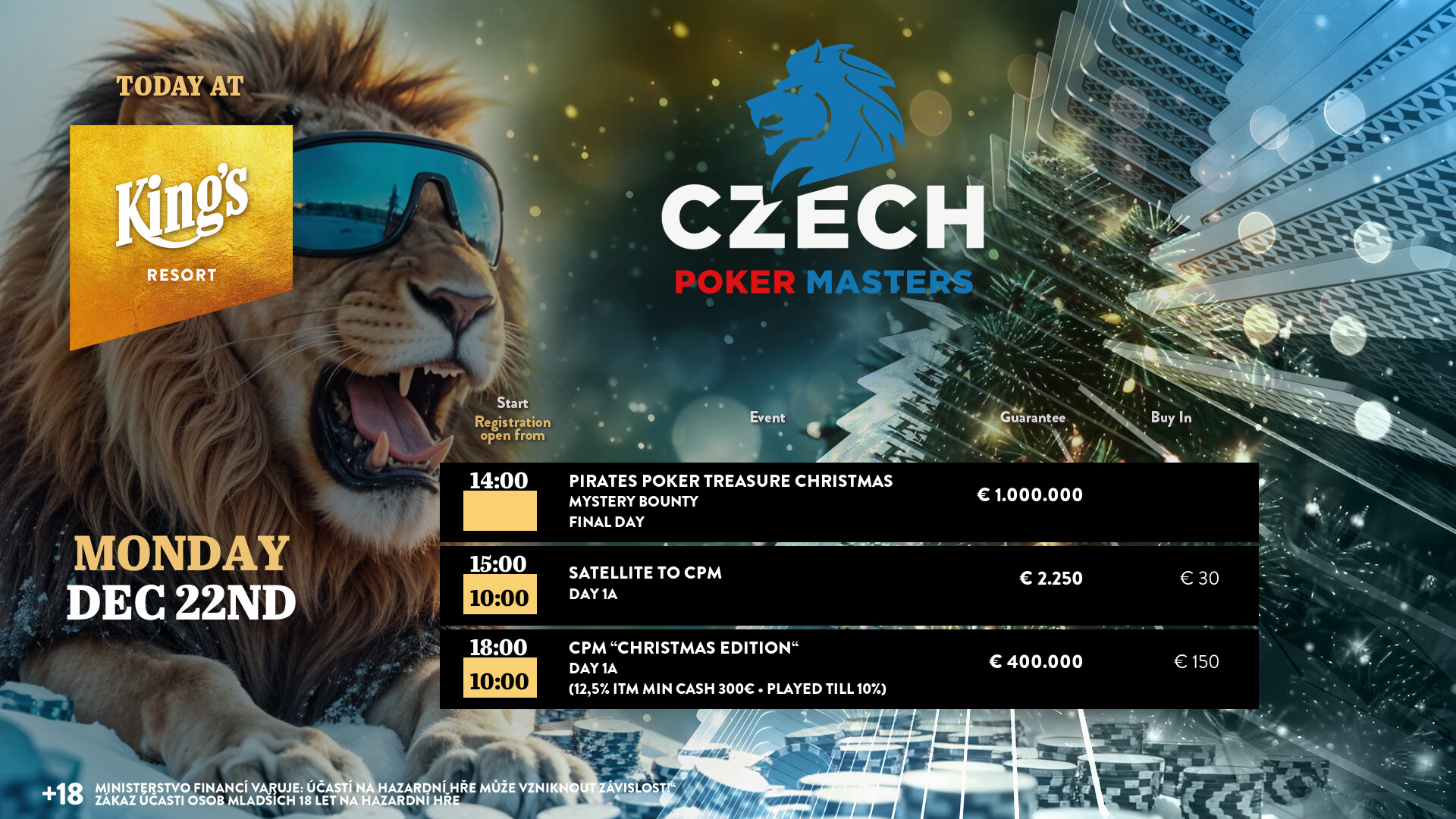 Während der Sieger gesucht wird, startet um 18 Uhr dann auch bereits das letzte Festival des Abends. Beim € 150 Czech Poker Masters Christmas Edition warten € 400.000 Preisgeld (inkl. 10 x € 3k King’s Million Packages), es gibt 50.000 Chips und 30 Minuten Levels. Die top 12,5 % kommen ins Geld (€ 300 Min-Cash), die top 10 % qualifizieren sich für Tag 2. Die Cash Games starten wie gewohnt ab den Blinds € 1/2 NLH bzw. € 2/2 PLO. Alle Infos zum kompletten Angebot findet Ihr unter kings-resort.com.
