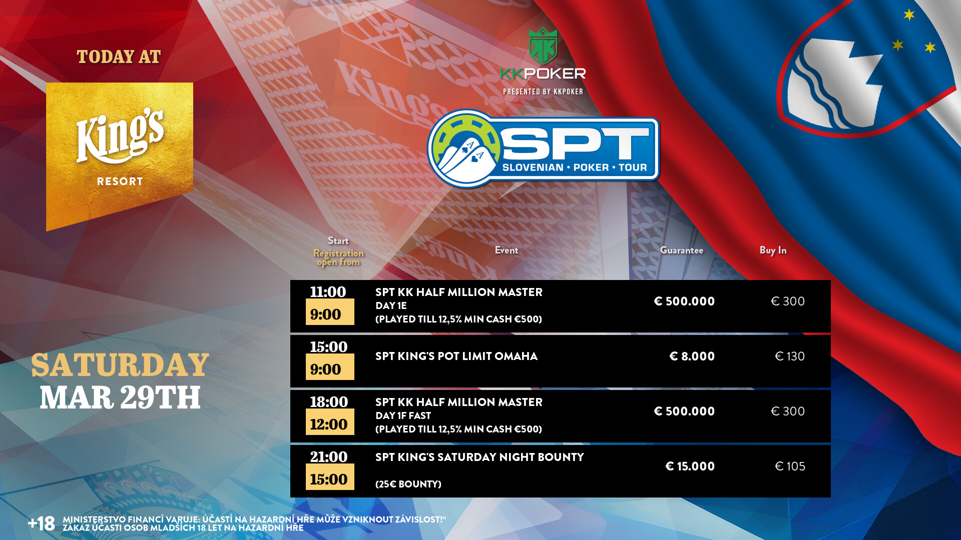 Gleich drei Startmöglichkeiten gab es gestern, den 28. März, beim € 300 KK Half Million Master der Slovenian Poker Tour (SPT) im King’s Resort Rozvadov. Stefan Alexandru Drusca ssicherte sich mit Tag 1C die klare Gesamtführung.