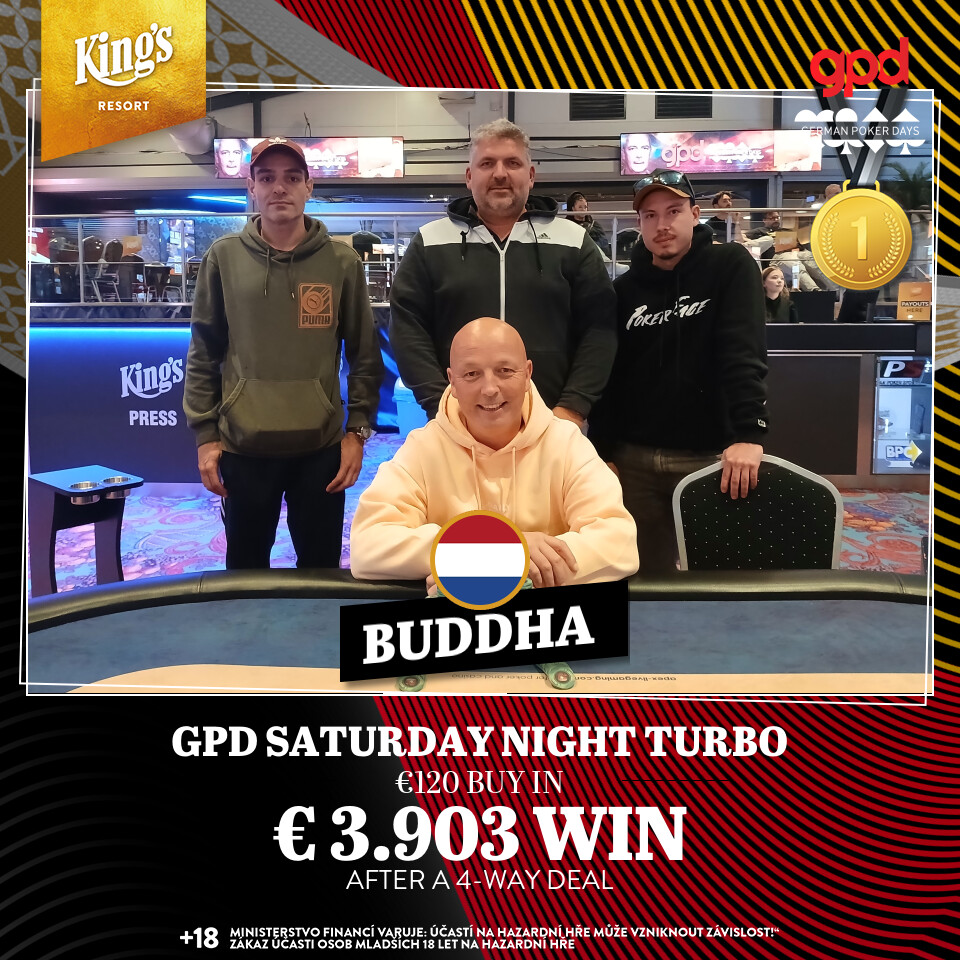 € 15.000 garantierte man am Abend beim € 120 Saturday Night Turbo. 15.000 Chips und 15 Minuten Levels waren auch hier die Konditionen, wobei man mit 161 Startern und 35 Re-Entries locker über die Garantie kam. Nach Abzug der 16 % Fee waren € 19.756 im Pot, die top 27 Plätze waren bezahlt. € 198 gab es als Min-Cash, € 4.375 warteten auf den Sieger. Auch hier kam es zu einem vorzeitigen Deal, Buddha holte den Sieg für € 3.903, Markus Schmelzle kassierte als bester Deutscher € 2.443 für Rang 3, der Schweizer Rene Gautschi nahm € 2.202 für Platz 4 mit.
