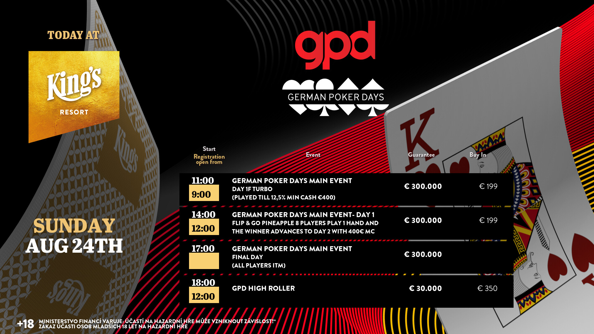 Auch gestern, den 23. August, waren die Side Events der German Poker Days im King’s Resort Rozvadov gut besucht, sowohl das € 120 Omaha als auch das € 120 Saturday Night Turbo ging mit einem Deal zu Ende.