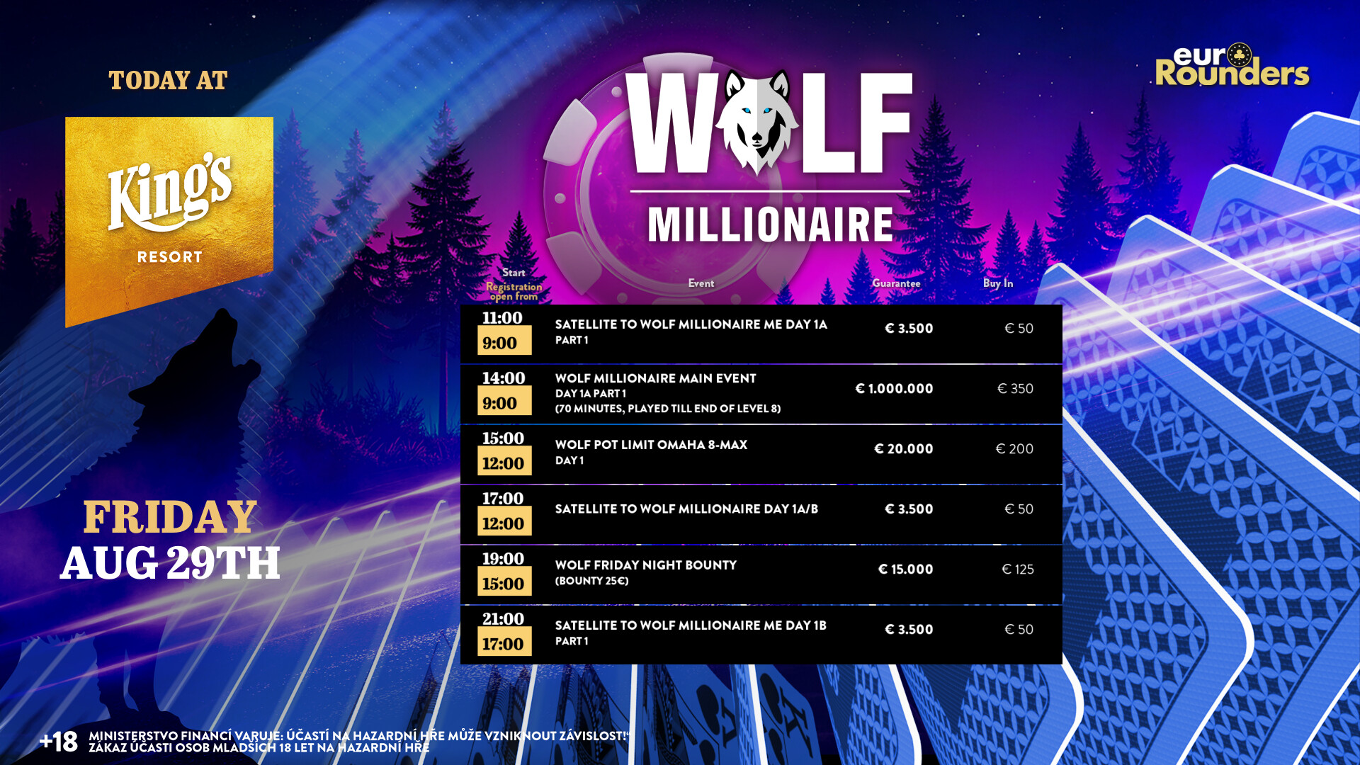 Heute wird das € 350 Wolf Millionaire Main Event (€ 1.000.000 GTD inkl. 10 x € 10.350 WSOPE Main Event Tickets) eröffnet. Es gibt Tag 1A und morgen Tag 1B, die verbliebenen Spieler gehen am Sonntag gemeinsam in Tag 1AB, wo es dann ums Geld geht. 50.000 Chips und 70 Minuten Levels sind die Konditionen, wobei an Tag 1A und 1B jeweils acht Levels gespielt werden. Die Late Reg ist bis Ende Level 10 (an Tag 1AB) offen. Am Sonntag erhalten die vier Chipleader von Tag 1AB jeweils das € 10.350 WSOPE Main Event Ticket, die verbliebenen sechs Tickets warten dann im Finale. Die schnellere Variante des Starttages gibt es heute im King’s Prag, hier wird mit 70.000 Chips und 30 Minuten Levels gespielt. Die top 12,5 % kommen ins Geld (€ 600 Min-Cash), die top 10 % qualifizieren sich für Tag 2.