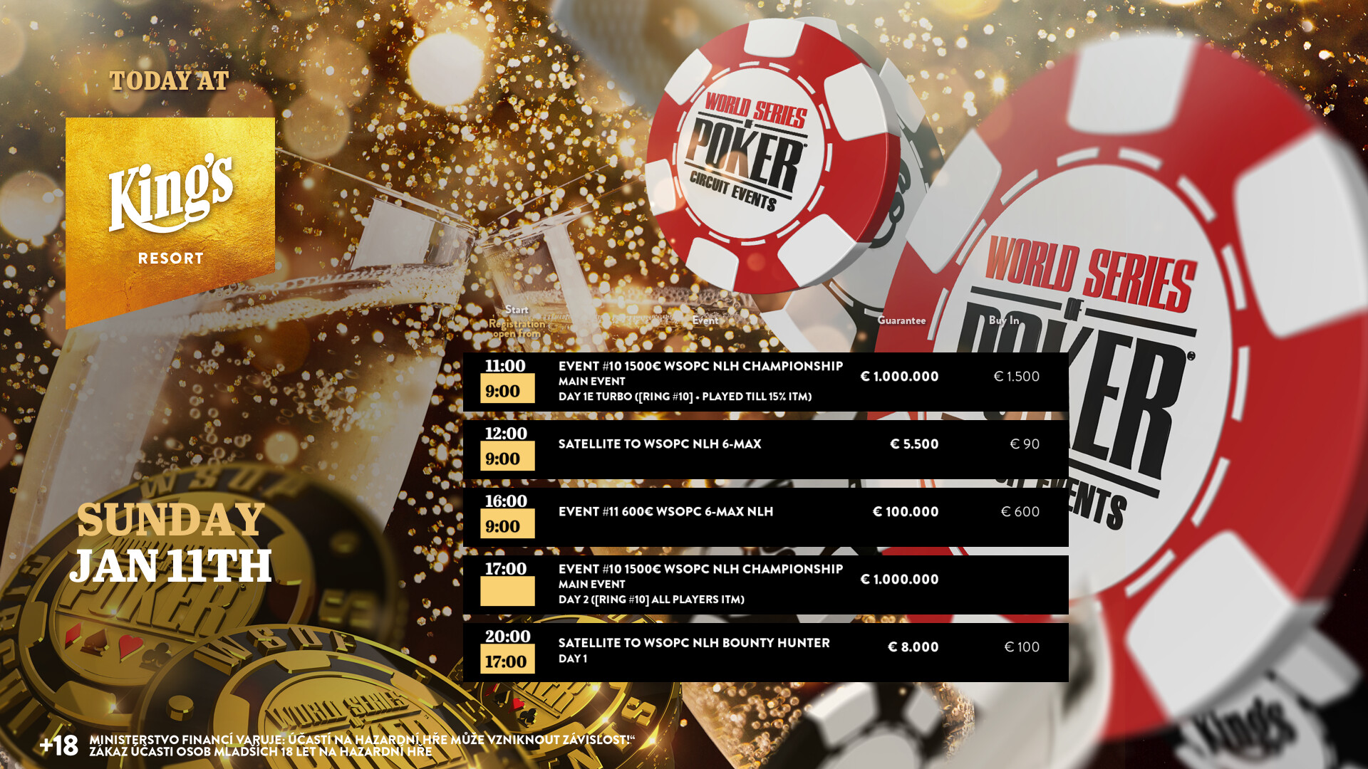 Heute gibt es noch den Turbo Flight beim € 1.500 Main Event (€ 1.000.000 GTD) beim World Series of Poker Circuit (WSOPC) im King’s Resort Rozvadov, die Millionengarantie ist in Reichweite.