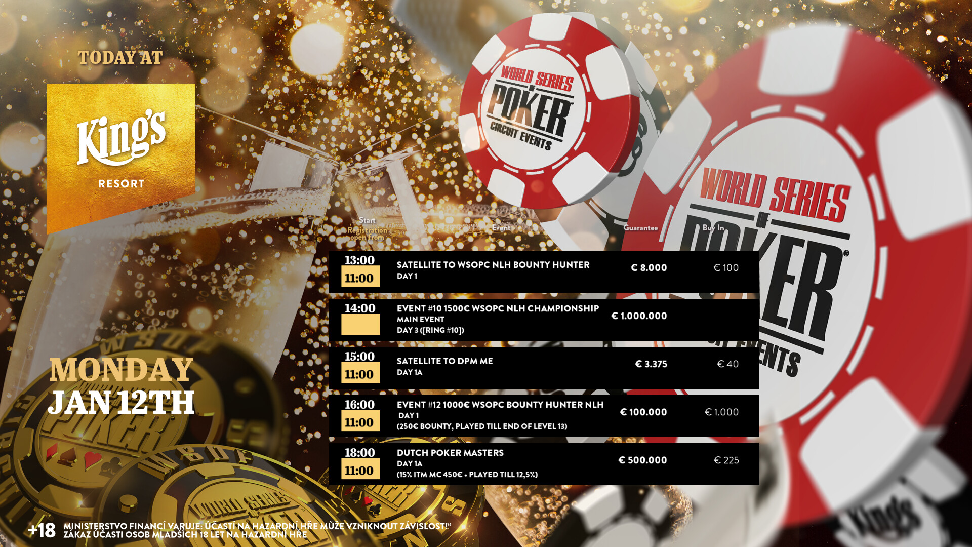 Und es fällt auch der Startschuss zu den € 225 Dutch Poker Masters (€ 500.000 GTD/50k/30′). Die top 15 % kommen ins Geld (€ 450 Min-Cash), die top 12,5 % qualifizieren sich für Tag 2 am Sonntag.  Die Cash Games starten wie gewohnt ab den Blinds € 1/2 NLH bzw. € 2/2 PLO. Alle Infos zum kompletten Angebot findet Ihr unter kings-resort.com.