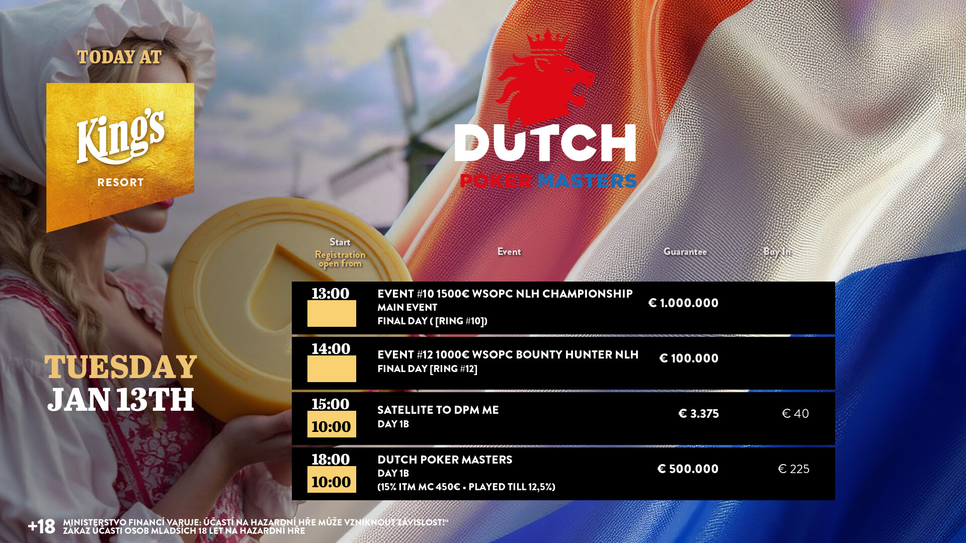 Bereits gestern wurden die € 225 Dutch Poker Masters (€ 500.000 GTD/50k/30′). Hier gibt es heute dieselben Konditionen, die top 15 % kommen ins Geld (€ 450 Min-Cash), die top 12,5 % qualifizieren sich für Tag 2 am Sonntag. Die Cash Games starten wie gewohnt ab den Blinds € 1/2 NLH bzw. € 2/2 PLO. Alle Infos zum kompletten Angebot findet Ihr unter kings-resort.com.