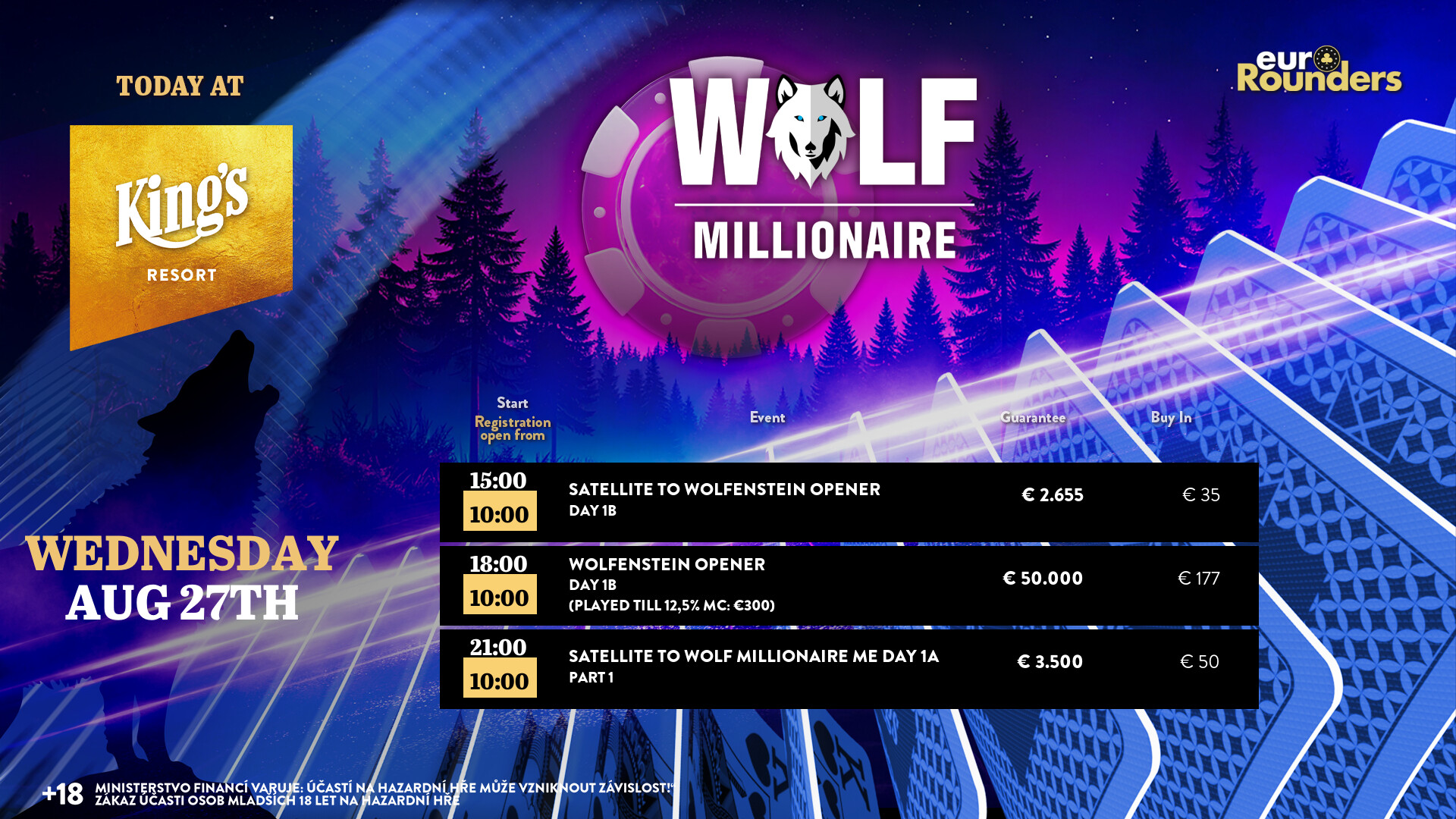 Das nächste Millionen-Festival im King’s Resort Rozvadov hat begonnen. Zum Auftakt vom Wolf Millionaire wurde gestern, den 26. August, mit dem € 177 WOLFenstein Opener (€ 50.000 GTD) gestartet.