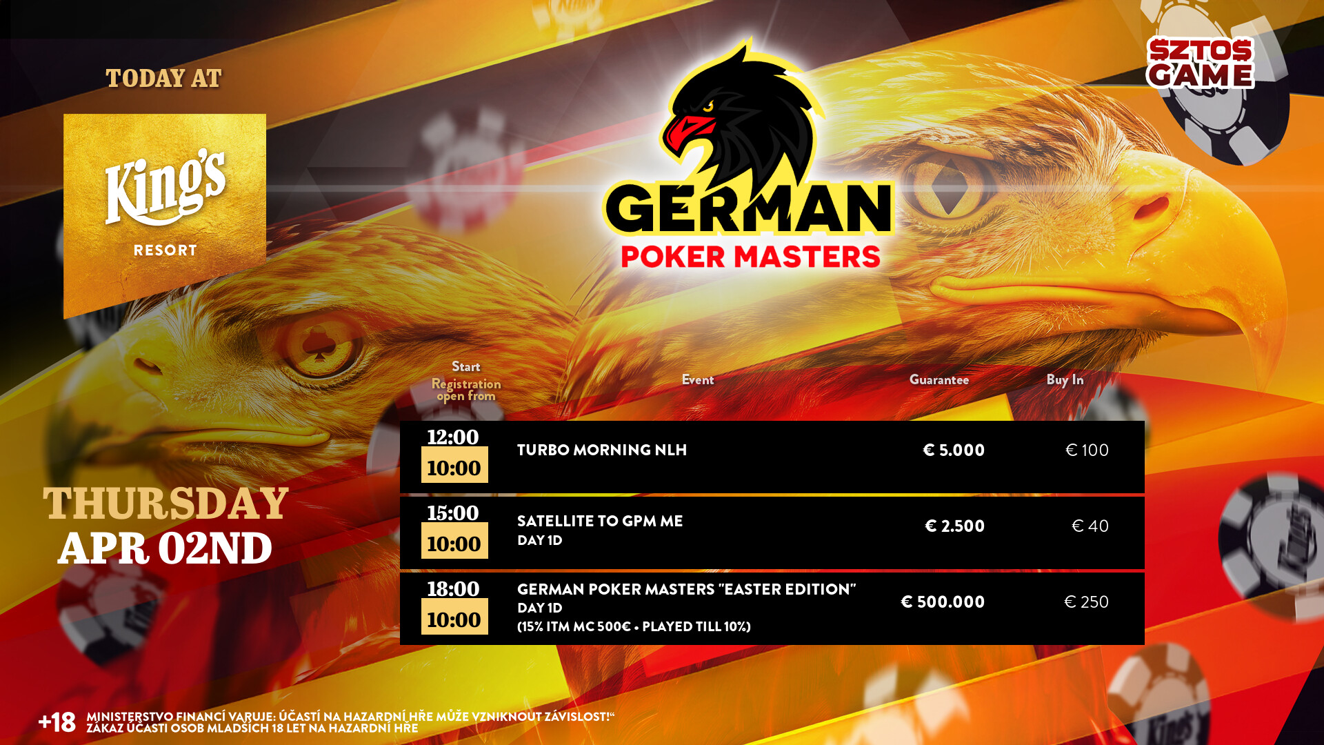 Auch der dritte Flight bei der € 250 German Poker Masters Easter Edition (€ 500.000 GTD inkl. 10 x € 3k King’s Million EPC Packages) im King’s Resort Rozvadov brachte noch keine allzu große Runde, Zeman konnte den Tagessieg holen.
