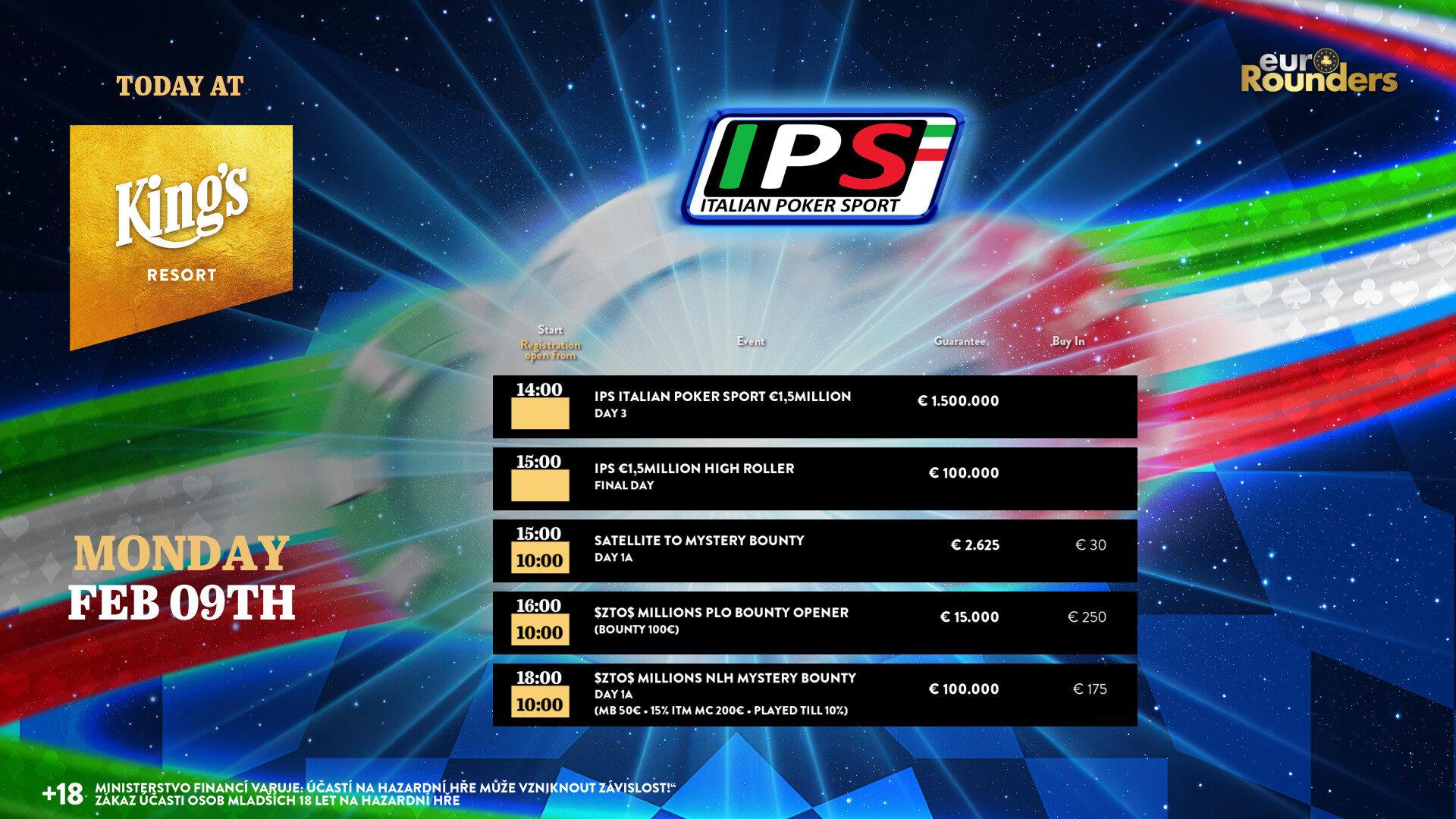 Auch das € 1.100 IPS High Roller beim Italian Poker Sport im King’s Resort Rozvadov brachte wieder massenweise Spieler. Jones führt heute 40 Spieler ins Finale, wo auf den Sieger  € 51.900 warten.