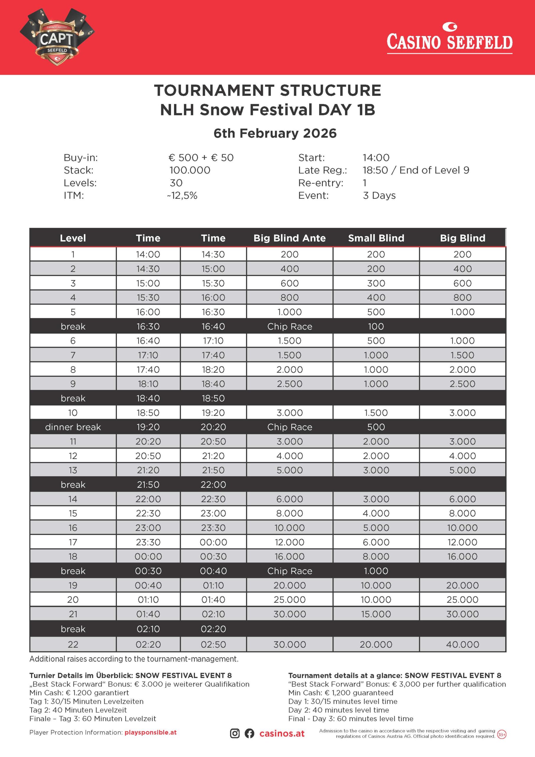Wien, Bregenz und Tag 1A haben zusammen schon 199 Entries beim € 500 + 50 Snow Festival gebracht. Heute geht es um 14 Uhr mit 100.000 Chips und 30 Minuten Levels in Tag 1B, Tagesziel sind wieder die Geldränge mit 12,5 % der Entries.