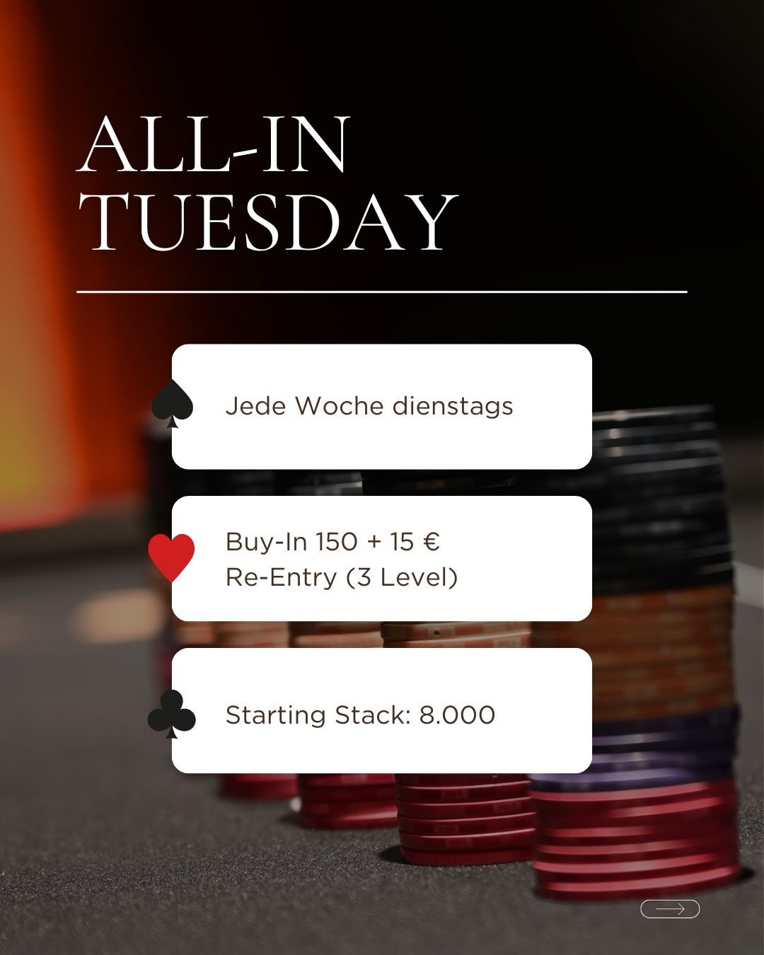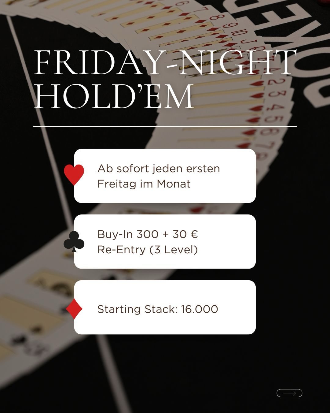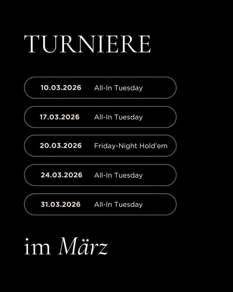 Dienstags steht ab sofort im Zeichen vom € 150 + 15 „All-in Tuesday“. Generell immer für den ersten Freitag im Monat, ausnahmsweise aber am 20. März, gibt es das € 300 + 30 Friday Night Hold’em.