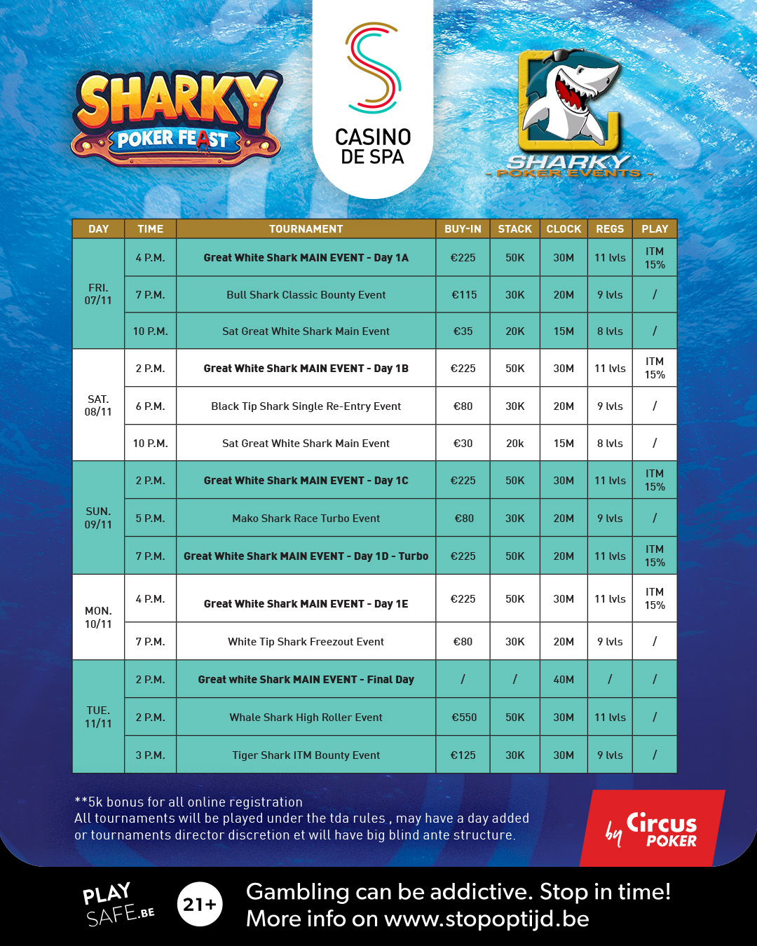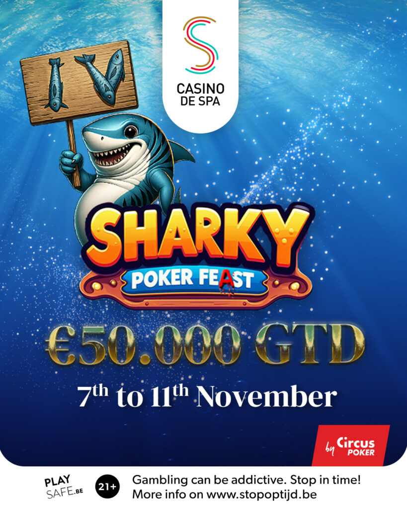 Zum zweiten Mal dieses Jahr lädt das Casino Spa in Belgien zum Sharky Poker Feast. Von 7. bis 11. November wird gespielt, beim € 225 Main Event warten € 50.000 Preisgeld.