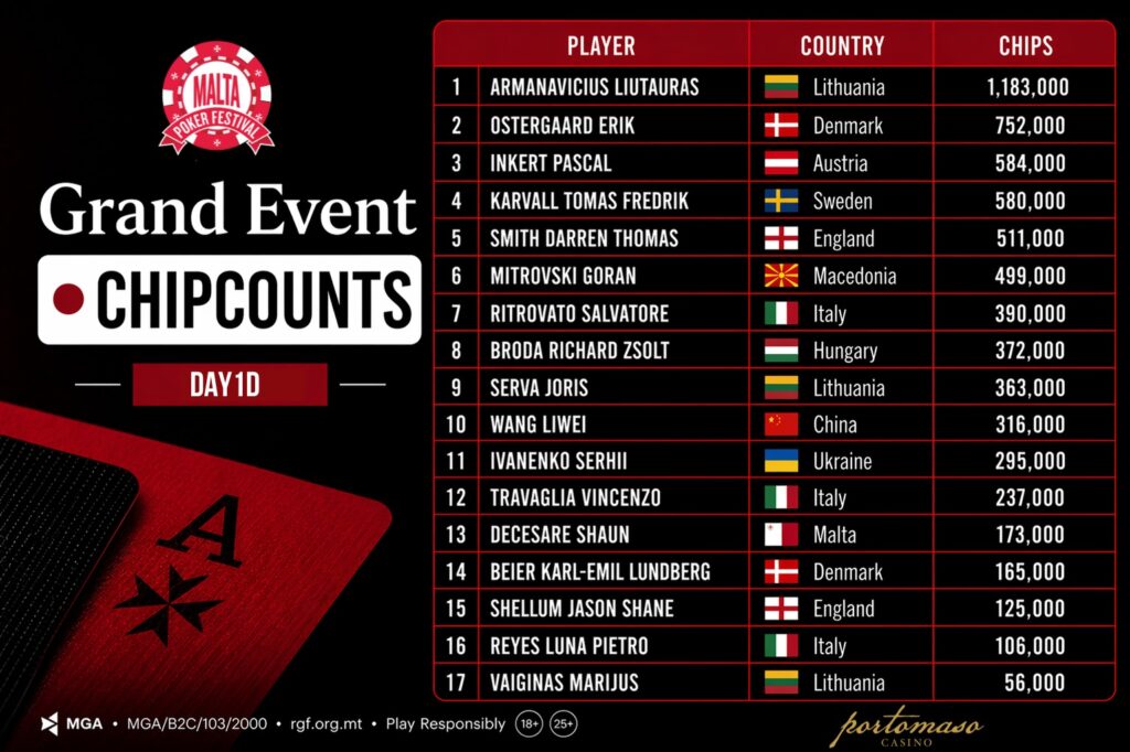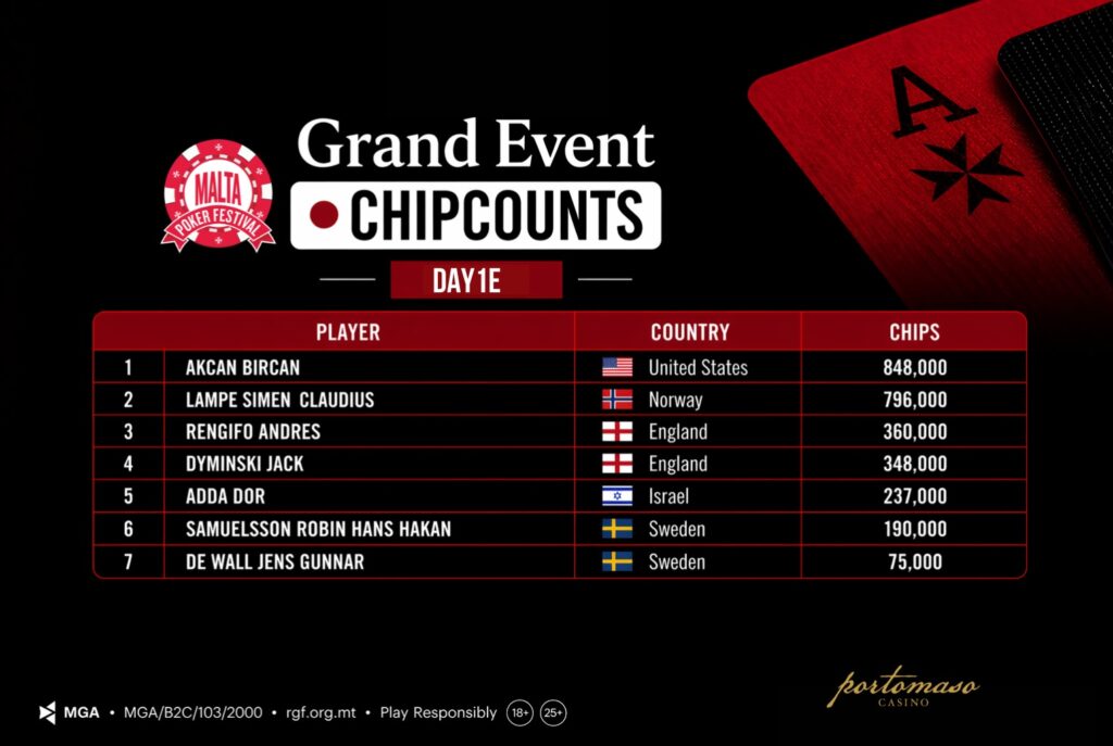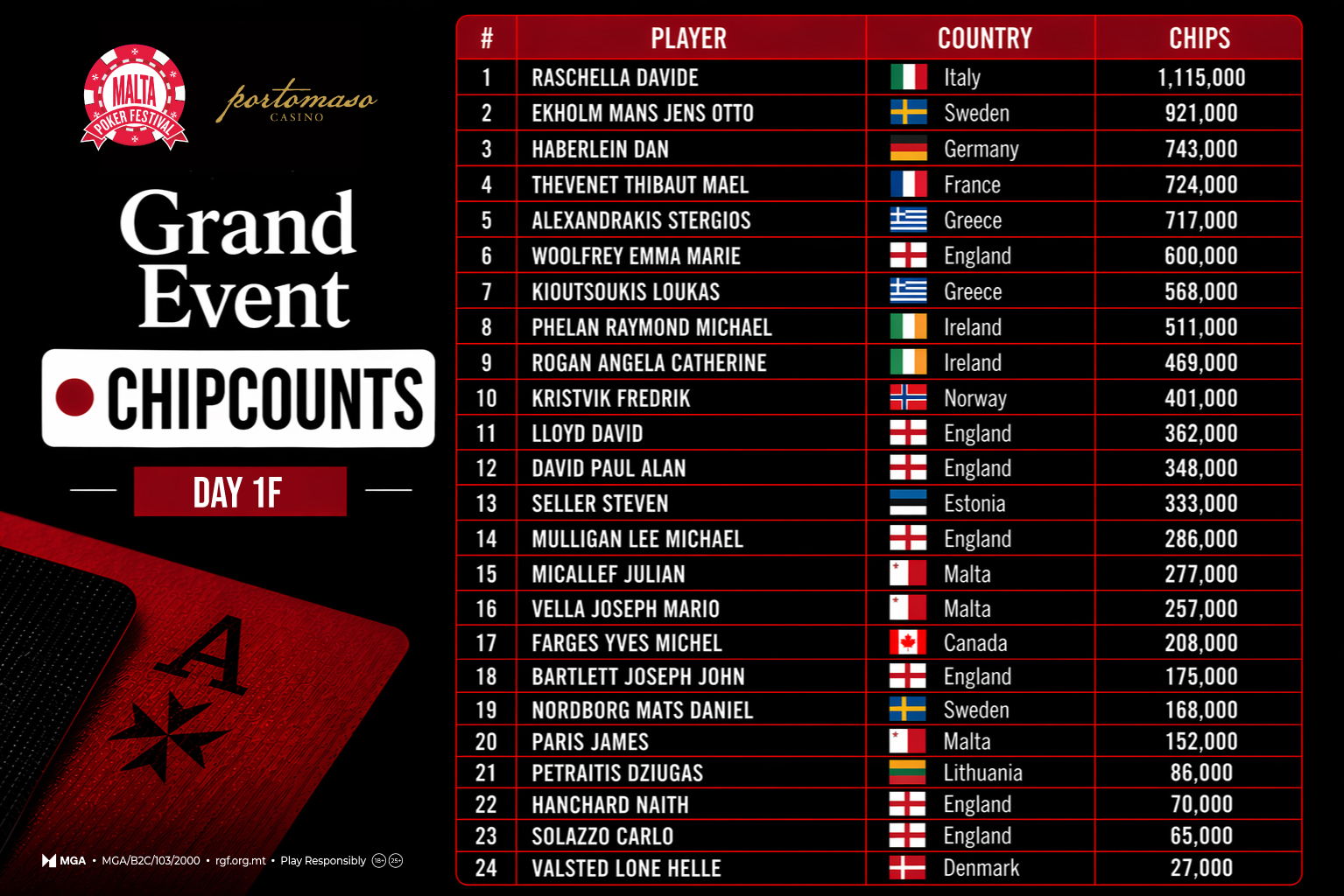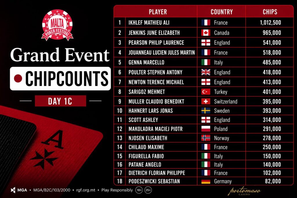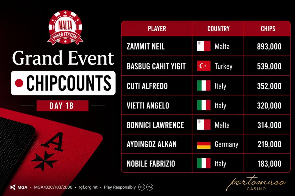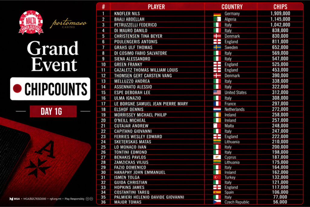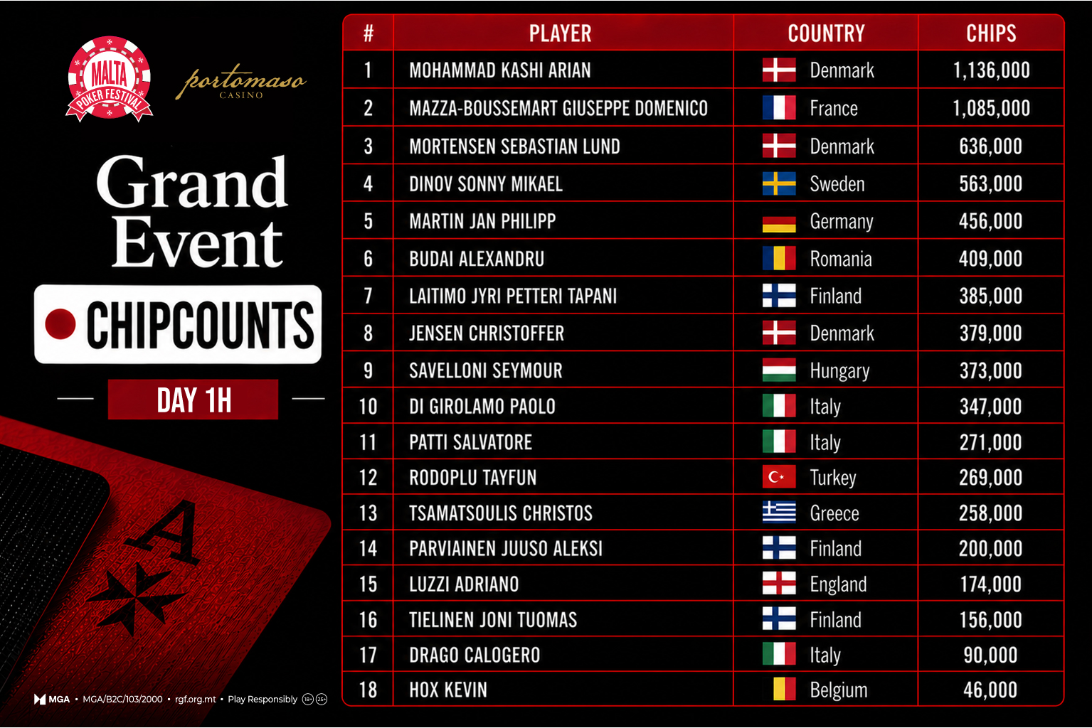 Die Side Events beim Malta Poker Festivals liefen bislang sehr gut, zwei Trophäen (Kikii Knowle und Patrick Kneringer) gingen bereits nach Österriech. Beim € 540 + 60 MPF Grand Event gibt es insgesamt elf Flights, wobei der vorgezogene Tag 1A nicht stattfand. Tag 1B war ebenfalls früher und lockte mit einem günstigeren Buy-In von € 440 + 60. Gespielt wird das Main Event generell mit 60.000 Chips und 40 Minuten Levels.
