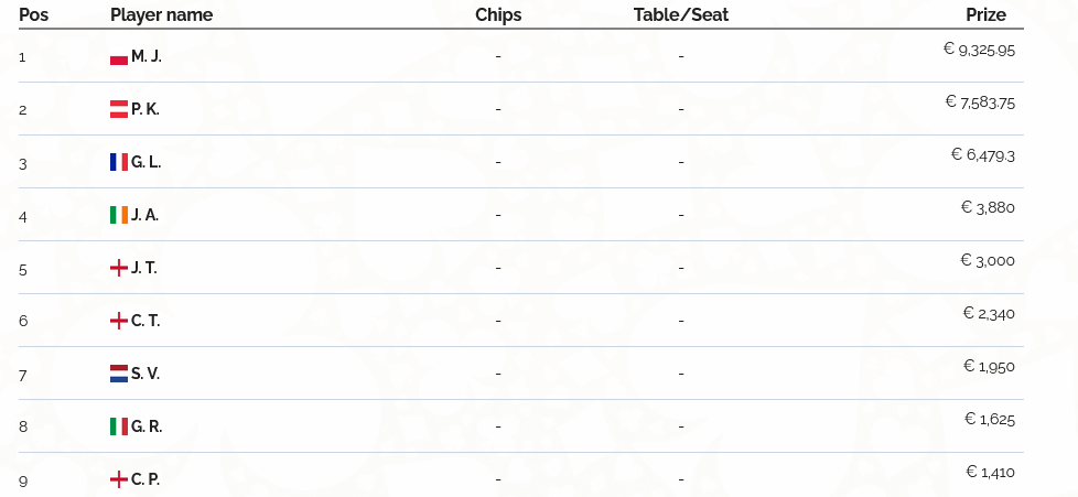 25.000 Chips und 25 Minuten Levels waren die Konditionen. 256 Entries sorgten für einen Preispool von € 53.504 (nach Abzug der 5 % Staff), die top 31 Plätze waren bezahlt. € 450 gab es als Min-Cash. Die letzten drei einigten sich auf einen Deal und flippten um die Trophy. Mit € 7.583 erhielt Patrick Kneringer das zweitmeiste Geld, aber er konnte sich die Trophy und damit den offiziellen Sieg sichern.