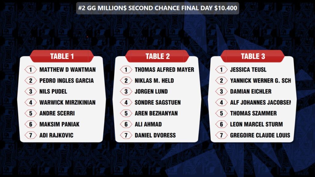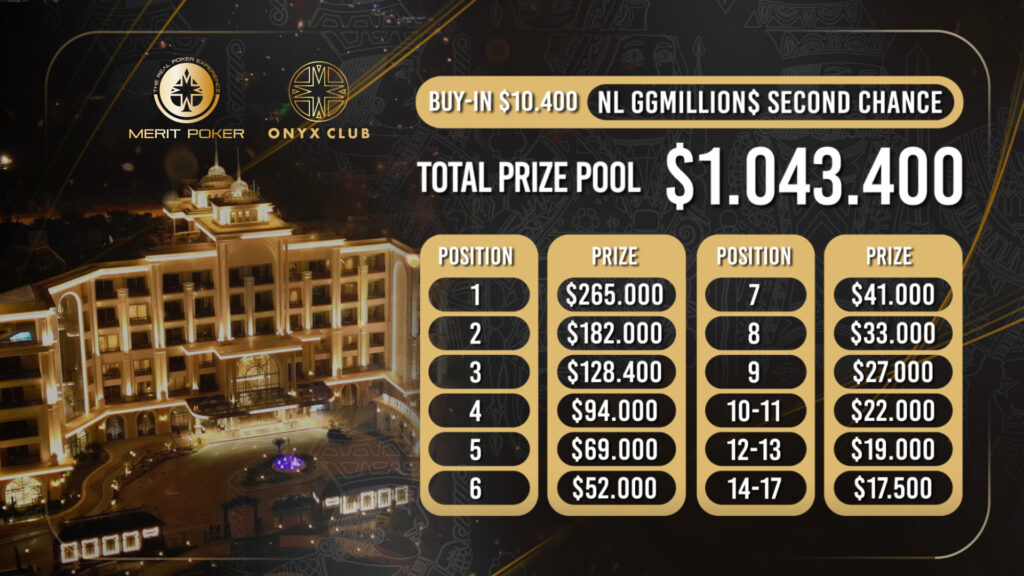 Neben dem Kampf um den Final Table beim $10k GGMillion$ ($5.000.000 GTD)  der Onyx Super High Roller Series im Onyx Club im Merit Royal Diamond Zypern gab es auch das $10.400 GGMillion$ Second Chance, bei dem heute noch 21 Spieler auf die Siegprämie von $265.000 hoffen.