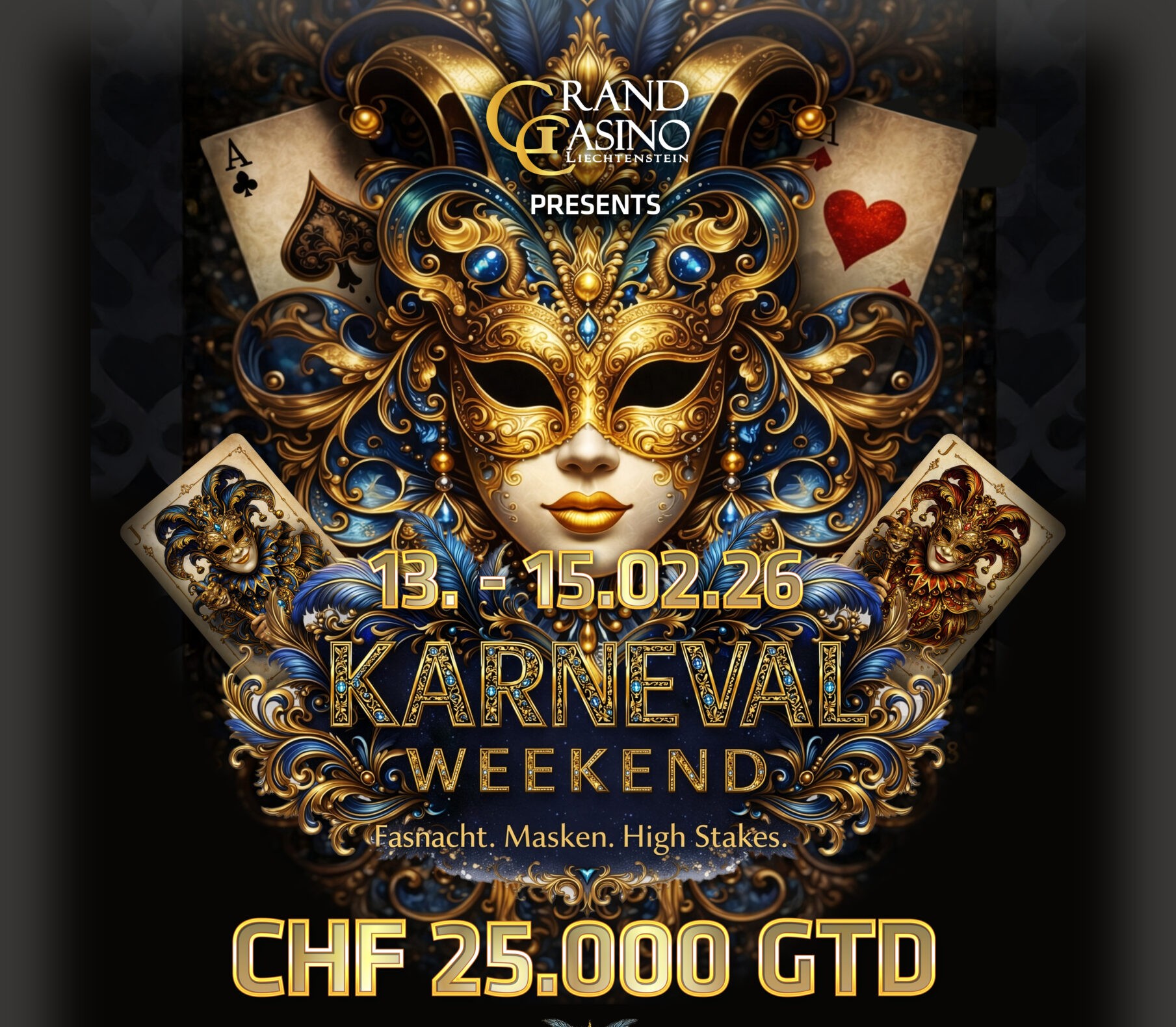 Im Grand Casino Liechtenstein wird Karneval gefeiert, drei Turniere mit insgesamt CHF 25.000 GTD warten. Am Freitag steht das CHF 120 + 20 Opener (CHF 8.000 GTD) an, am Samstag das CHF 160 + 20 Masquerade (CHF 12.000 GTD) und am Sonntag noch das CHF 90 + 10 Joker Turnier (CHF 5.000 GTD).
