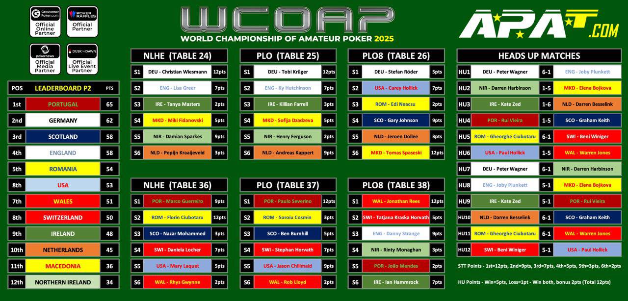 Nach Tag 1 der Team Championship der World Championship of Amateur Poker (WCOAP) im Dusk Till Dawn Pokerclub in Nottingham liegt Team Germany auf Rang 2, die Schweizer starten von Rang 8.