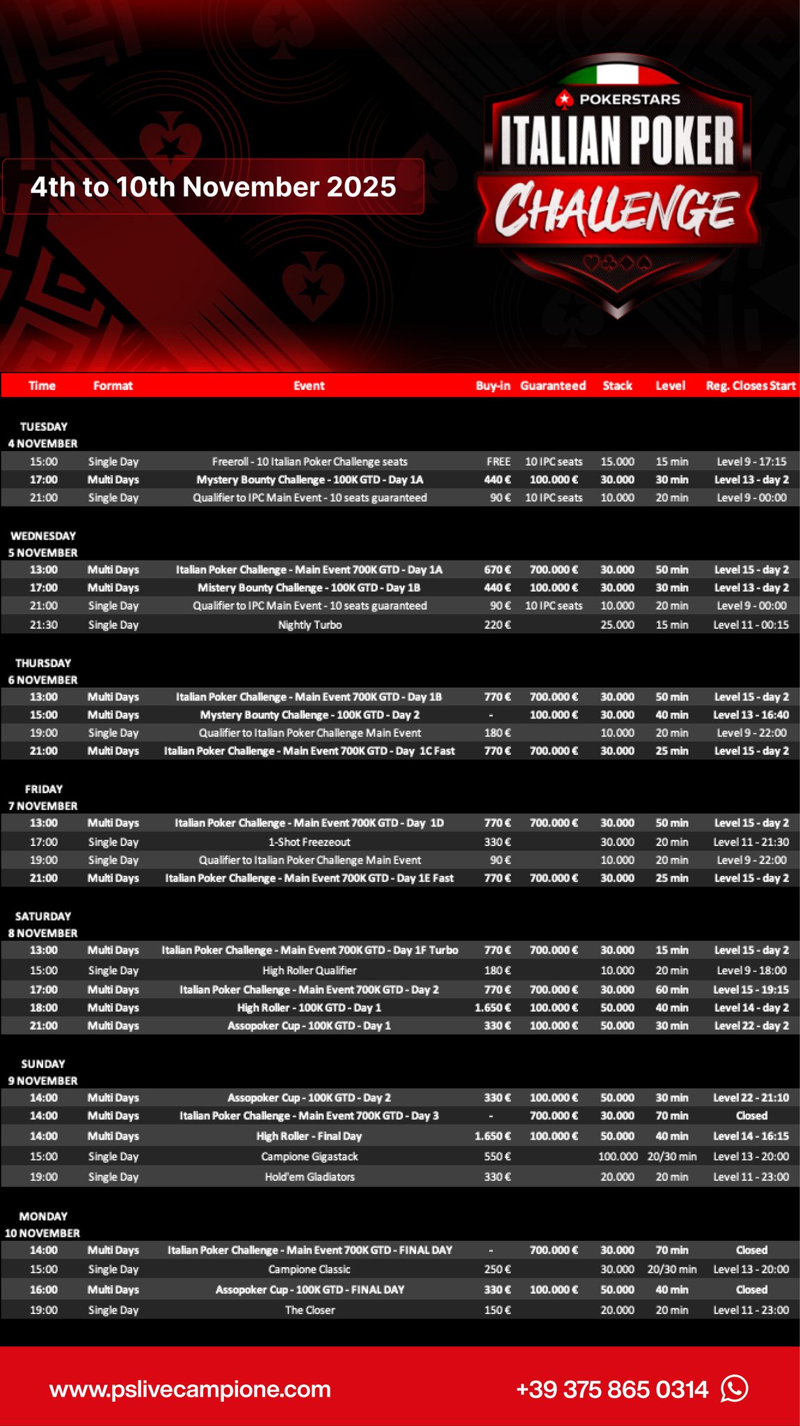 Gestern, den 4. November, eröffnete man im PokerStars Live Pokerroom im Casino Campione die Italian Poker Challenge # 2. Erste Highlight ist das € 440 Mystery Bounty (€ 100.000 GTD), heute beginnt aber auch schon das € 770 IPC Main Event (€ 700.000 GTD).