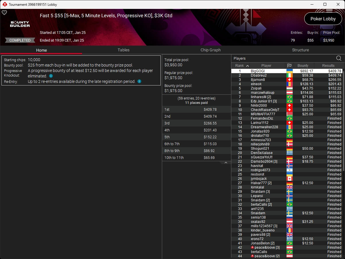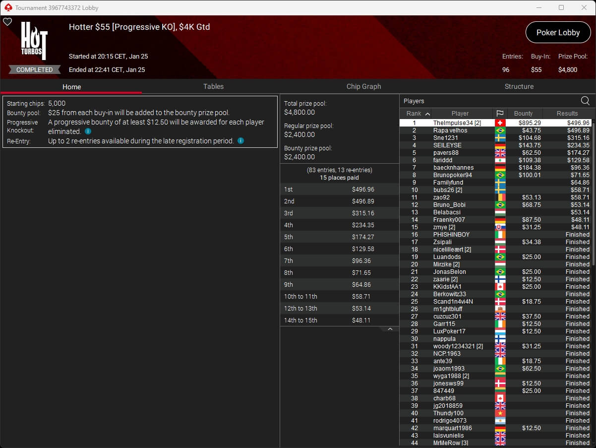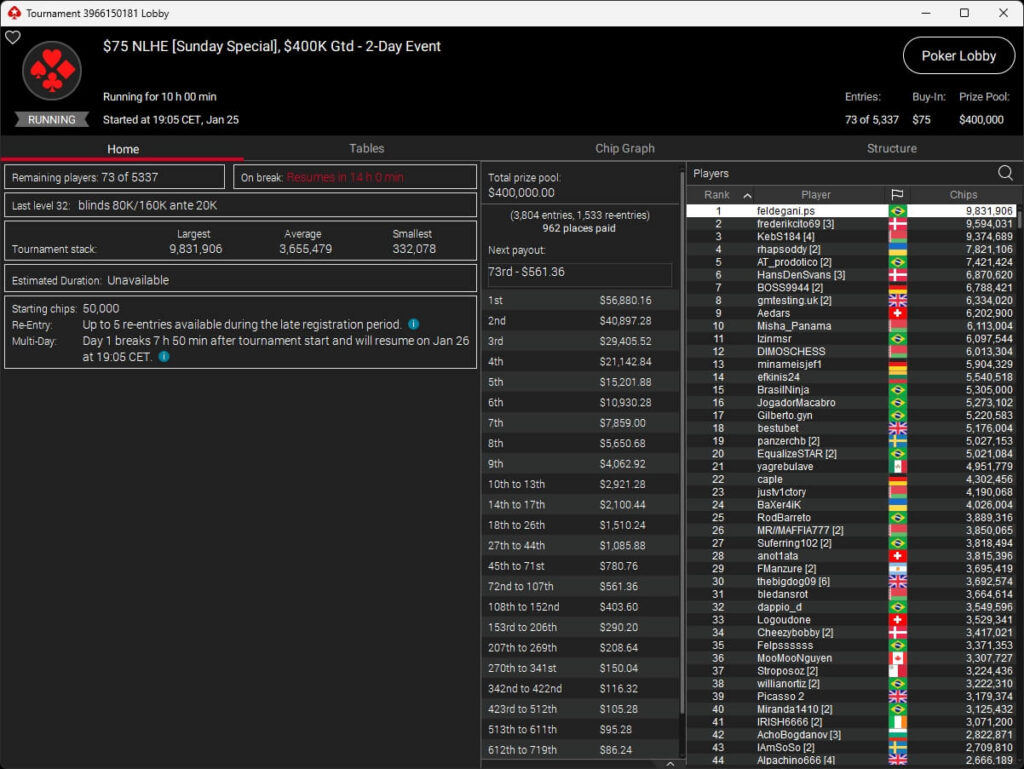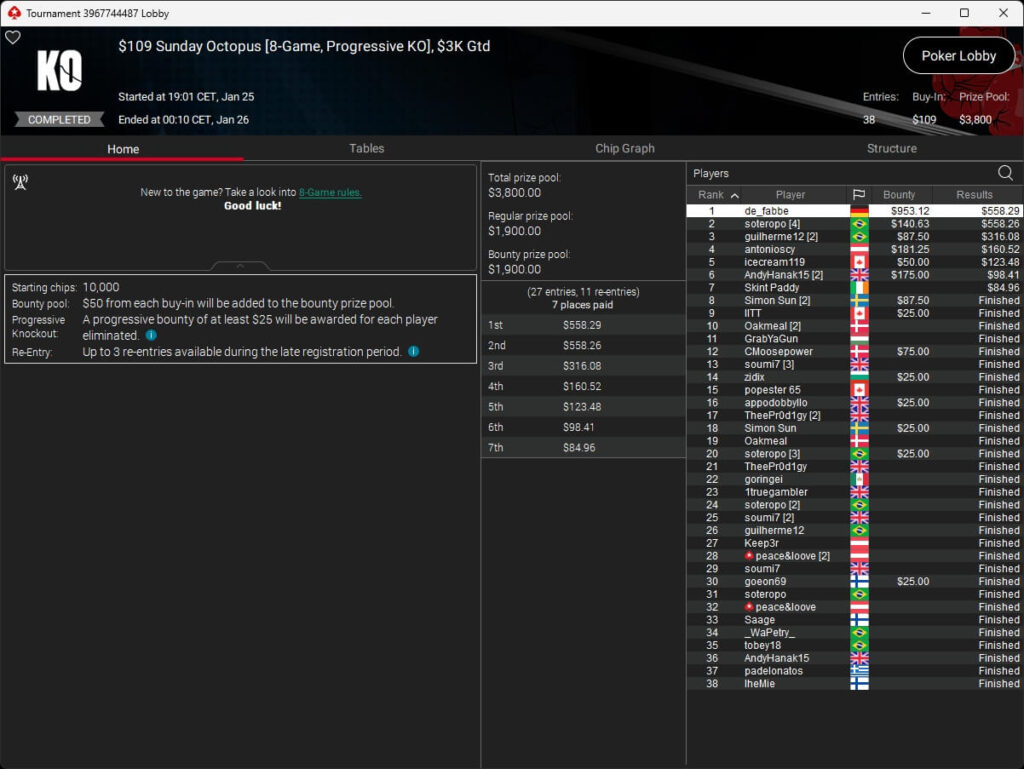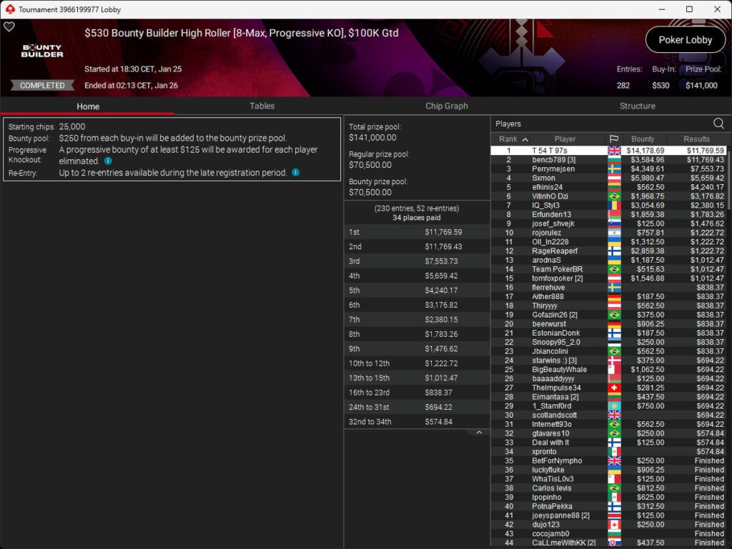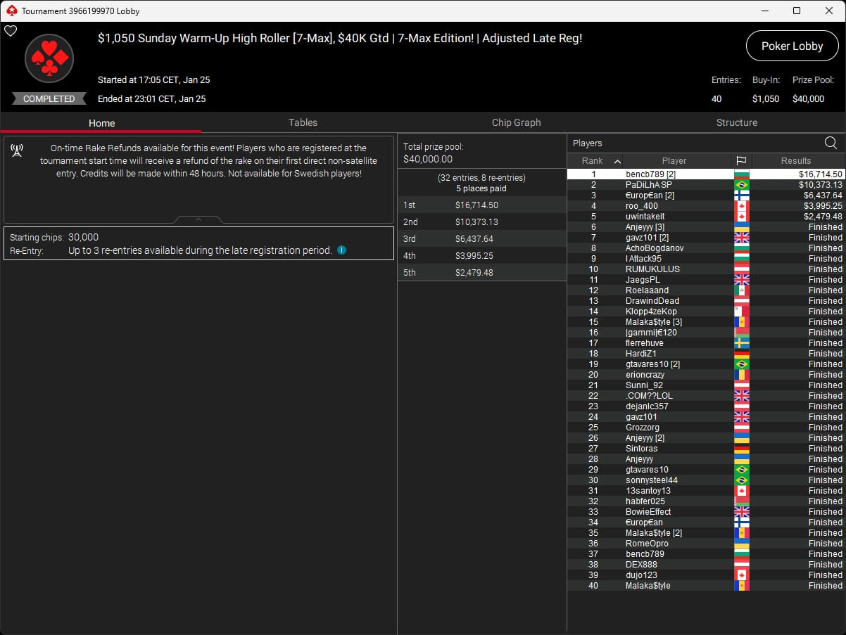 Die deutschsprachige Poker-Community war beim Turniersonntag auf PokerStars vorne mit dabei. Benjamin „bencb789“ Rolle setzte sich im $1.050 Sunday Warm-Up High Roller ($16.714,50) durch und wurde im $530 Bounty Builder HR ($11.769,43 + $3.584,96) Runner-Up. de_fabbe ($558,29 + $953,12; $109 Sunday Octopus), TheImpulse34 ($496,96 + $895,29; $55 Hotter) und RicoMinibAby ($1.771,03; $75 Spectral Shadow) spielten ebenfalls Titel ein.