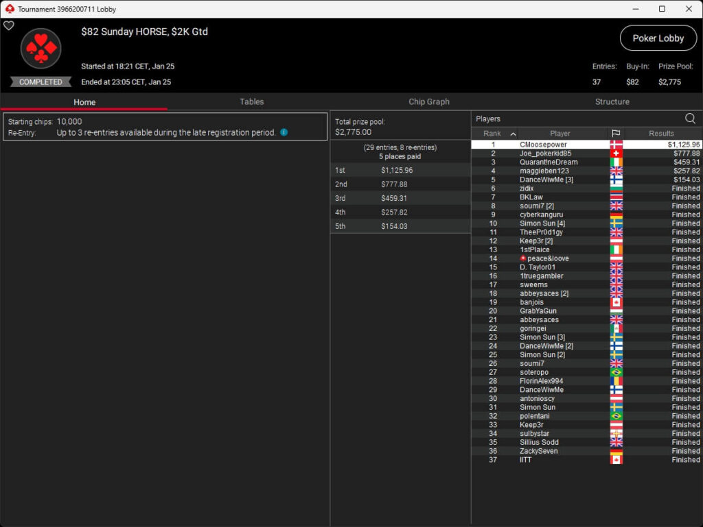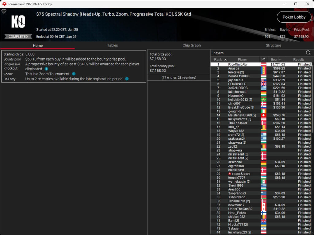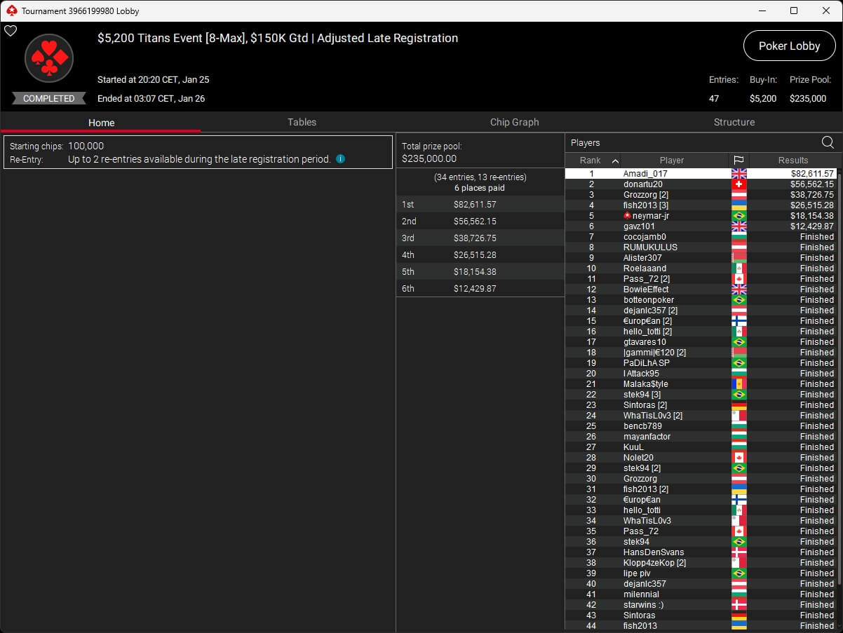 Zum $5.200 Titan traten 47 Starter an. Inklusive der Re-Entries lagen $235.000 in der Mitte. Ognyan „cocojamb0“ Dimov wurde Bubble Boy. Am Ende setzte sich Adrian „Amadi_017“ Mateos ($82.611,57) gegen donartu20 (2./$56.562,15) durch. Grozzorg (3./$38.726,75) schaffte es auf das Treppchen. Die weiteren Cashes gingen an Mikita „fish2013“ Badziakouski (4./$26.515,28), Neymar Jr. (5./$18.154,38) und Gavin „gavz101“ Cochrane (6./$12.429,87).