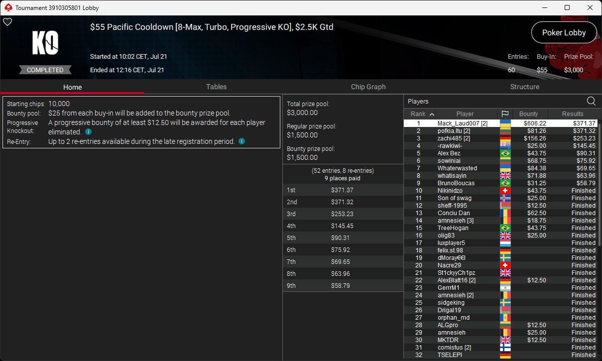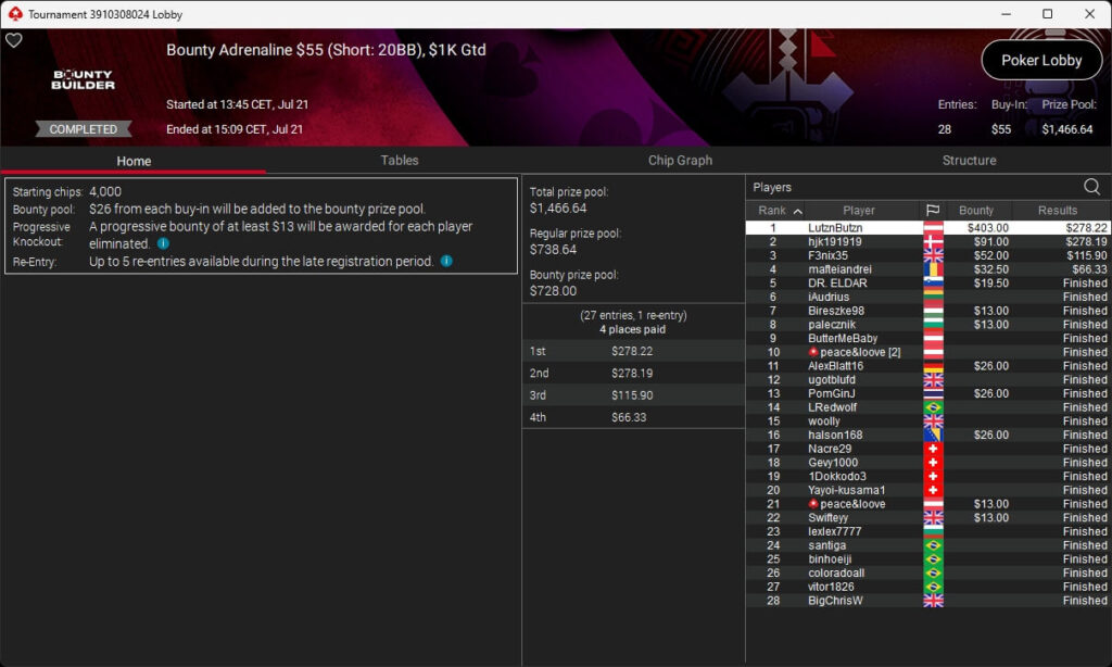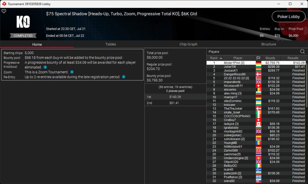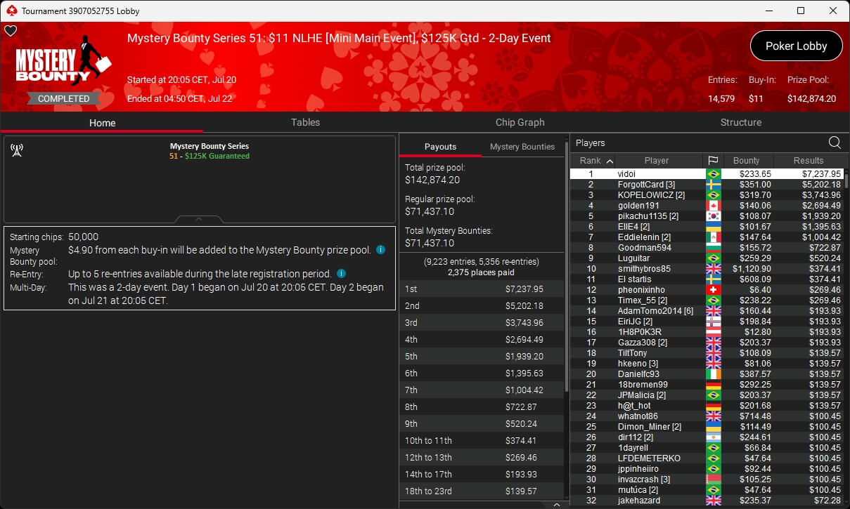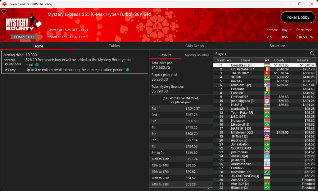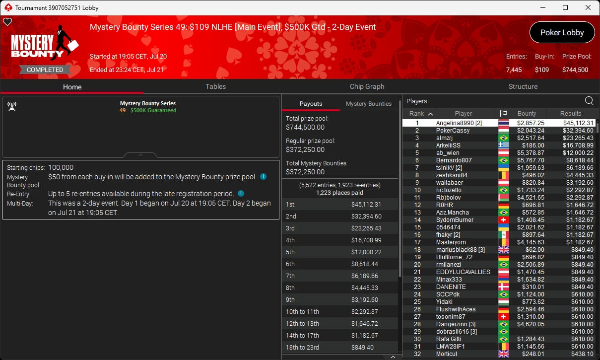 Dazu fiel die Entscheidung im $109 Main Event der Mystery Bounty Series. Angelina8990 ($45.112,31 + $2.857,25) sicherte sich den Sieg sowie den Löwenanteil an den insgesamt $744.500. Runner-up wurde PokerCassy (2./$32.394,60 + $2.043,24), Rang 3 ging an slmzrj (3./$23.265,43 + $2.517,64) aus Brasilien.