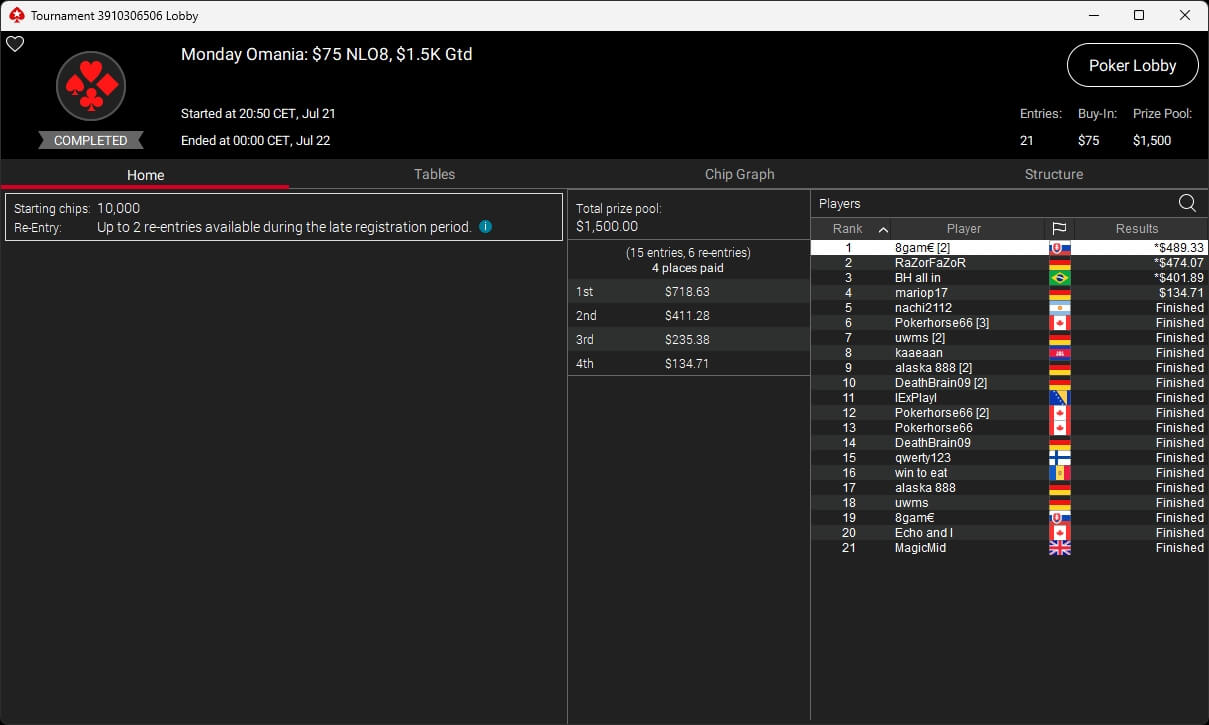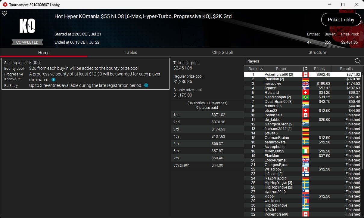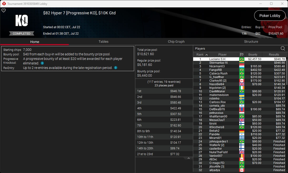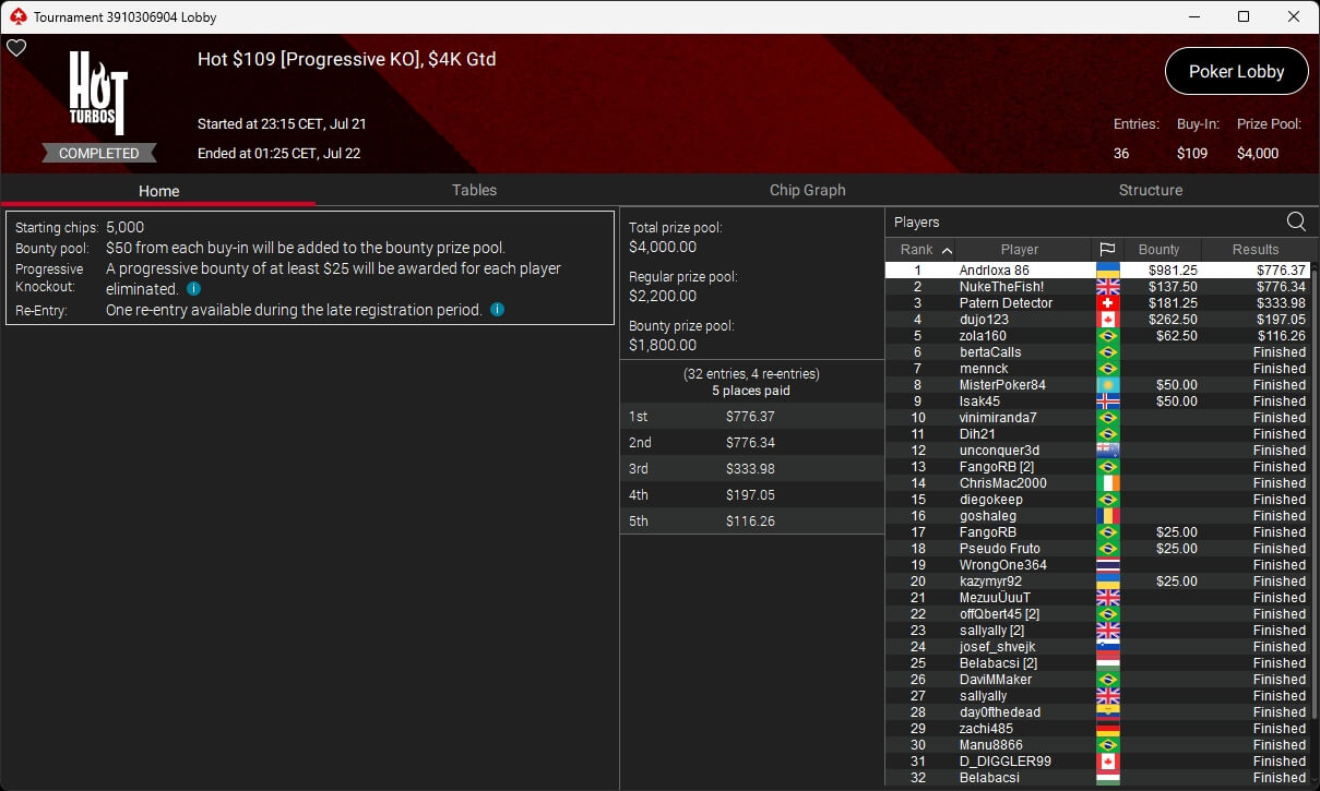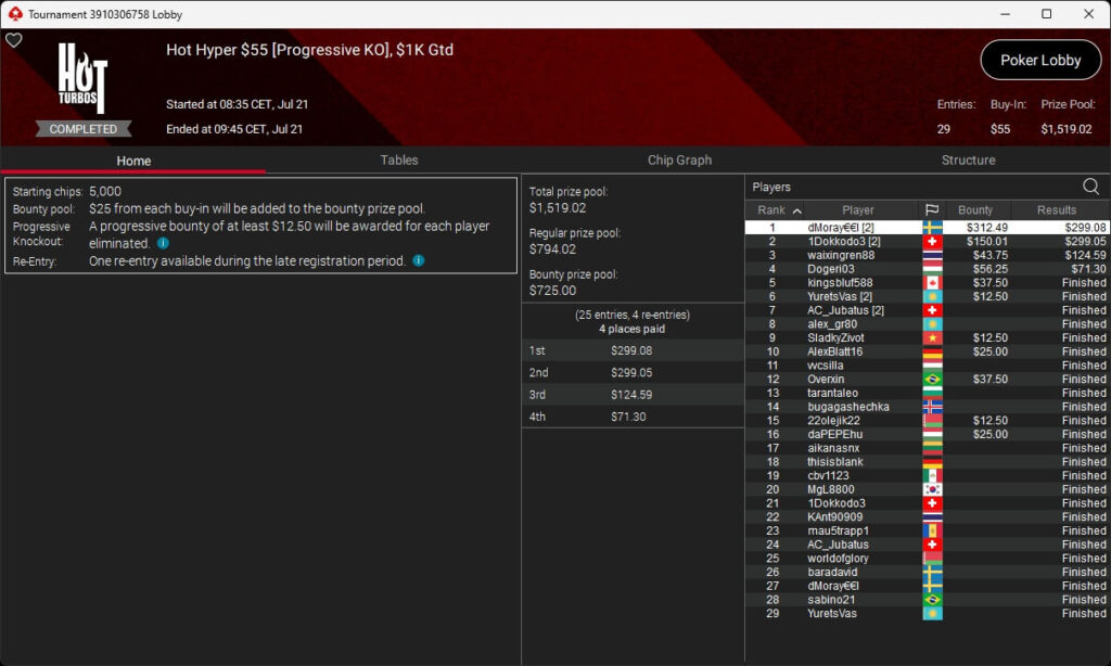 Dazu fiel die Entscheidung im $109 Main Event der Mystery Bounty Series. Angelina8990 ($45.112,31 + $2.857,25) sicherte sich den Sieg sowie den Löwenanteil an den insgesamt $744.500. Runner-up wurde PokerCassy (2./$32.394,60 + $2.043,24), Rang 3 ging an slmzrj (3./$23.265,43 + $2.517,64) aus Brasilien.