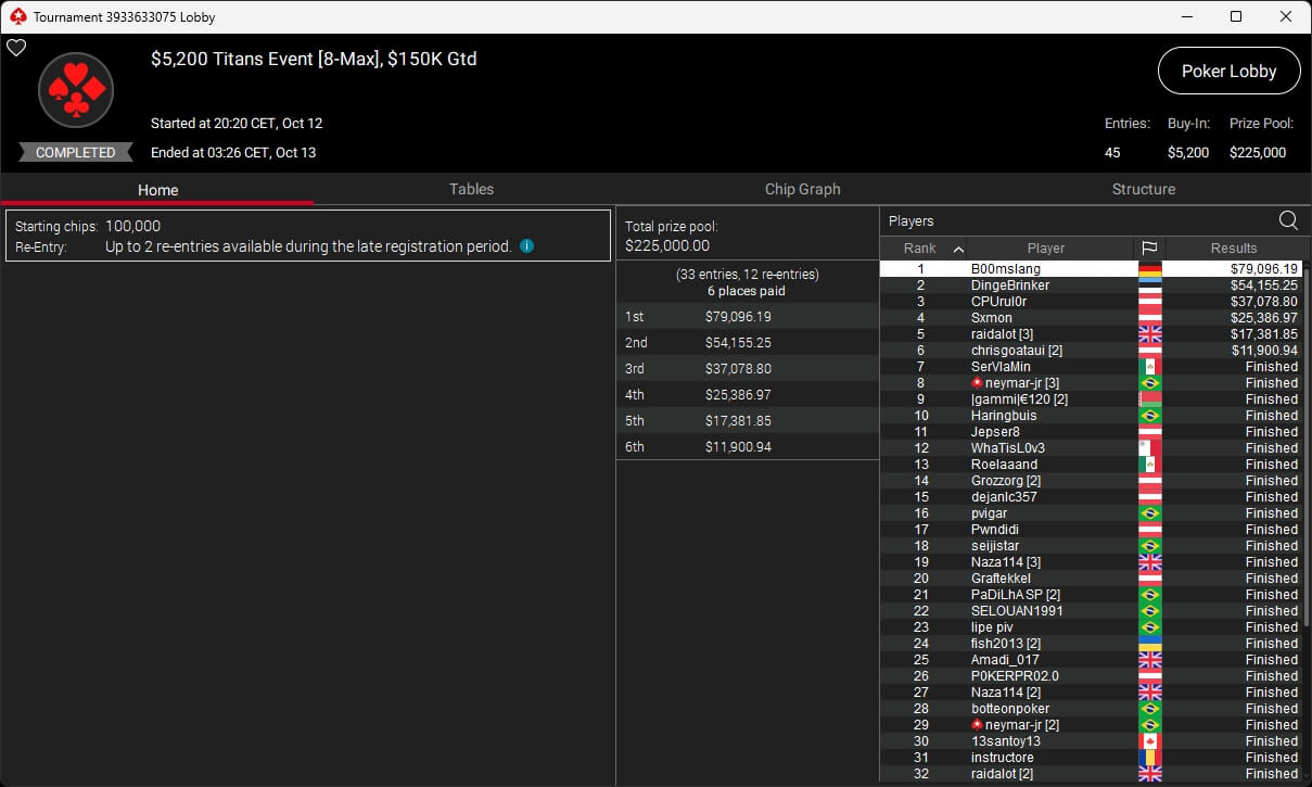 B00mslang hat das PokerStars Titans Event gewonnen. CPUrul0r aus Österreich wurde Runner-Up.