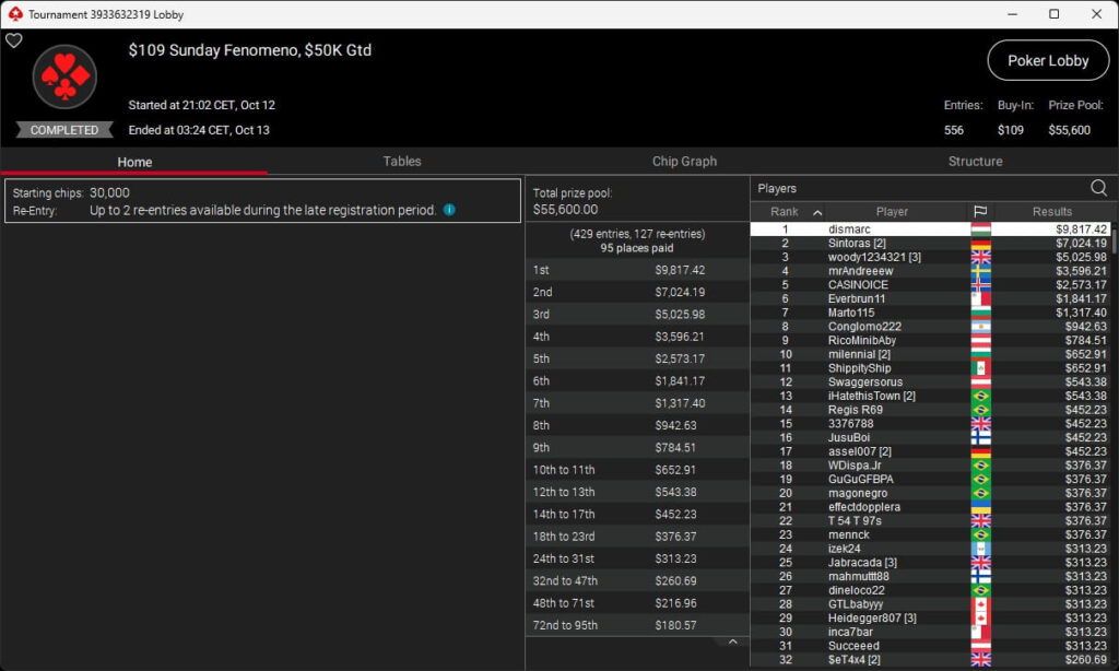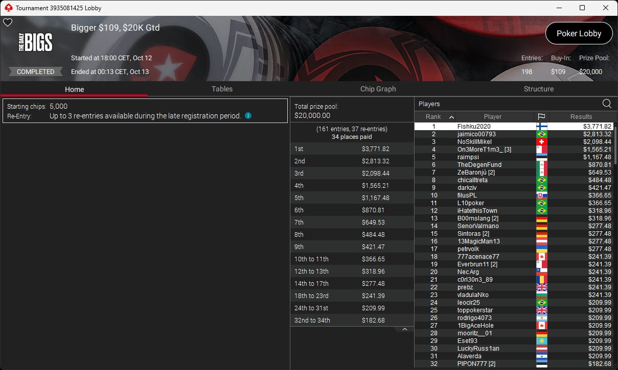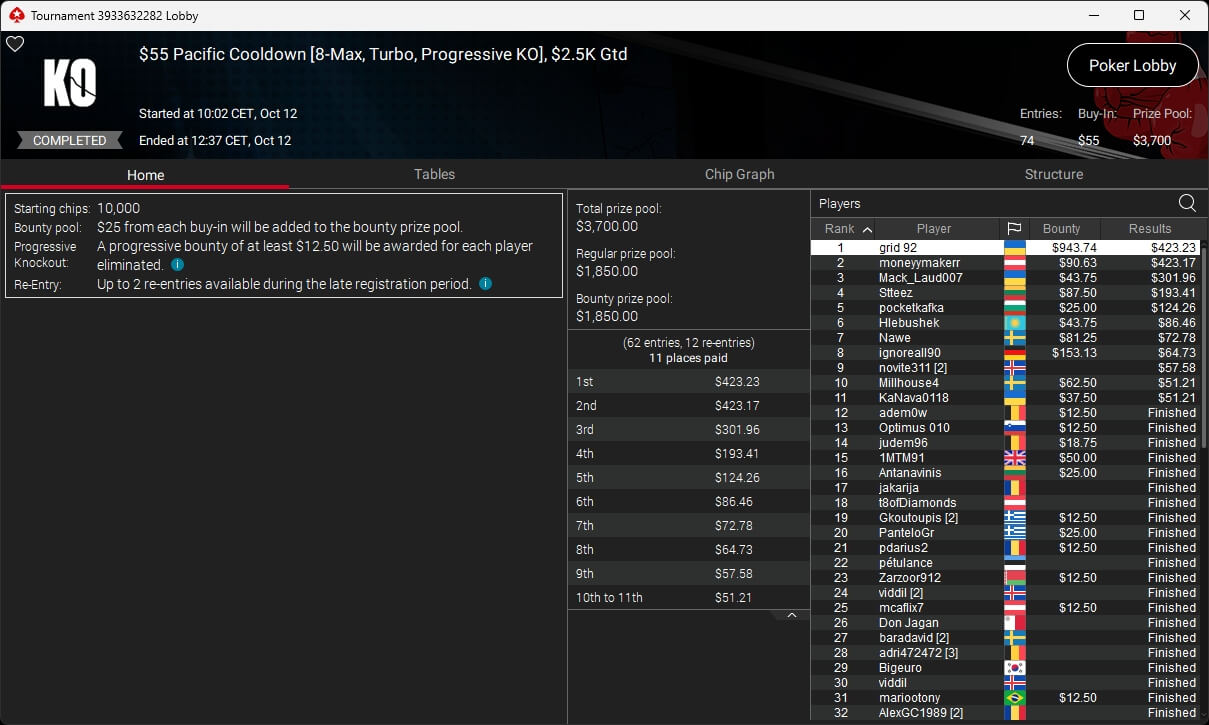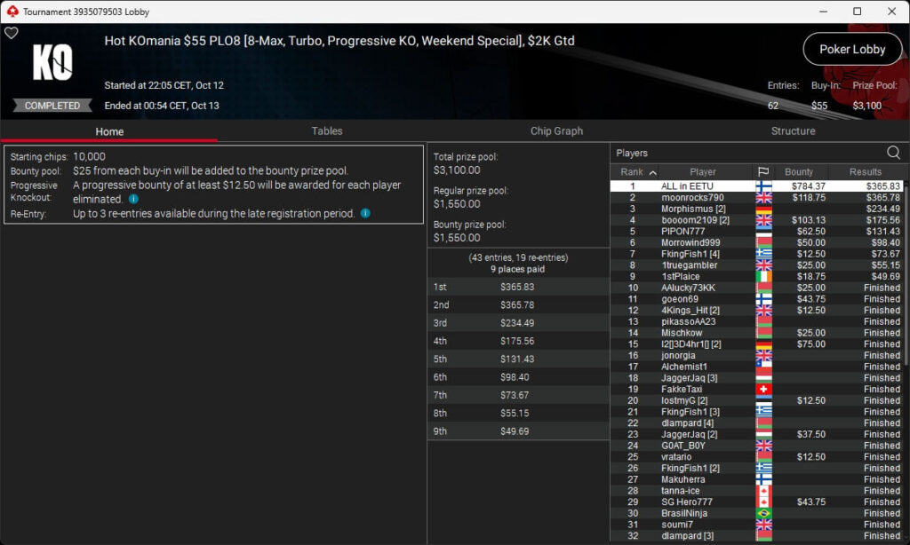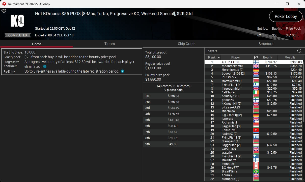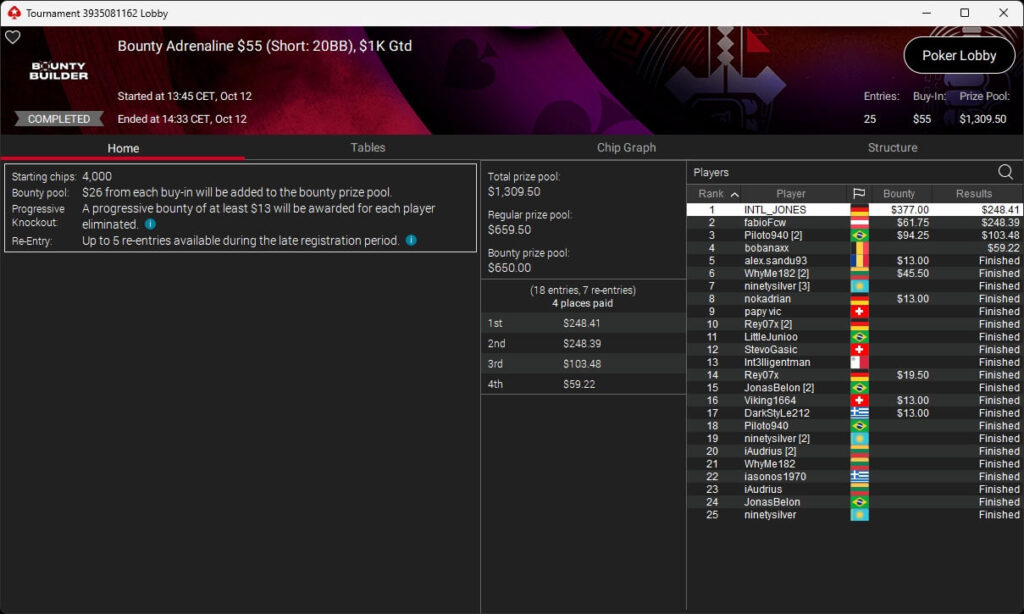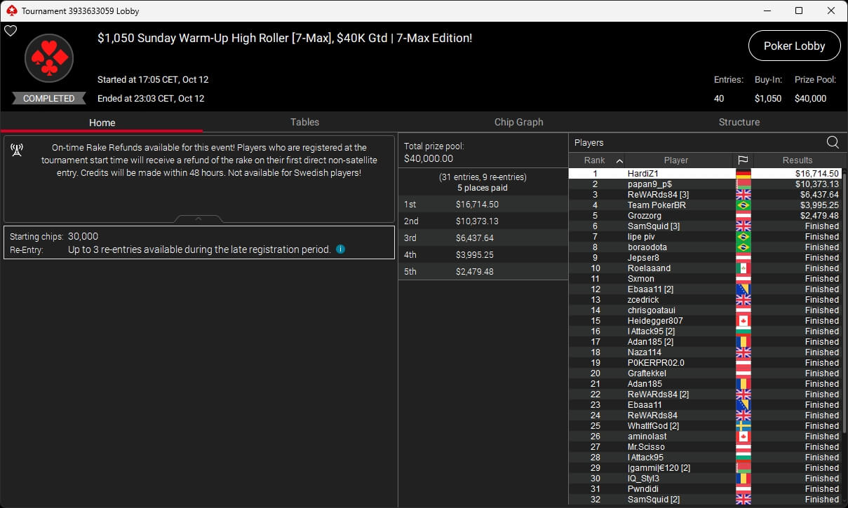 Bei den regulären Pokerturnieren verbuchte HardiZ1 im $1.050 Sunday Warm-Up ($16.714,50) sowie dem $215 Sunday Supersonic ($8.162,22) jeweils einen Sieg. INTL_JONES ($248,41 + $377) schlug im $55 Bounty Adrenaline zu.