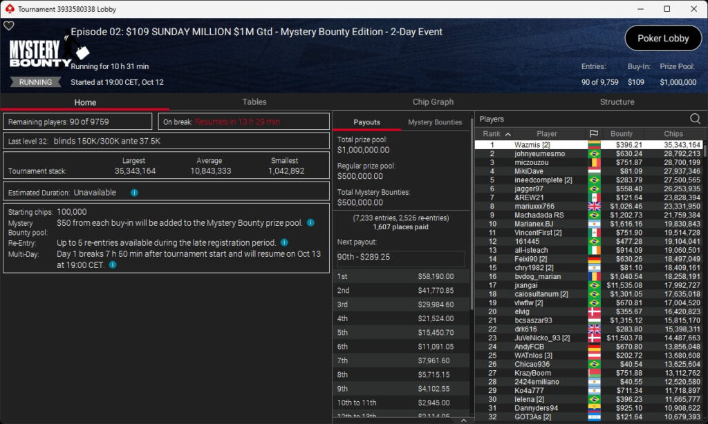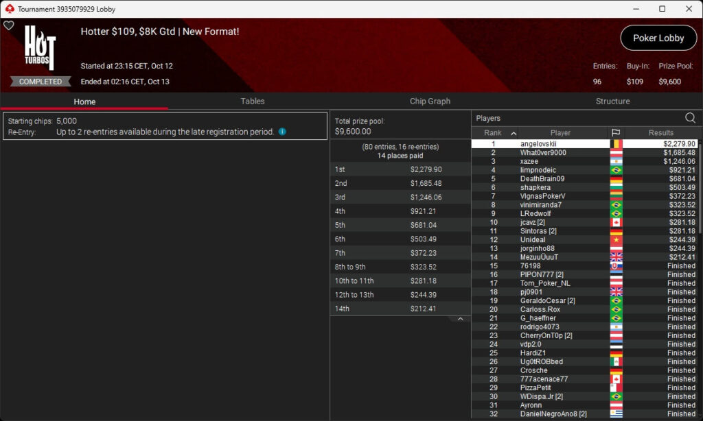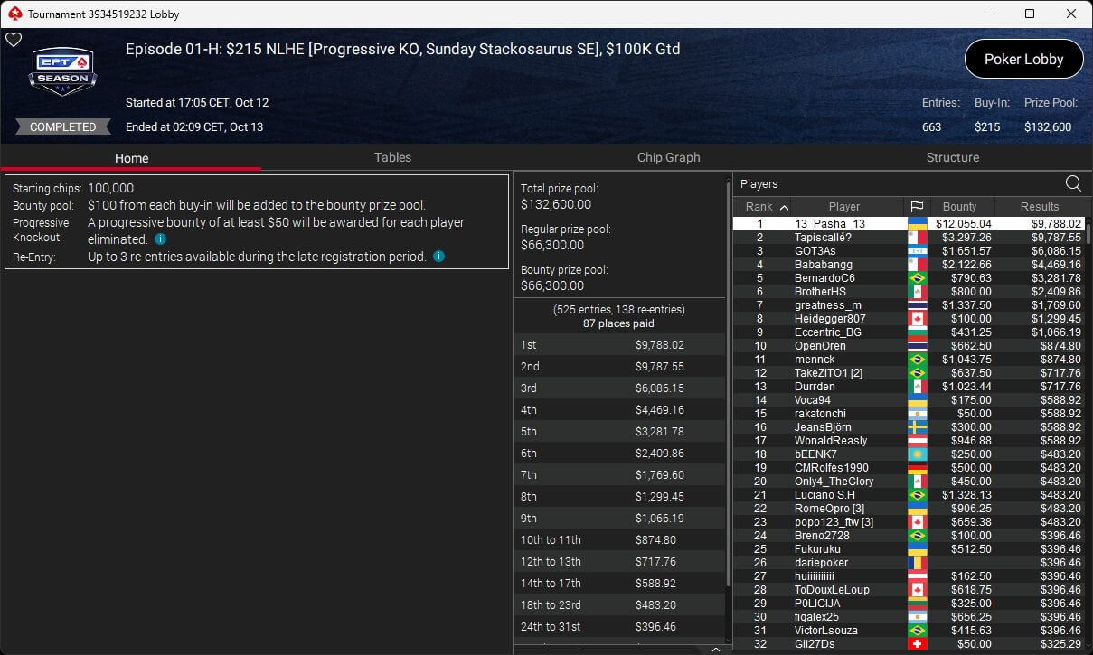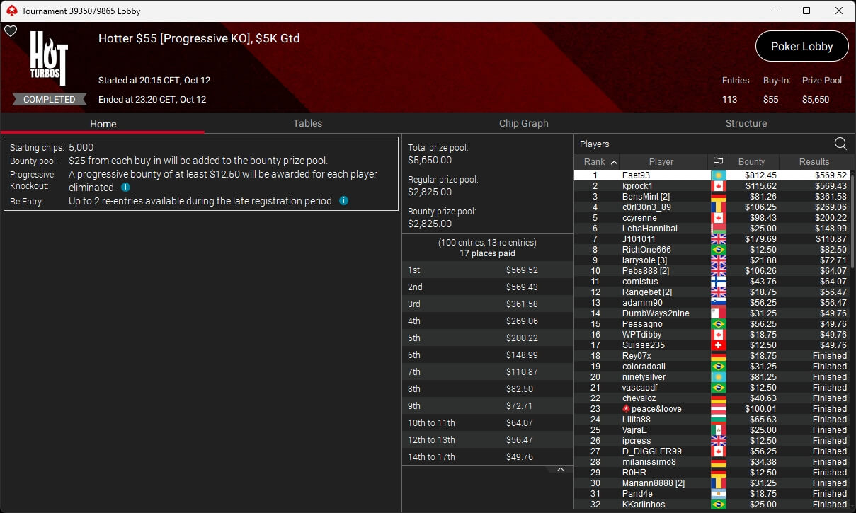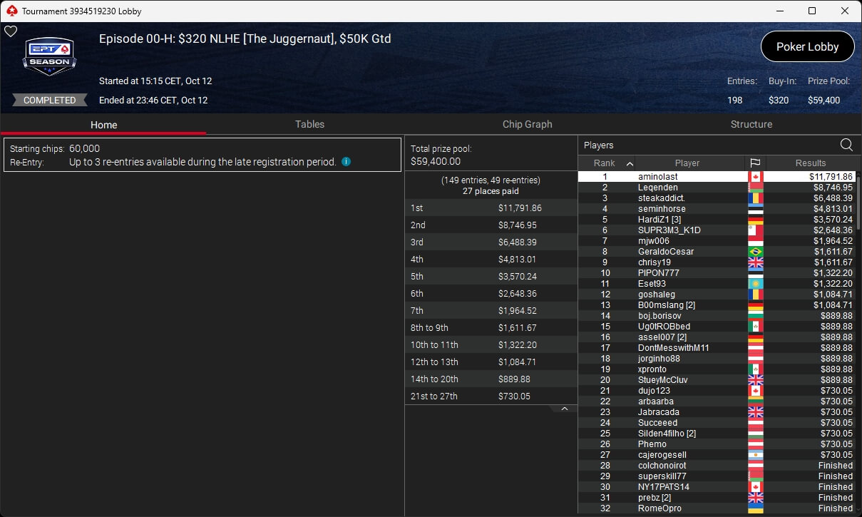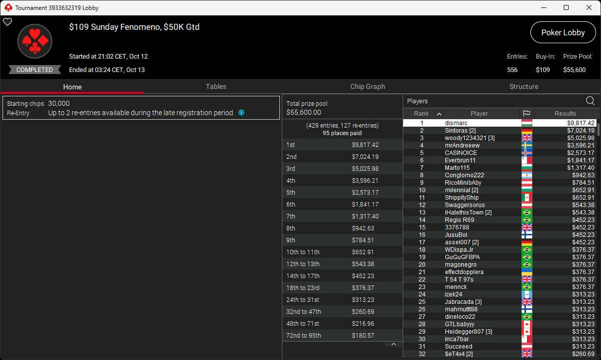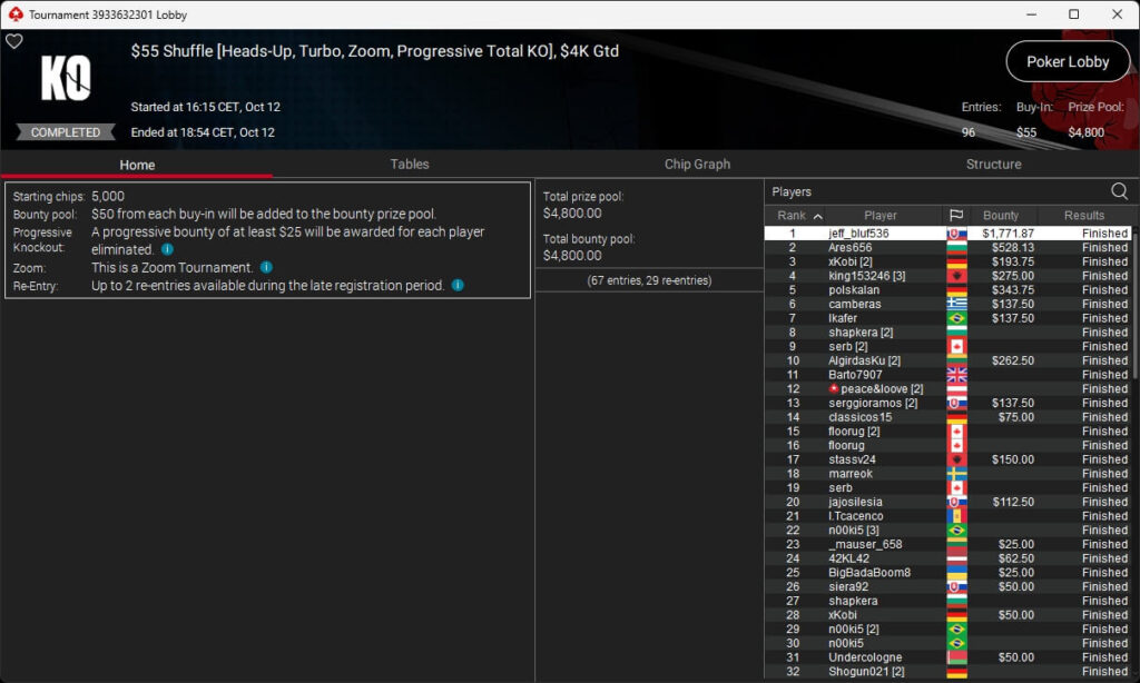 Bei den regulären Pokerturnieren verbuchte HardiZ1 im $1.050 Sunday Warm-Up ($16.714,50) sowie dem $215 Sunday Supersonic ($8.162,22) jeweils einen Sieg. INTL_JONES ($248,41 + $377) schlug im $55 Bounty Adrenaline zu.