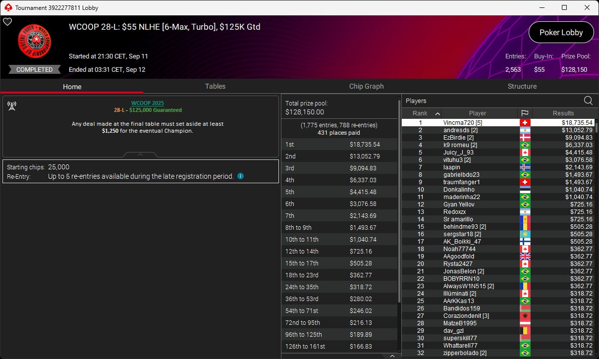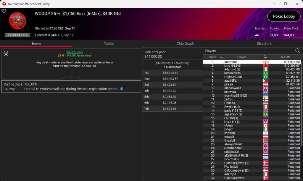 B00mslang aus Deutschland hat bei der PokerStars World Championship of Online Poker 2025 zwei Titel eingespielt. Ebenfalls WCOOP-Gold sicherte sich Vincma720 aus der Schweiz.