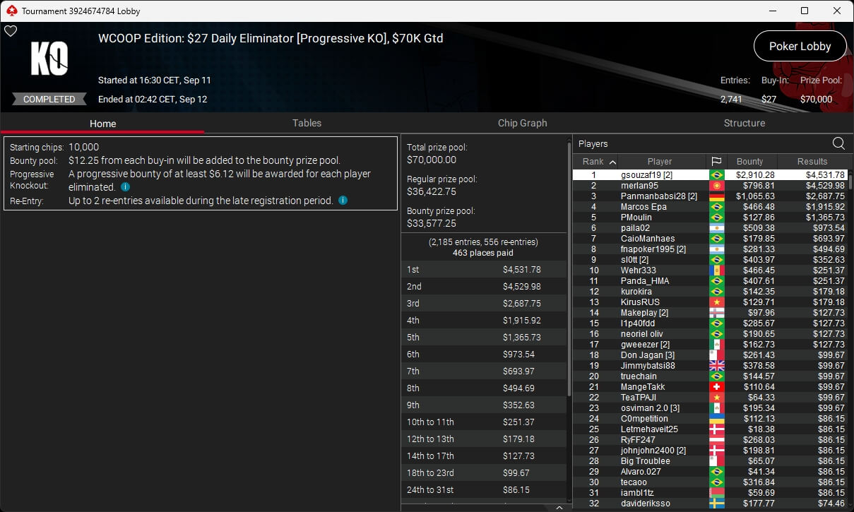 Knapp an einem Titel auf PokerStars vorbeigeschrammt sind dagegen SmileyODE (2./$18.853,22 + $4.601,70; $109 Mini Bounty Builder HR) sowie Schinken777 (2./$9.105,67 + $831,25; $109 NLHE Turbo PKO).