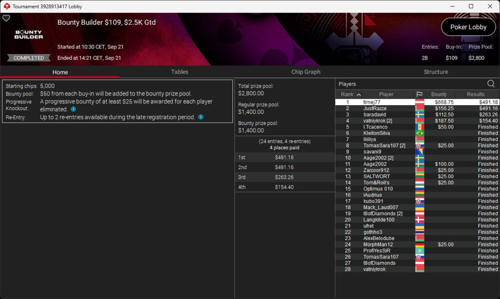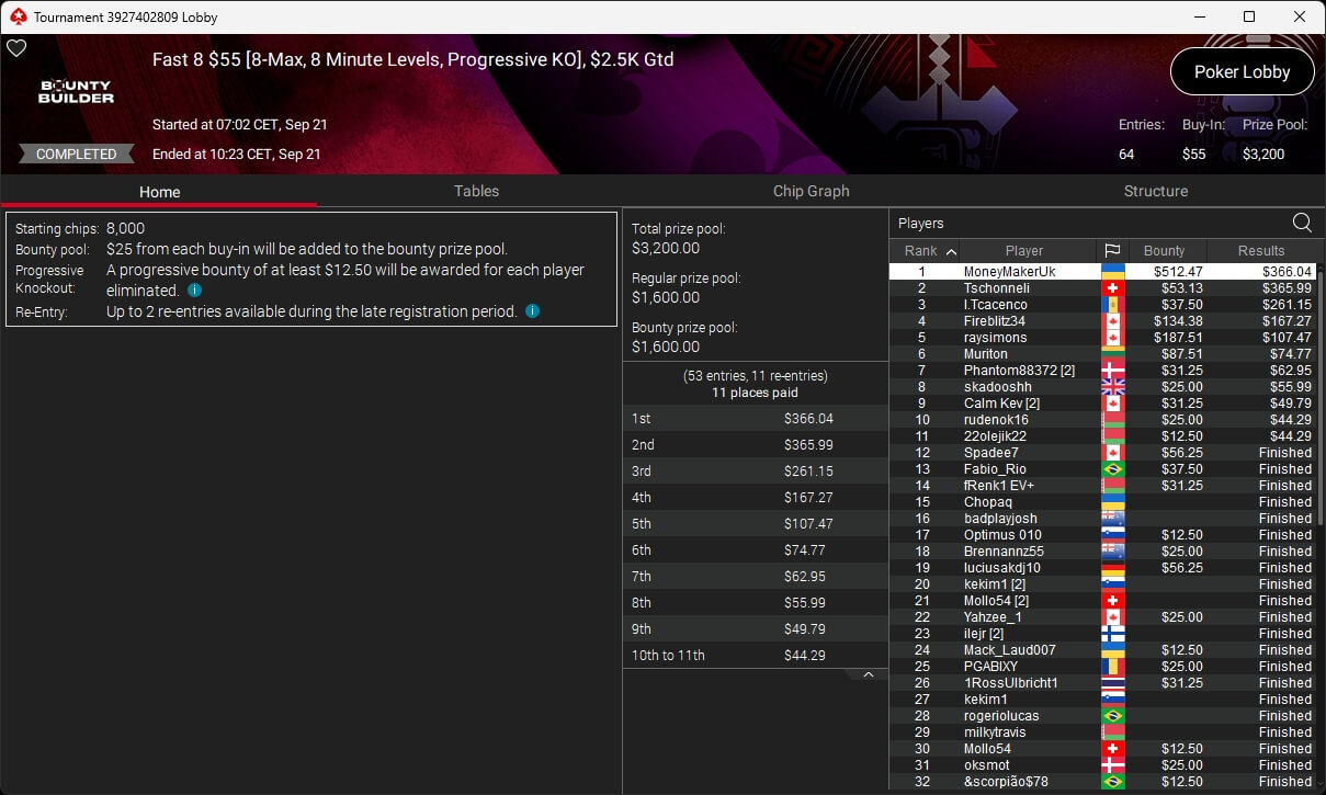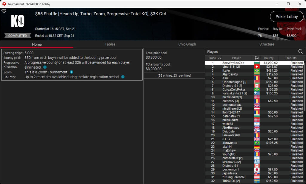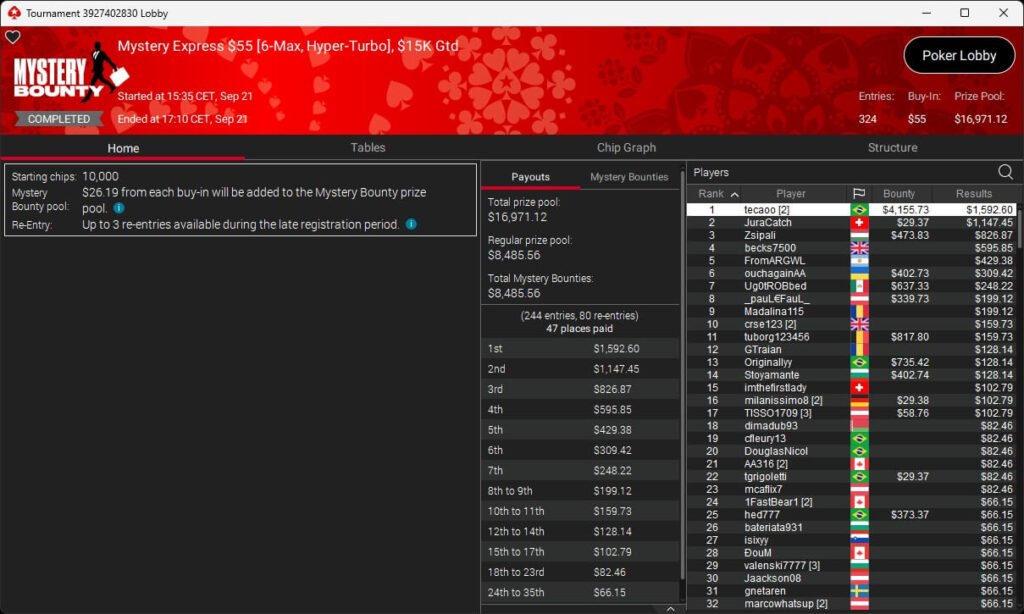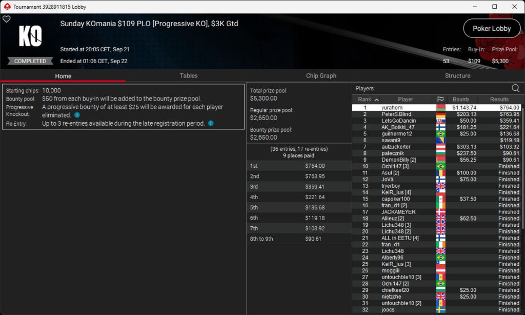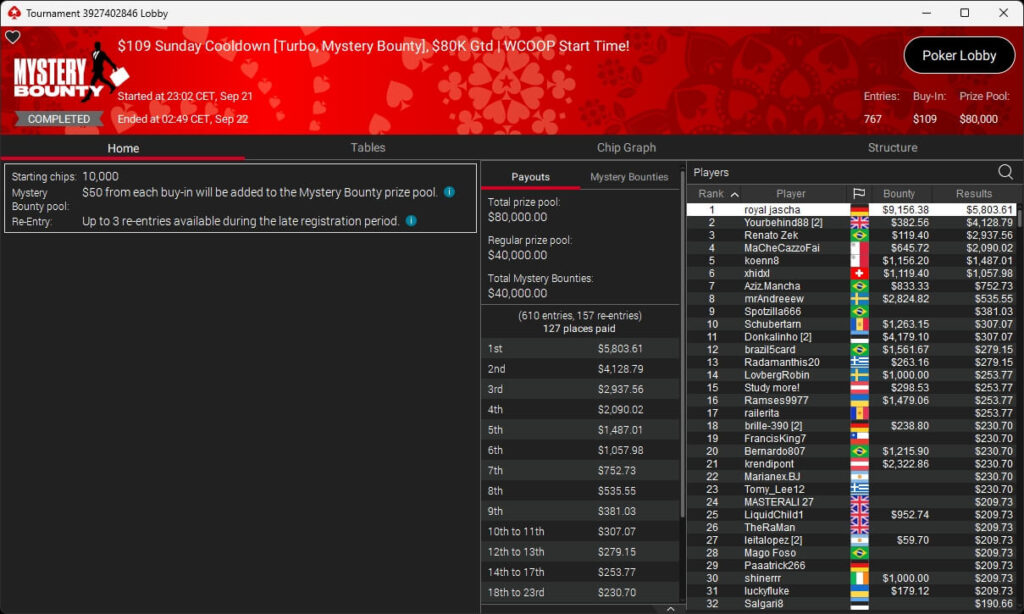 Auch bei den regulären MTTs gab es Turniersieger aus unseren Breitengraden. So sicherten sich royal jascha ($5.803,61 + $9.156,38; $109 Sunday Cooldown), RicoMiniAby ($8.202,36; $215 Sunday Supersonic), moneyymakerr ($418,19 + $618,74; $82 Bounty Builder) und timej77 ($491,18 + $668,75; $109 Bounty Builder) Titel.