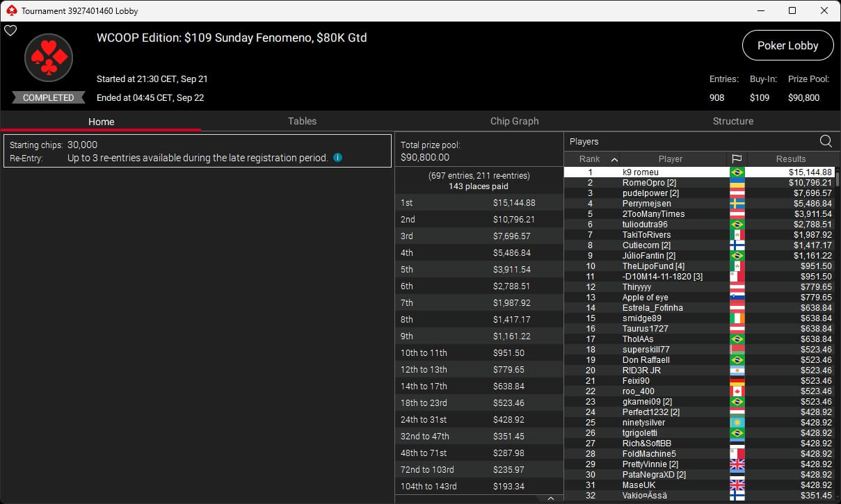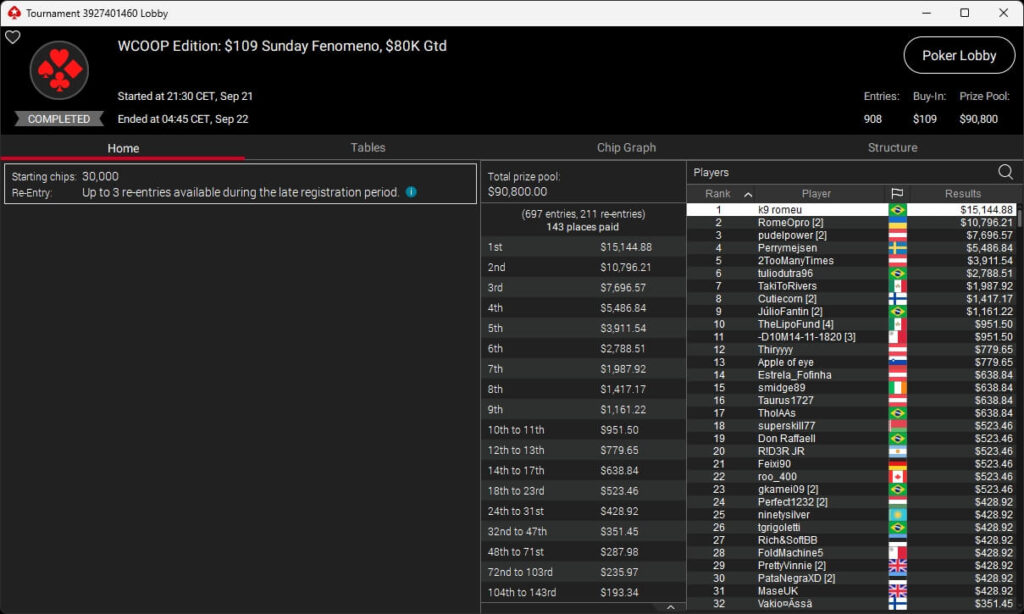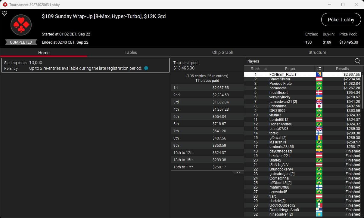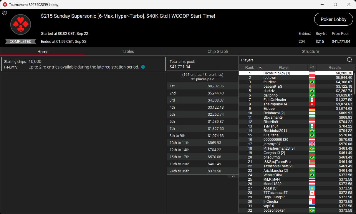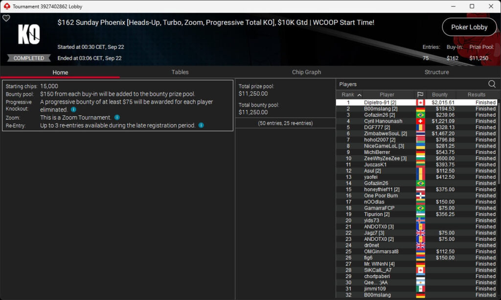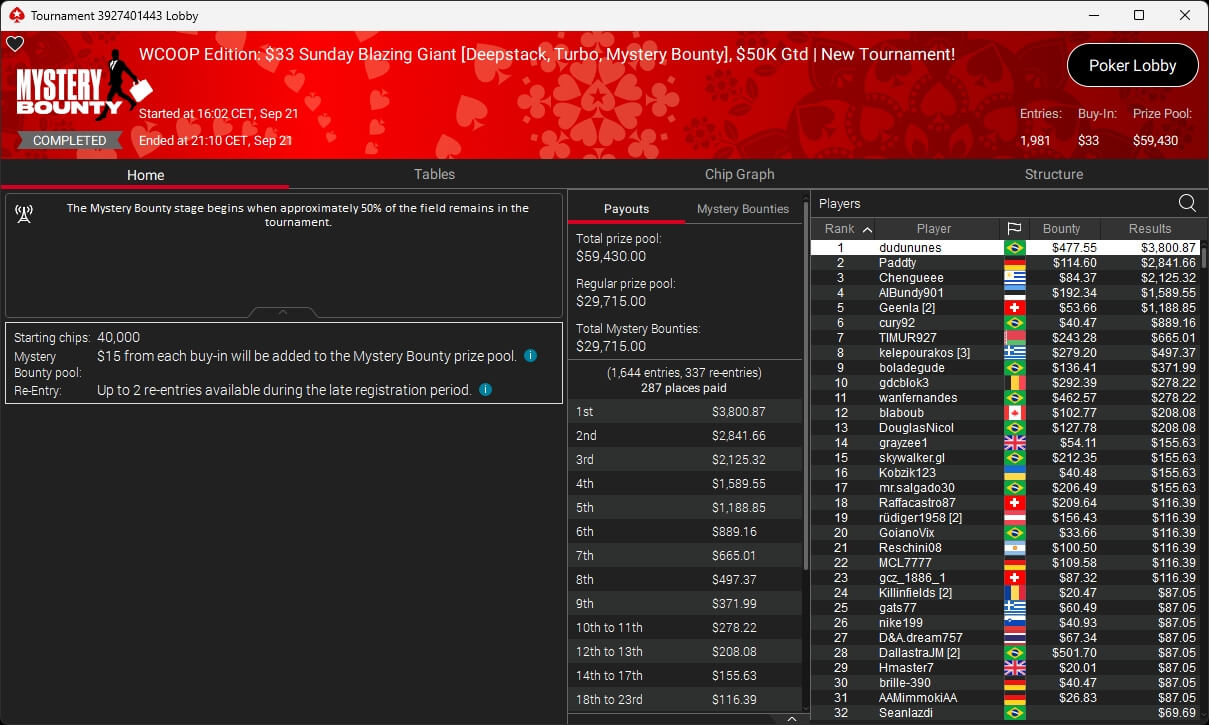 Auch bei den regulären MTTs gab es Turniersieger aus unseren Breitengraden. So sicherten sich royal jascha ($5.803,61 + $9.156,38; $109 Sunday Cooldown), RicoMiniAby ($8.202,36; $215 Sunday Supersonic), moneyymakerr ($418,19 + $618,74; $82 Bounty Builder) und timej77 ($491,18 + $668,75; $109 Bounty Builder) Titel.
