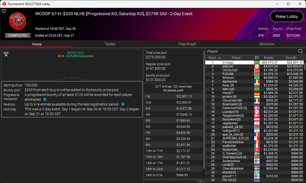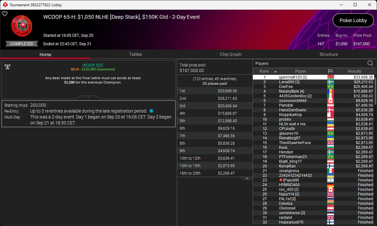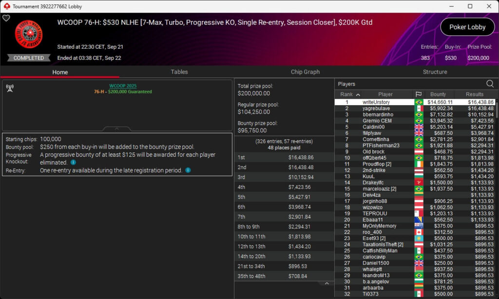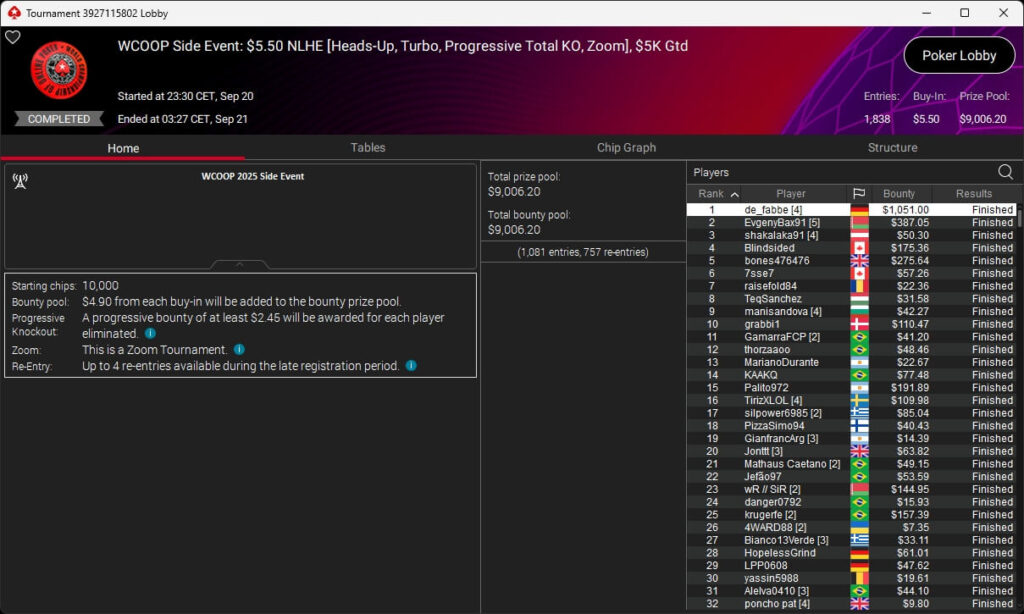 Bei der PokerStars World Championship of Online Poker 2025 spielte de_fabbe aus Deutschland einen Sieg bei den Side Events ein.