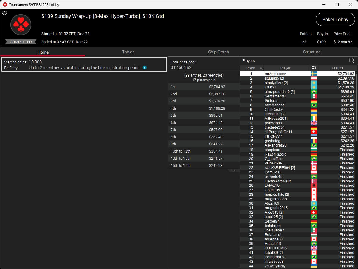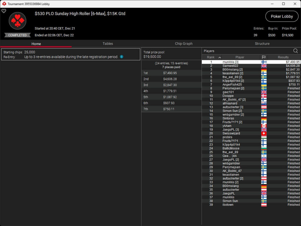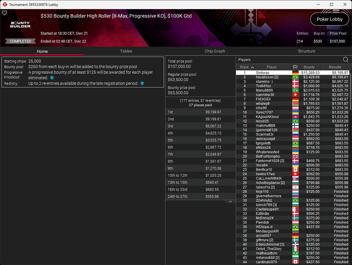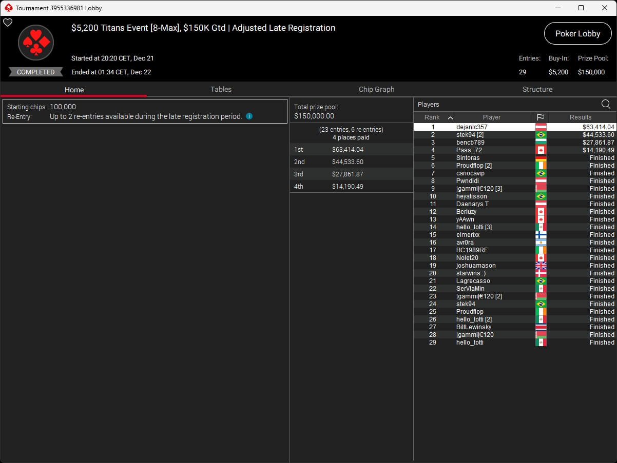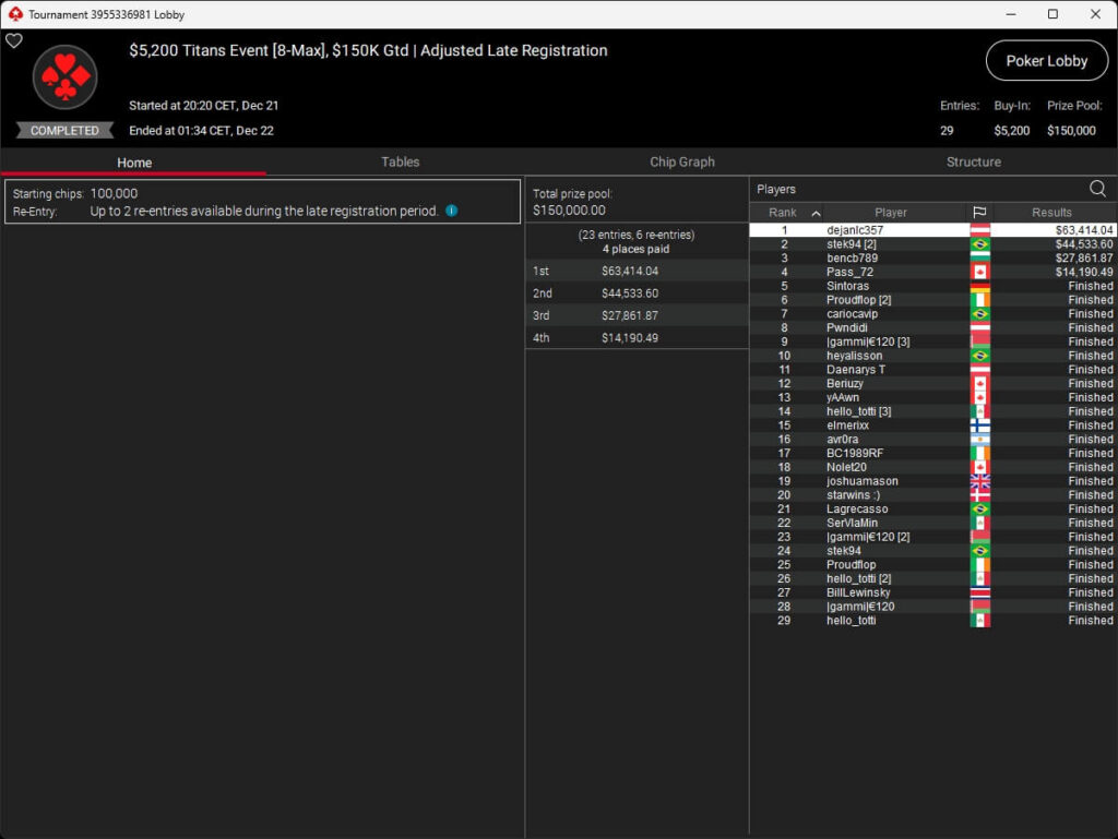 Im $5.200 Titans reichten 23 Spieler und sechs Re-Entries nicht, um die $150.000 GTD zu knacken. Sintoras erwischte es an der Money Bubble. Dejan „dejanlc357“ Kaladjurdjevic ($63.414,04) sicherte sich den Sieg. Das restliche Preisgeld ging an Iago „stek94“ Botelho (2./$44.533,60), Benjamin „bencb789“ Rolle (3./$27.861,87) sowie Pascal „Pass_72“ Lefrançois (4./$14.190,49).