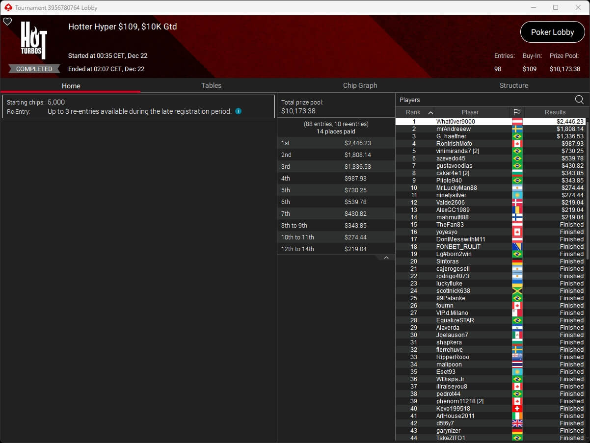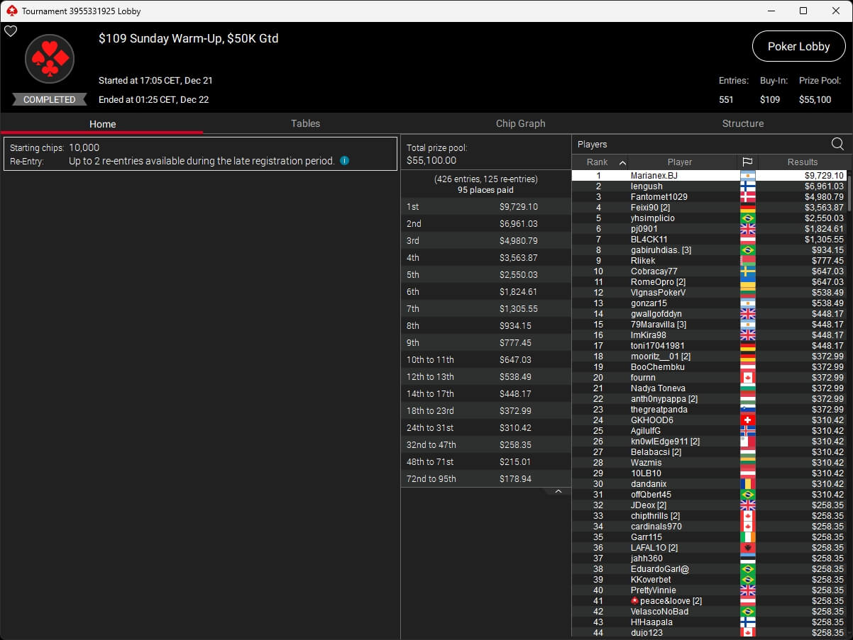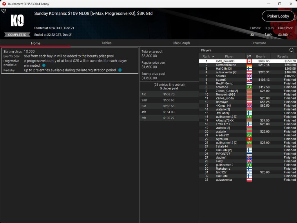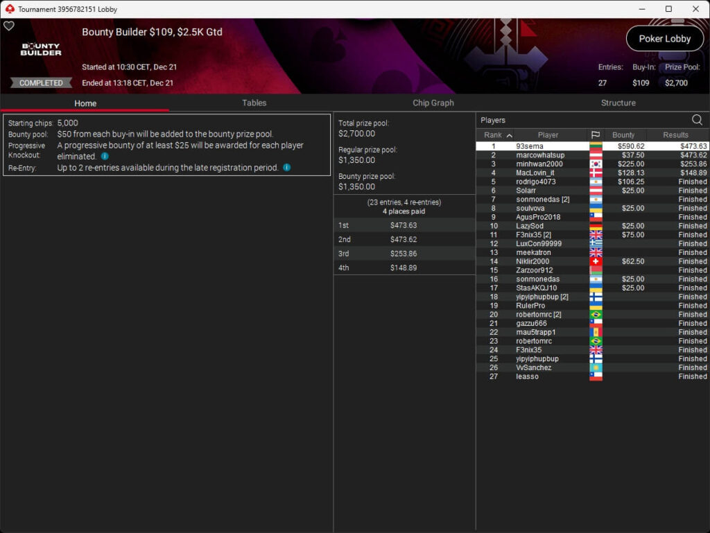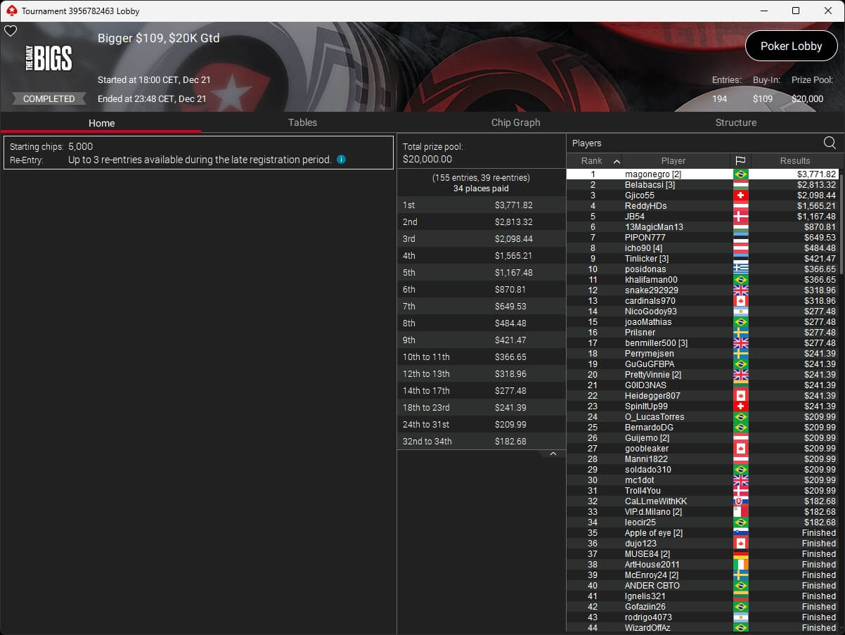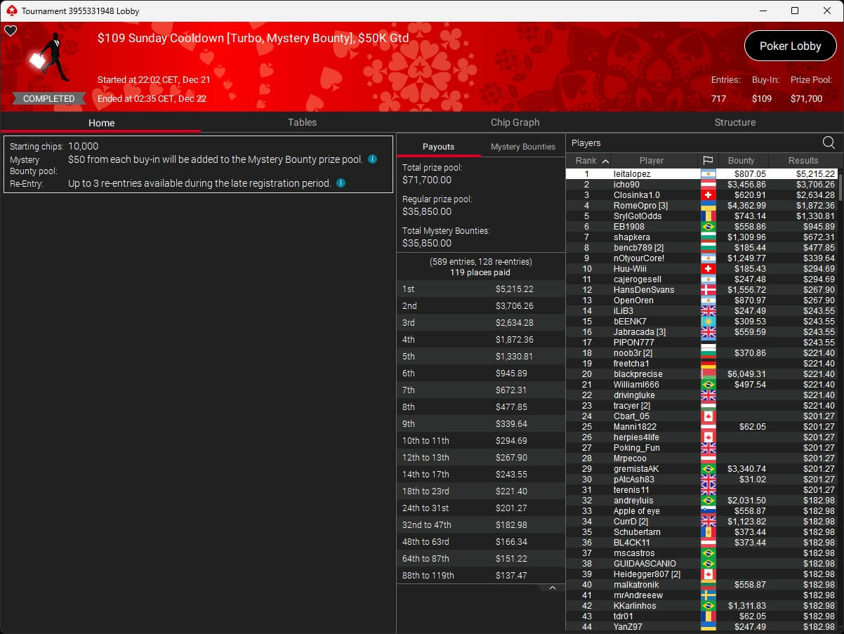 Im $5.200 Titans reichten 23 Spieler und sechs Re-Entries nicht, um die $150.000 GTD zu knacken. Sintoras erwischte es an der Money Bubble. Dejan „dejanlc357“ Kaladjurdjevic ($63.414,04) sicherte sich den Sieg. Das restliche Preisgeld ging an Iago „stek94“ Botelho (2./$44.533,60), Benjamin „bencb789“ Rolle (3./$27.861,87) sowie Pascal „Pass_72“ Lefrançois (4./$14.190,49).