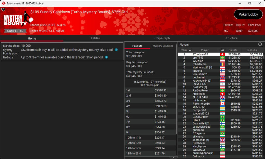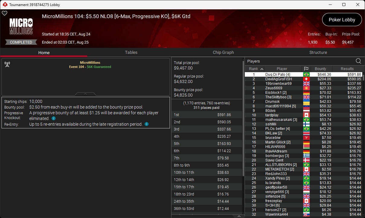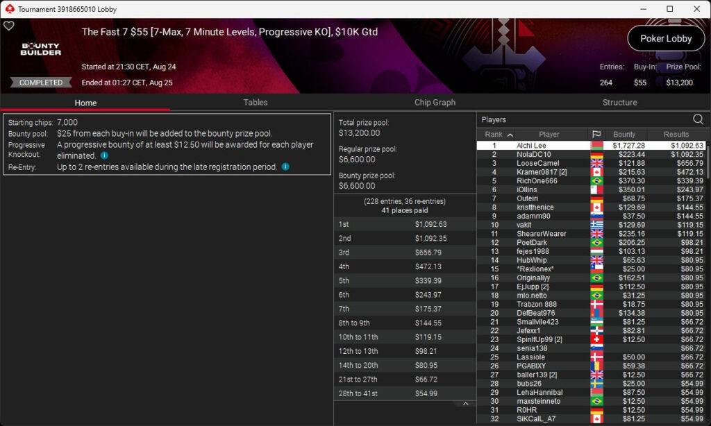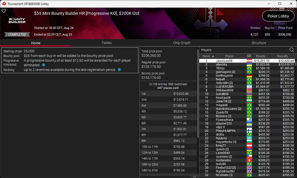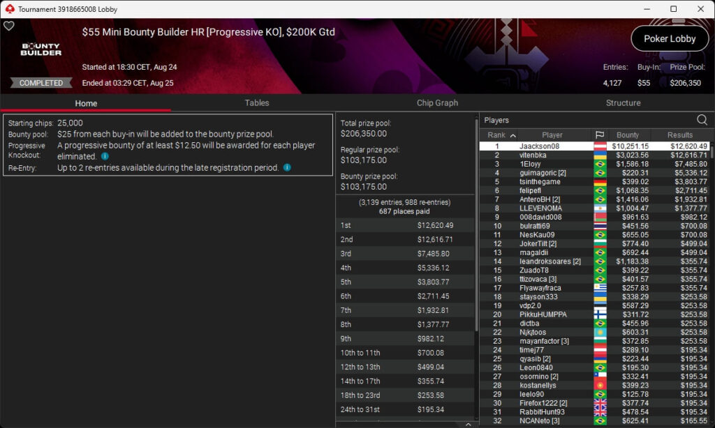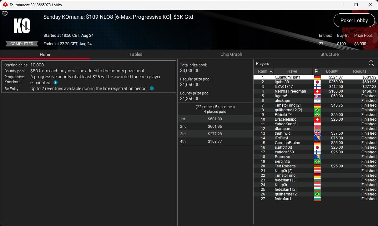 Zu den weiteren Gewinnern gehörten Jaackson08 ($12.620,49 + $10.251,15; $55 Mini Bounty Builder HR), Gil27Ds ($3.771,82; $109 Bigger), 2Thebrain82 ($5.578,92 + $2.518,48; $109 Sunday Cooldown), maabibi ($6.344,35; $215 Sunday Supersonic), Ariiistooos ($1.819,68 + $2.142,17; $82 Sunday Hyper 7), Luj0_1989 ($515,99 + $687,50; $109 Pacific Rim Special) sowie QuantumFish1 ($601,99 + $521,87; $109 NLO8 Sunday KOmania).