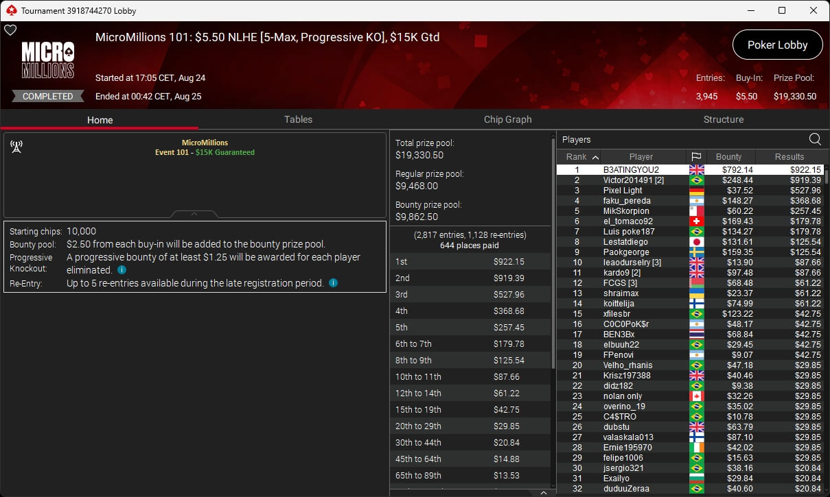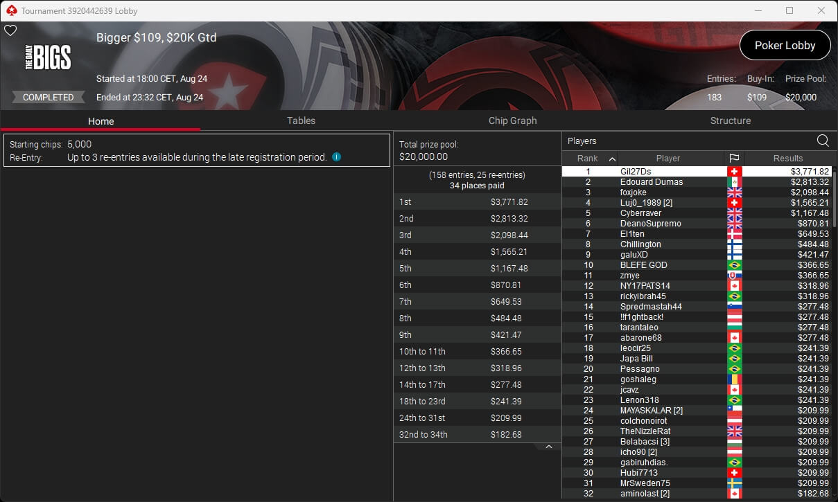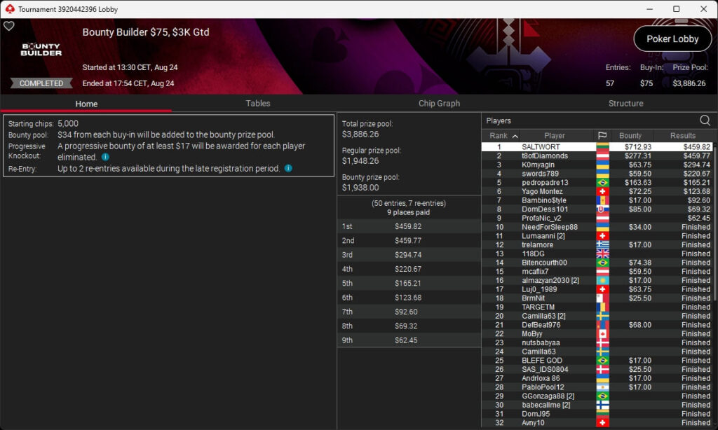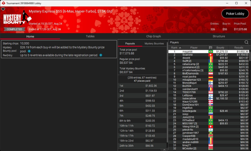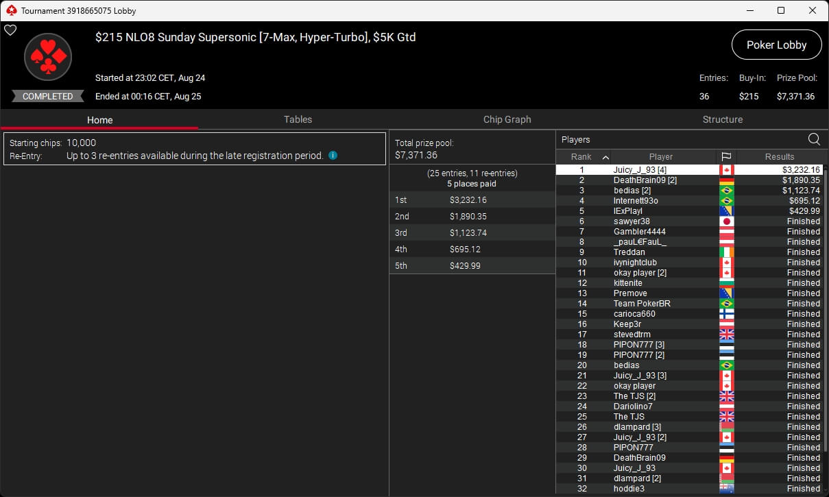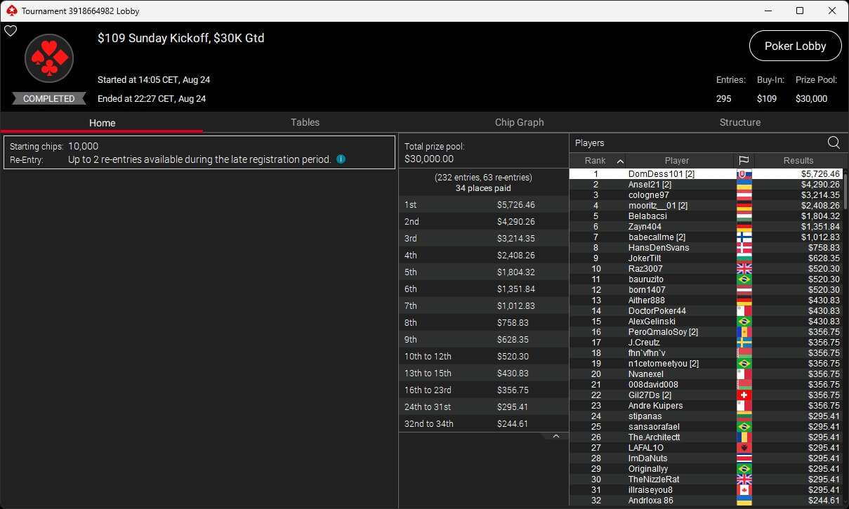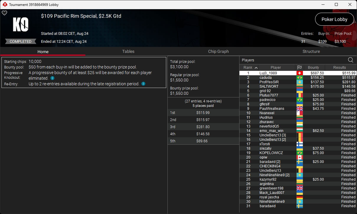 Zu den weiteren Gewinnern gehörten Jaackson08 ($12.620,49 + $10.251,15; $55 Mini Bounty Builder HR), Gil27Ds ($3.771,82; $109 Bigger), 2Thebrain82 ($5.578,92 + $2.518,48; $109 Sunday Cooldown), maabibi ($6.344,35; $215 Sunday Supersonic), Ariiistooos ($1.819,68 + $2.142,17; $82 Sunday Hyper 7), Luj0_1989 ($515,99 + $687,50; $109 Pacific Rim Special) sowie QuantumFish1 ($601,99 + $521,87; $109 NLO8 Sunday KOmania).