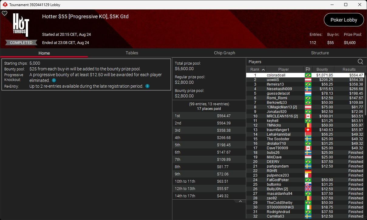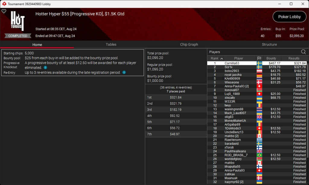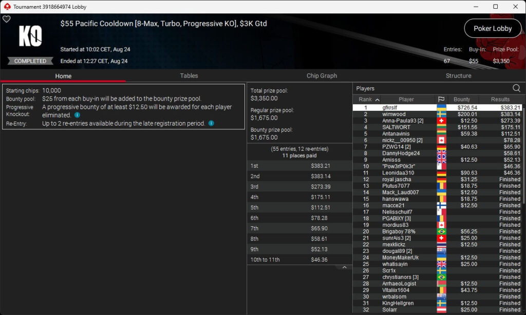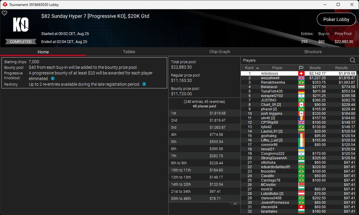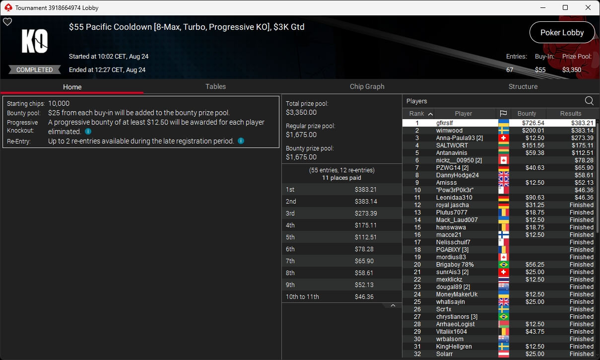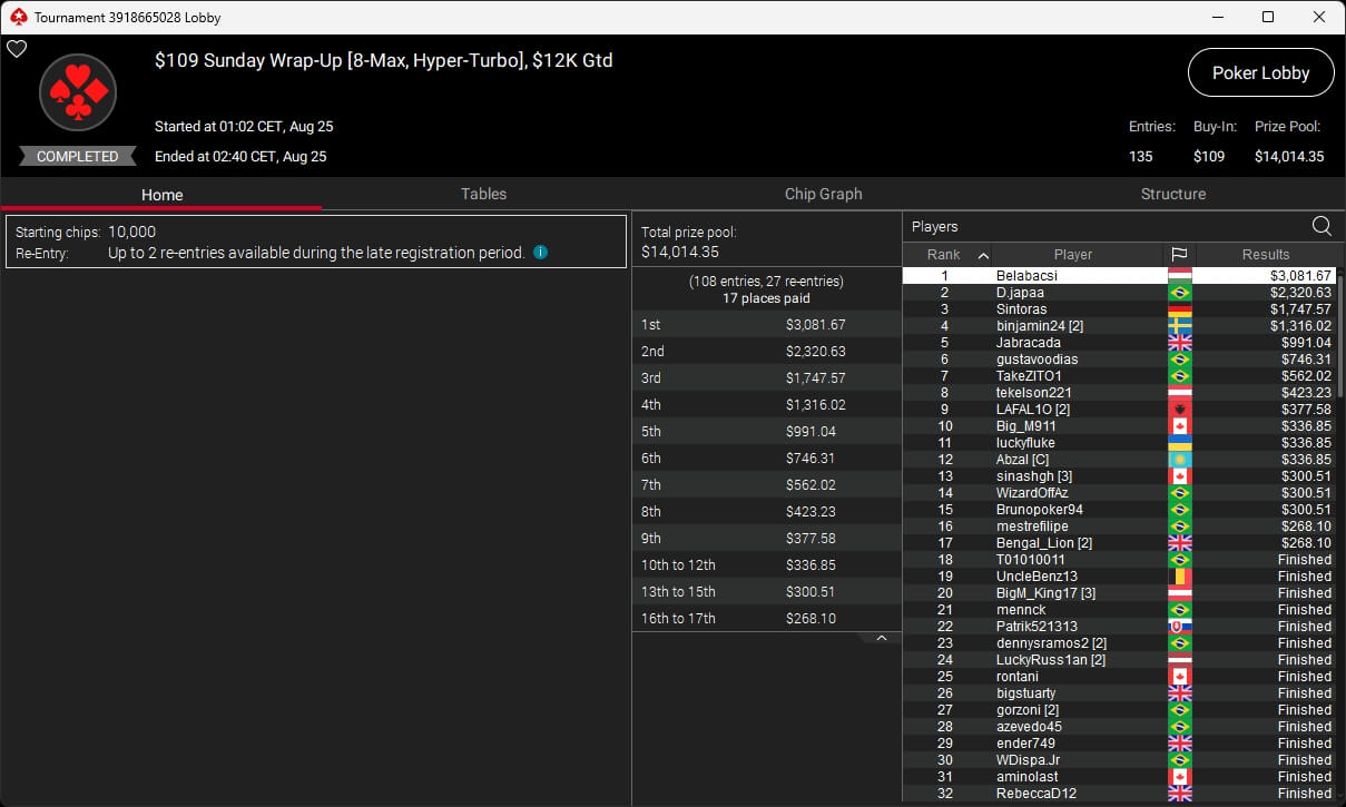 Zu den weiteren Gewinnern gehörten Jaackson08 ($12.620,49 + $10.251,15; $55 Mini Bounty Builder HR), Gil27Ds ($3.771,82; $109 Bigger), 2Thebrain82 ($5.578,92 + $2.518,48; $109 Sunday Cooldown), maabibi ($6.344,35; $215 Sunday Supersonic), Ariiistooos ($1.819,68 + $2.142,17; $82 Sunday Hyper 7), Luj0_1989 ($515,99 + $687,50; $109 Pacific Rim Special) sowie QuantumFish1 ($601,99 + $521,87; $109 NLO8 Sunday KOmania).