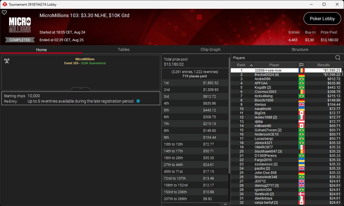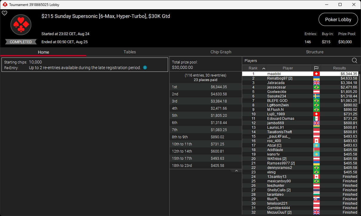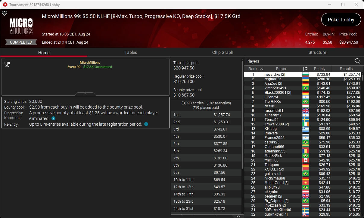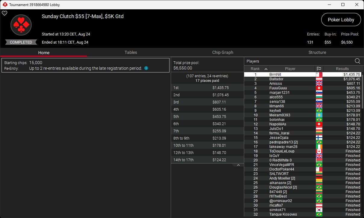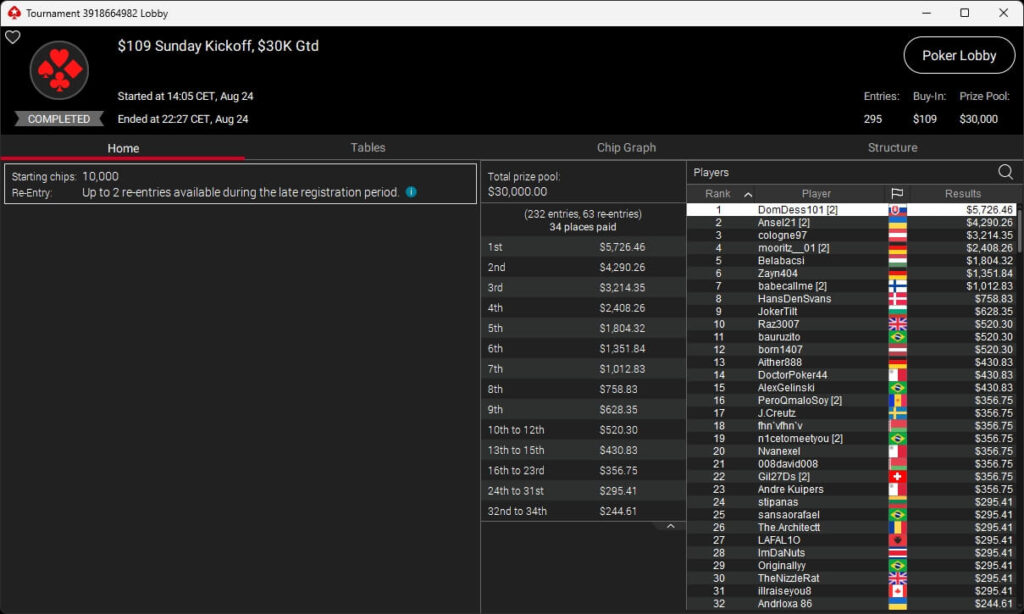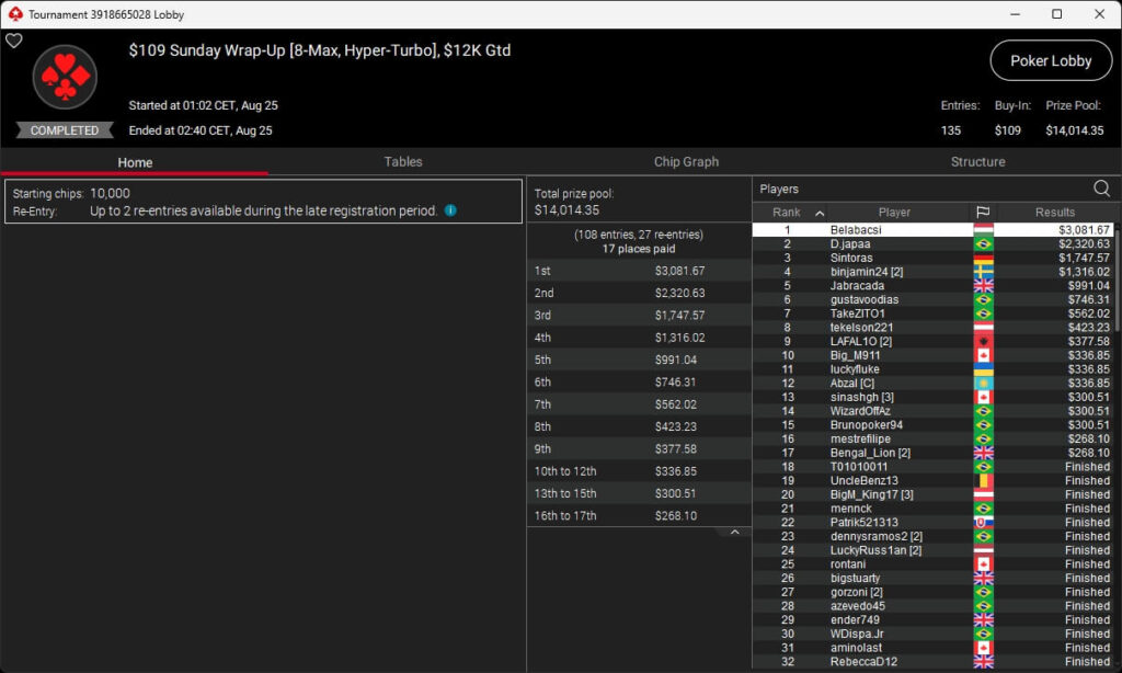Zu den weiteren Gewinnern gehörten Jaackson08 ($12.620,49 + $10.251,15; $55 Mini Bounty Builder HR), Gil27Ds ($3.771,82; $109 Bigger), 2Thebrain82 ($5.578,92 + $2.518,48; $109 Sunday Cooldown), maabibi ($6.344,35; $215 Sunday Supersonic), Ariiistooos ($1.819,68 + $2.142,17; $82 Sunday Hyper 7), Luj0_1989 ($515,99 + $687,50; $109 Pacific Rim Special) sowie QuantumFish1 ($601,99 + $521,87; $109 NLO8 Sunday KOmania).