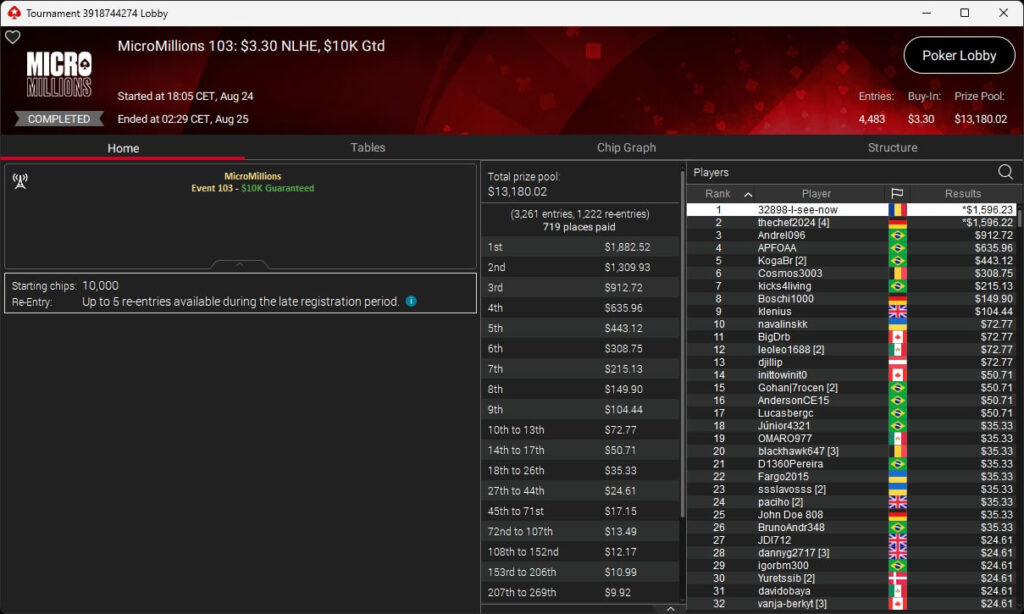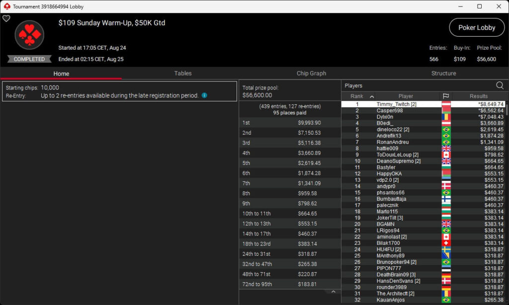 Der zweite Sonntag bei den MicroMillions 2025 sollte keinen Sieg für die deutschsprachige Poker-Community bringen. Besser lief es bei den regulären MTTs auf PokerStars. Tim „Timmy_Twitch“ Krämer ($8.649,74) setzte sich im $109 Sunday Warm-Up durch.