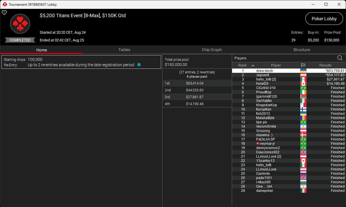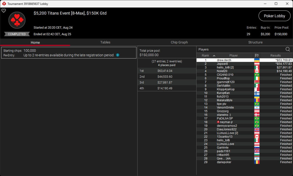 Im $5.200 Titans Event reichten 27 Teilnehmer und zwei Re-Entries nicht aus, um die $150.000 GTD zu knacken. Nach HU-Deal setzte sich drew.derzh ($53.769,81) durch. Arsenii „hello_totti“ Malinov (3./$27.861,87) und Guillaume „Nolet20“ Nolet (4./$14.190,49) sicherten sich ebenfalls einen Cash.