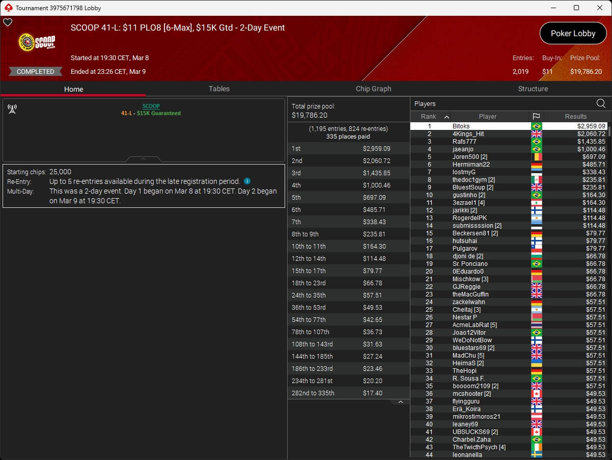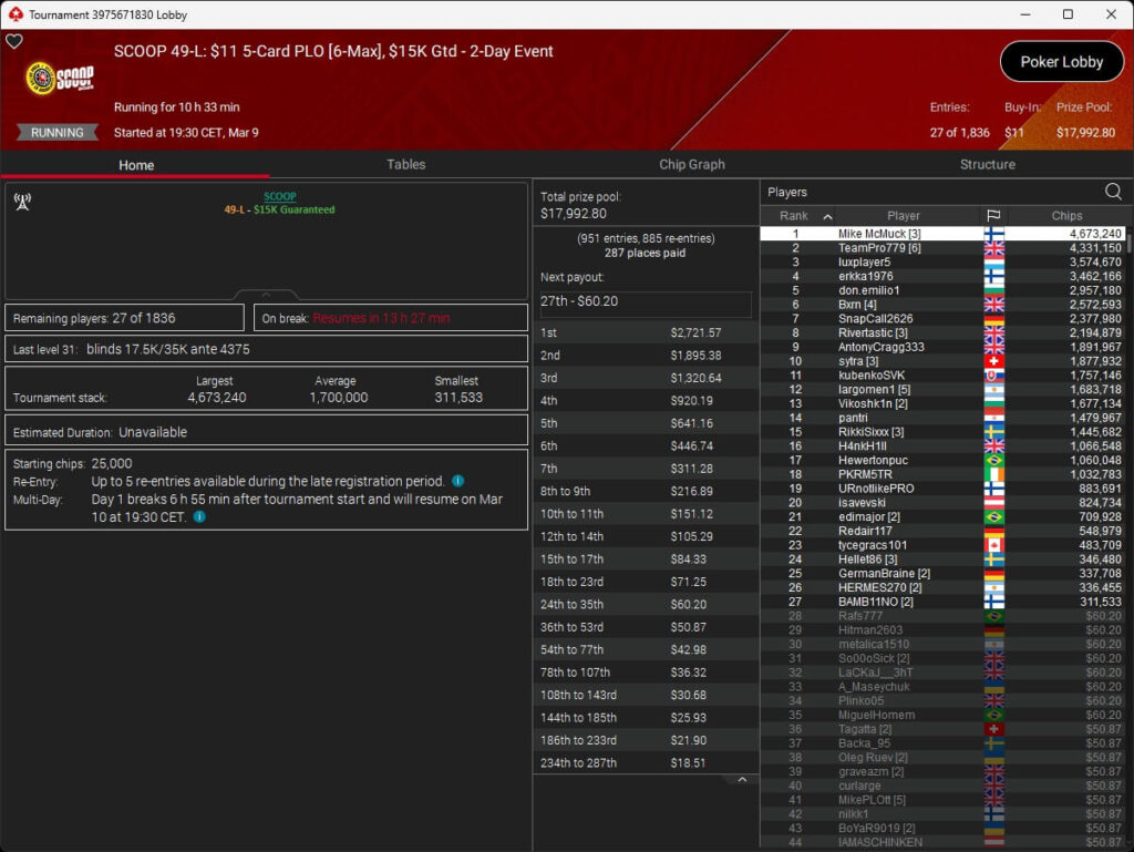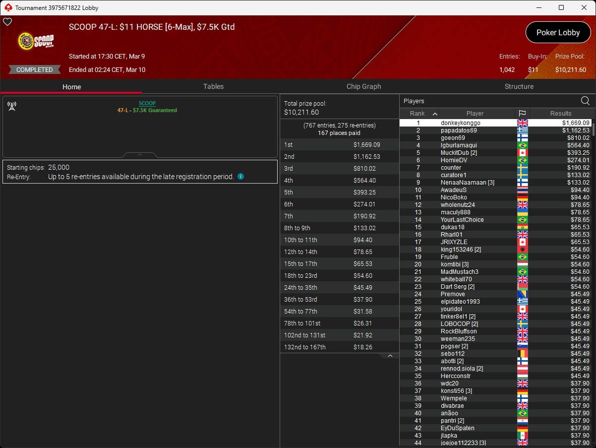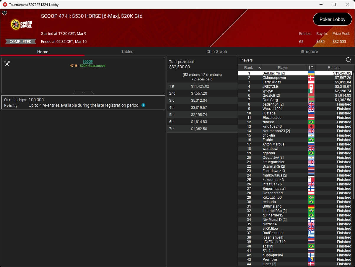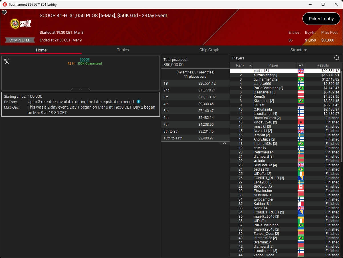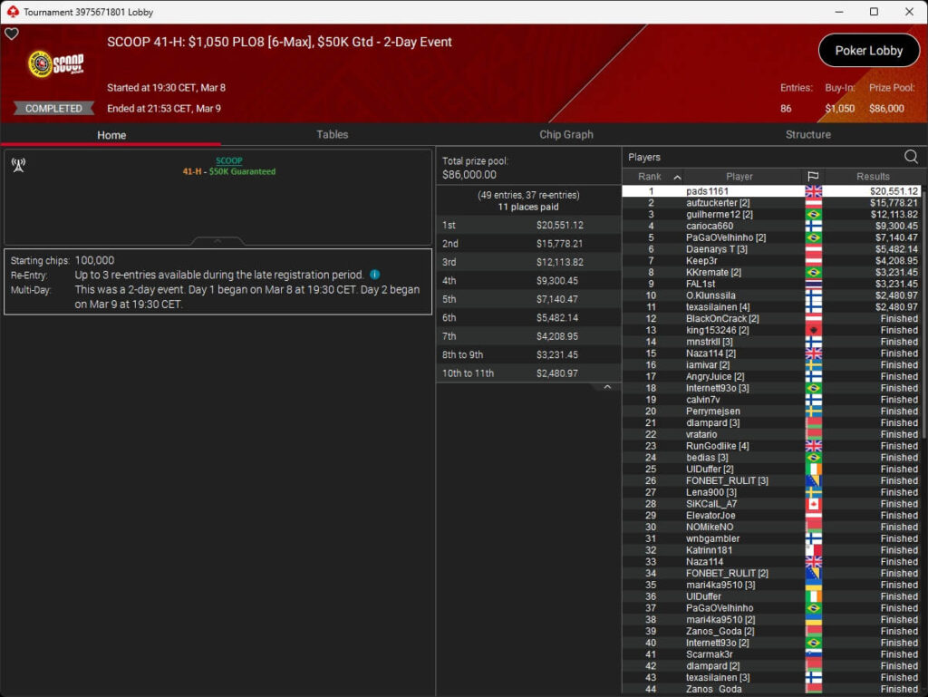 Ebenfalls knapp an einem SCOOP-Titel vorbeigeschrammt ist aufzuckerter, der sich im $1.050 PLO8 6-Max nur Patrick „pads1161“ Leonard ($20.551,12) geschlagen geben musste. Als Runner-Up kassierte aufzuckerter $15.778,21 Preisgeld.