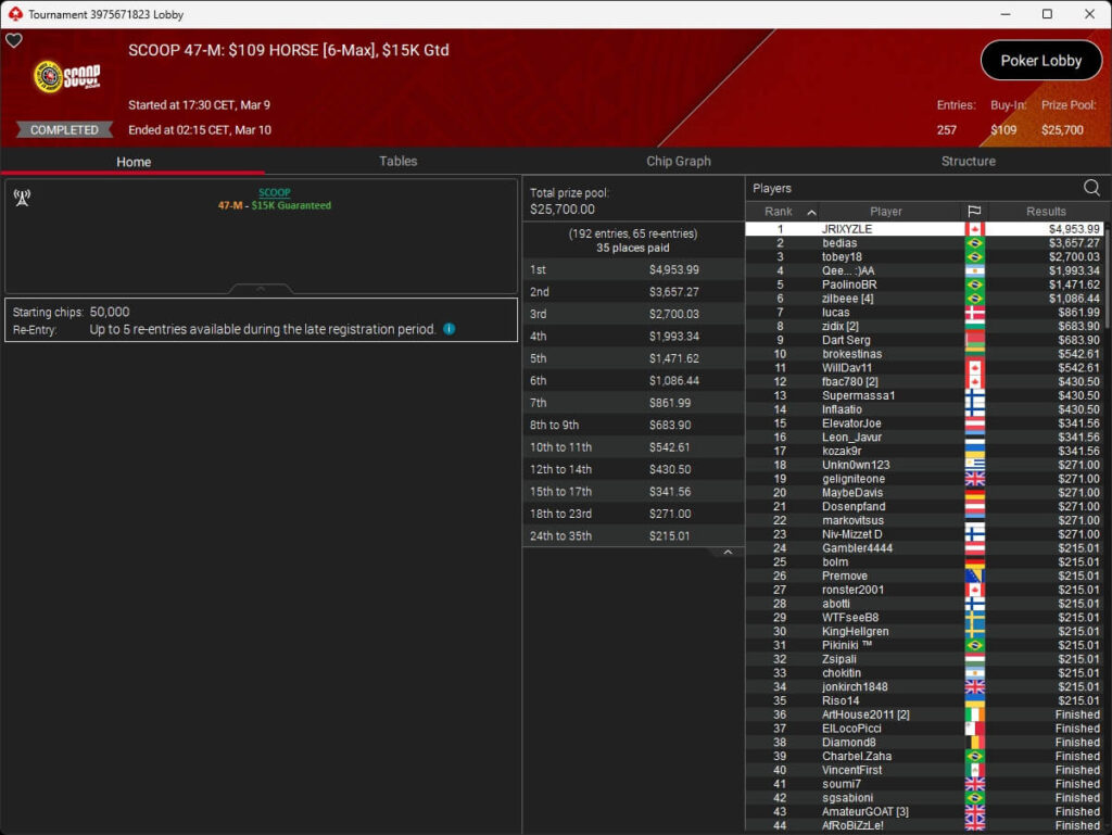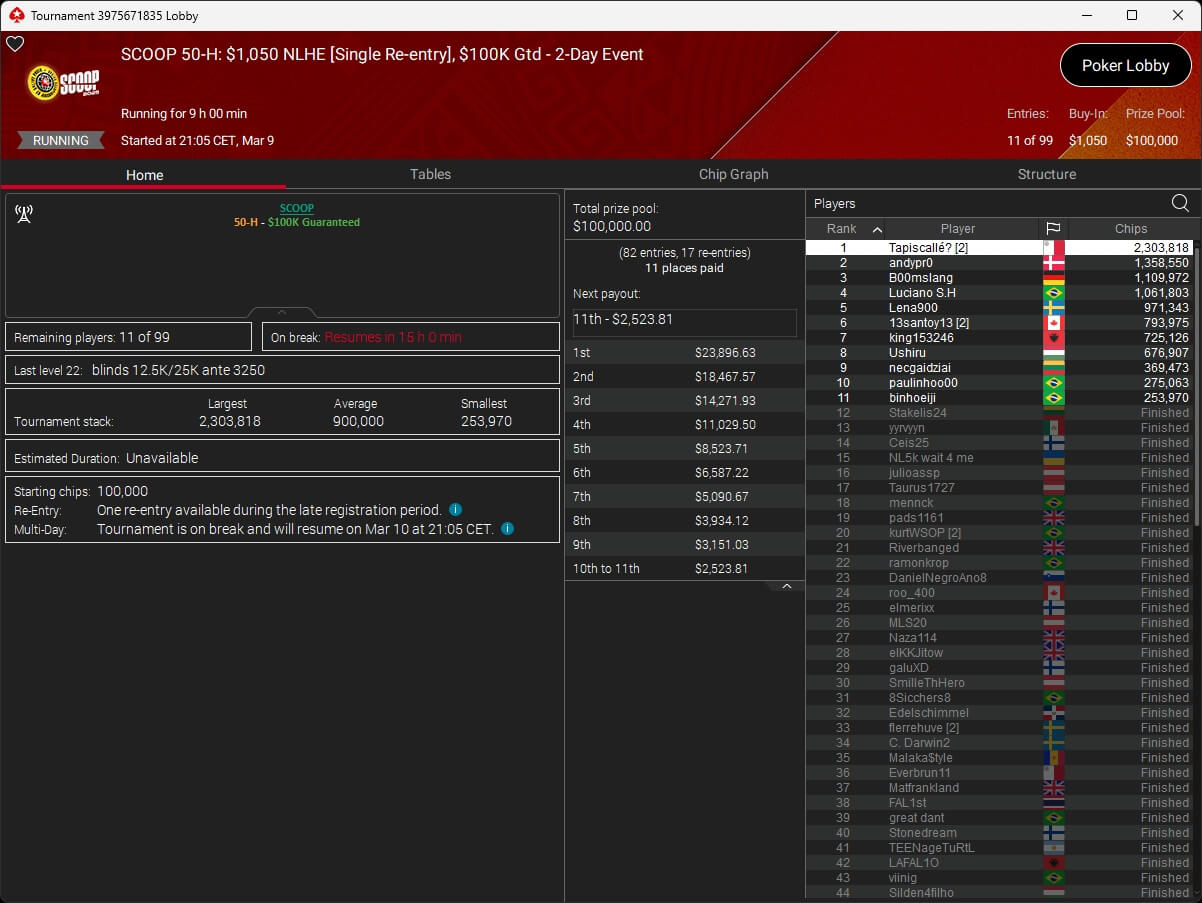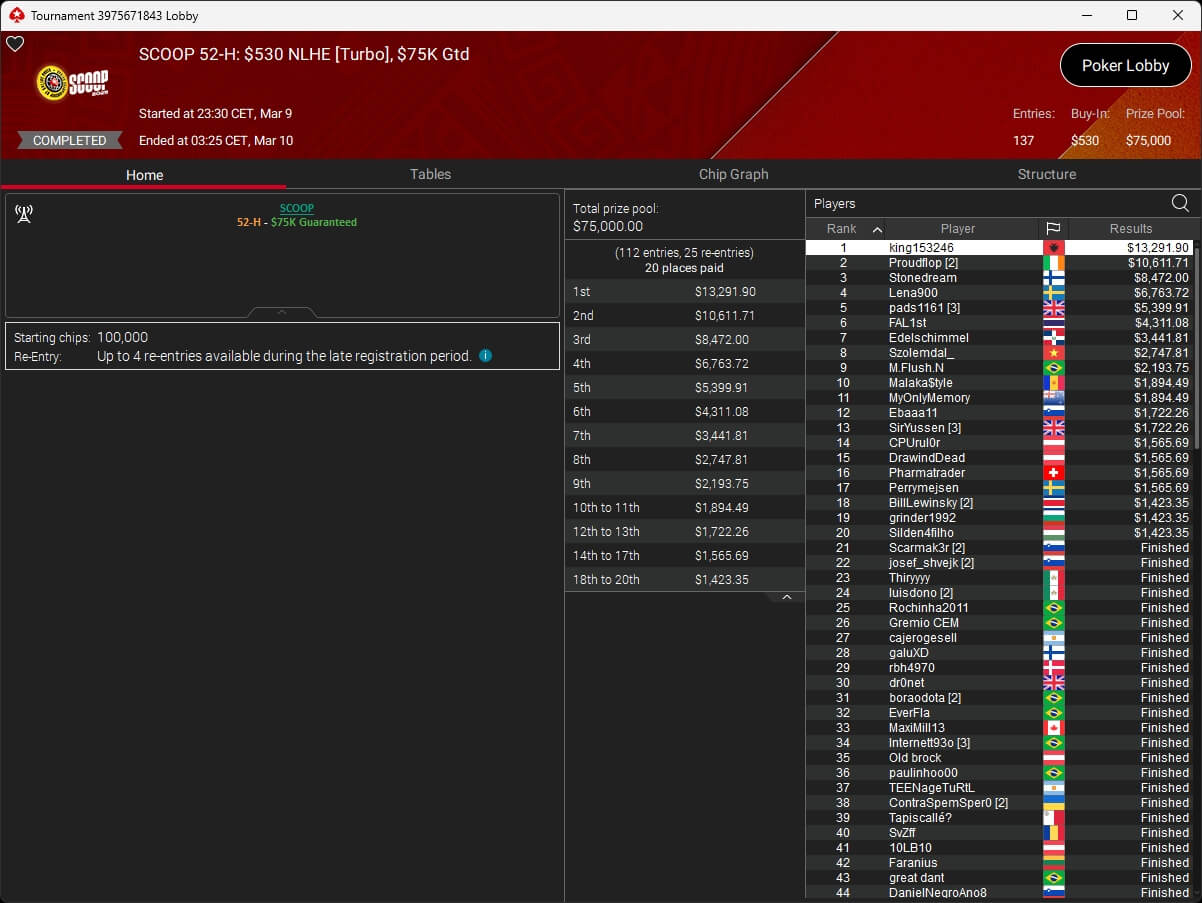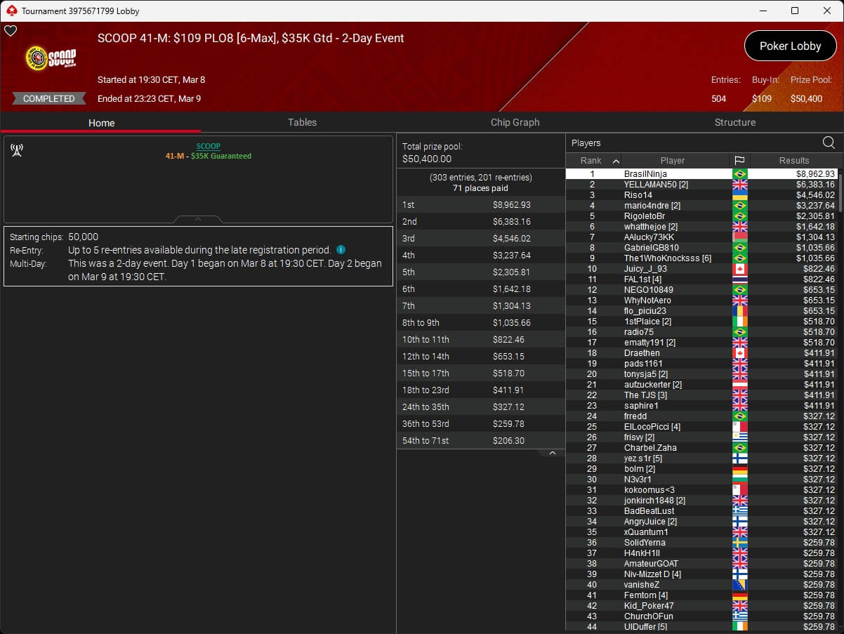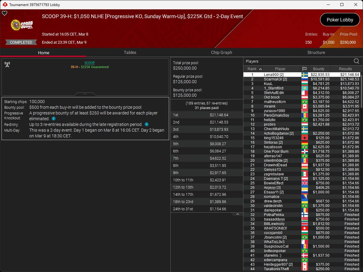 Ebenfalls knapp an einem SCOOP-Titel vorbeigeschrammt ist aufzuckerter, der sich im $1.050 PLO8 6-Max nur Patrick „pads1161“ Leonard ($20.551,12) geschlagen geben musste. Als Runner-Up kassierte aufzuckerter $15.778,21 Preisgeld.