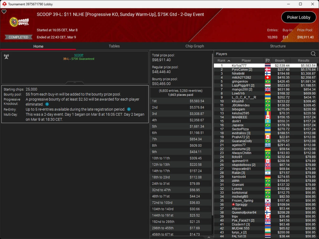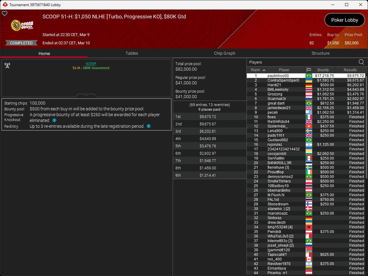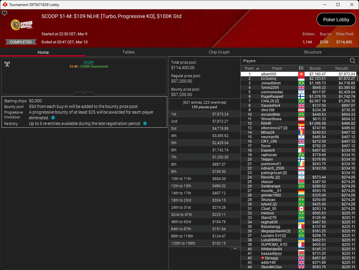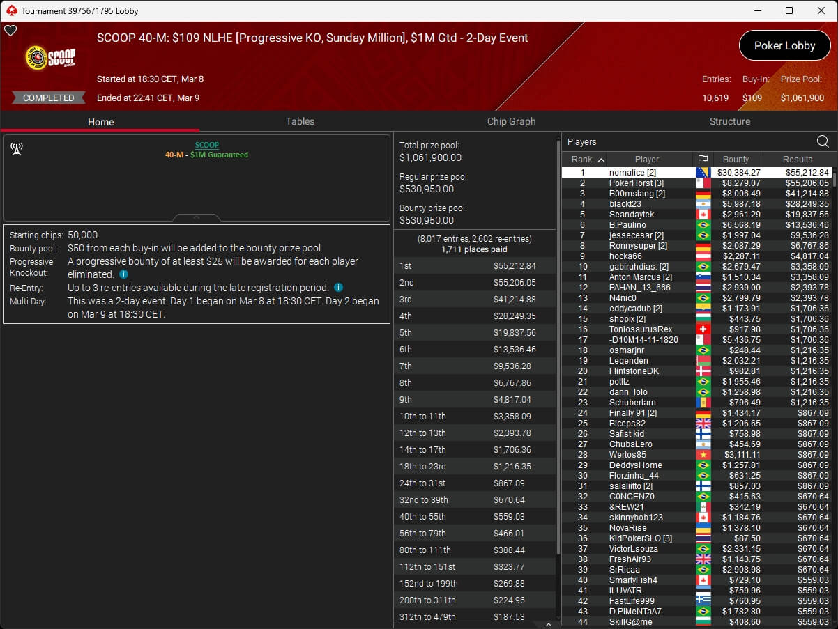 Zum $109 Sunday Million PKO kehrten 141 Spieler auf PokerStars zurück. B00mslang ($41.214,88 + $8.006,49) startete mit der Führung und beendete das Event auf Rang 3. Im Heads-Up setzte sich nomalice ($55.212,84 + $30.384,27) aus Bosnien gegen den Wahlmalteser PokerHorst ($55.206,05 + $8.279,07) durch.