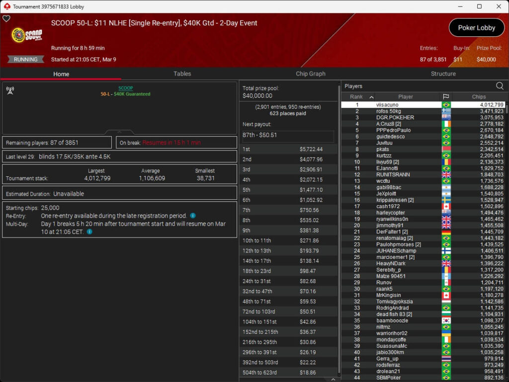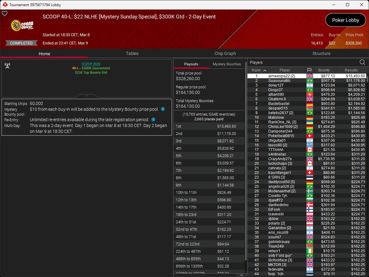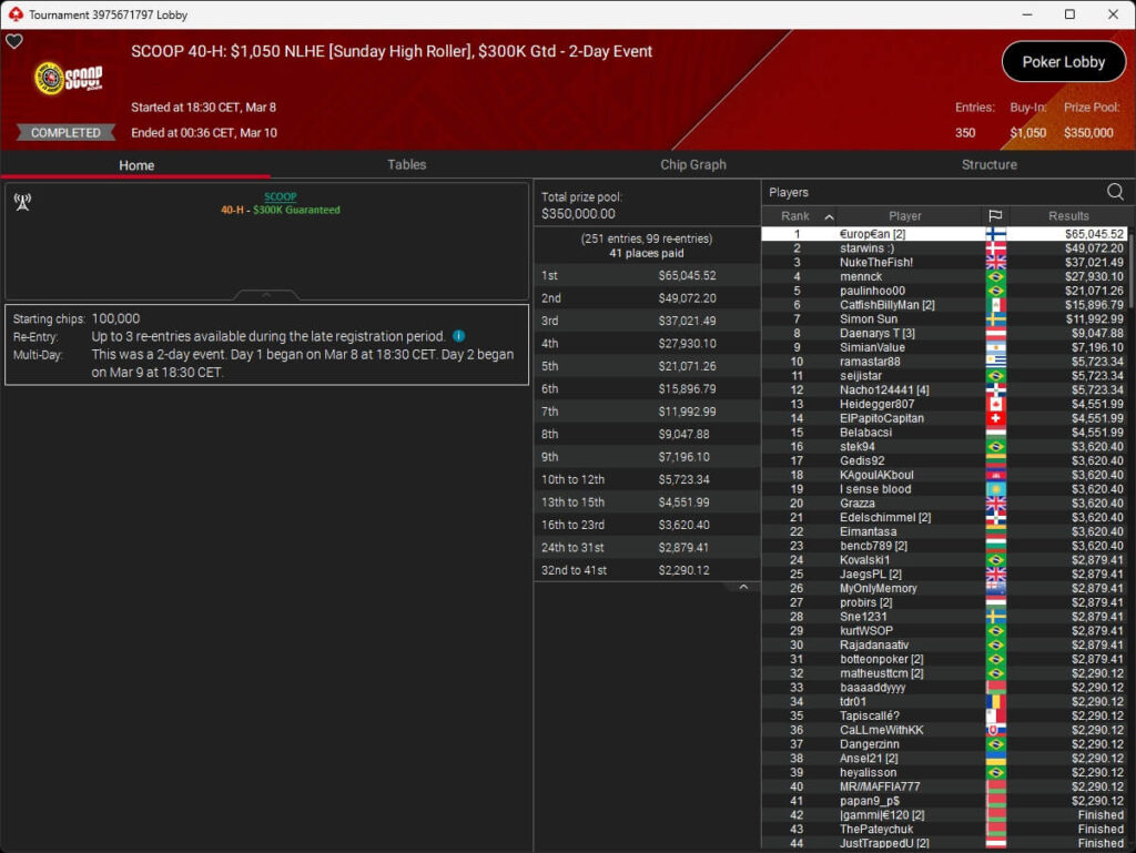 Sam „€urop€an“ Vousden hat bei der PokerStars Spring Championship of Online Poker 2026 das Sunday High Roller gewonnen. Im Sunday Million schrammten PokerHorst und B00mslang knapp an SCOOP-Gold vorbei.